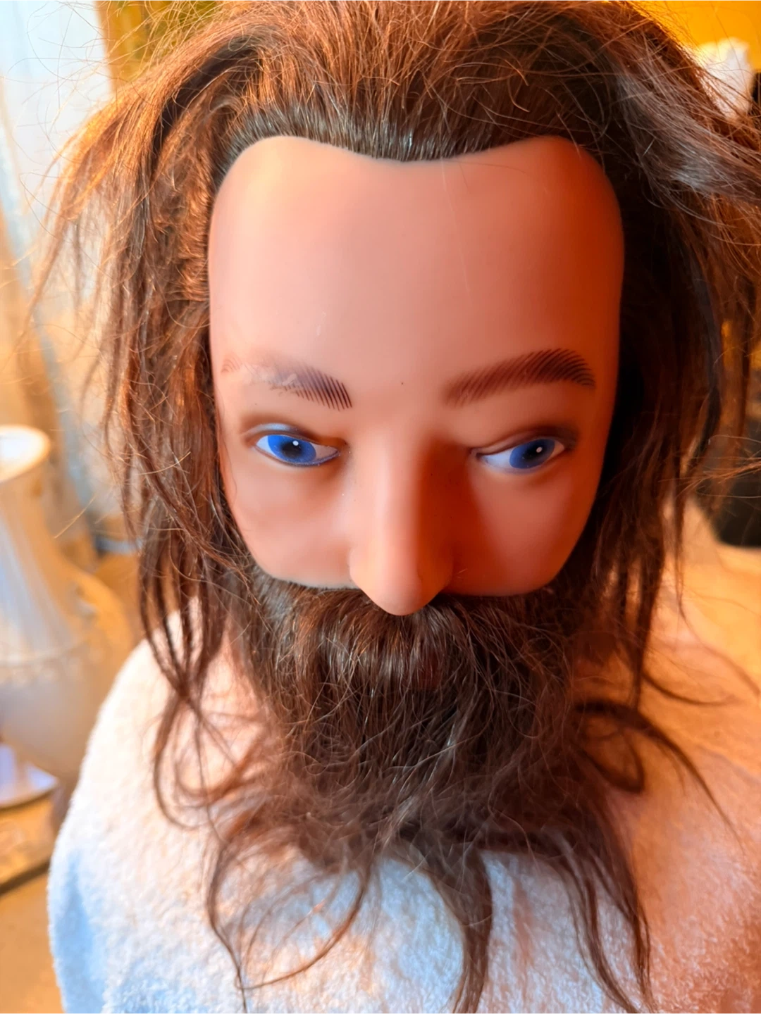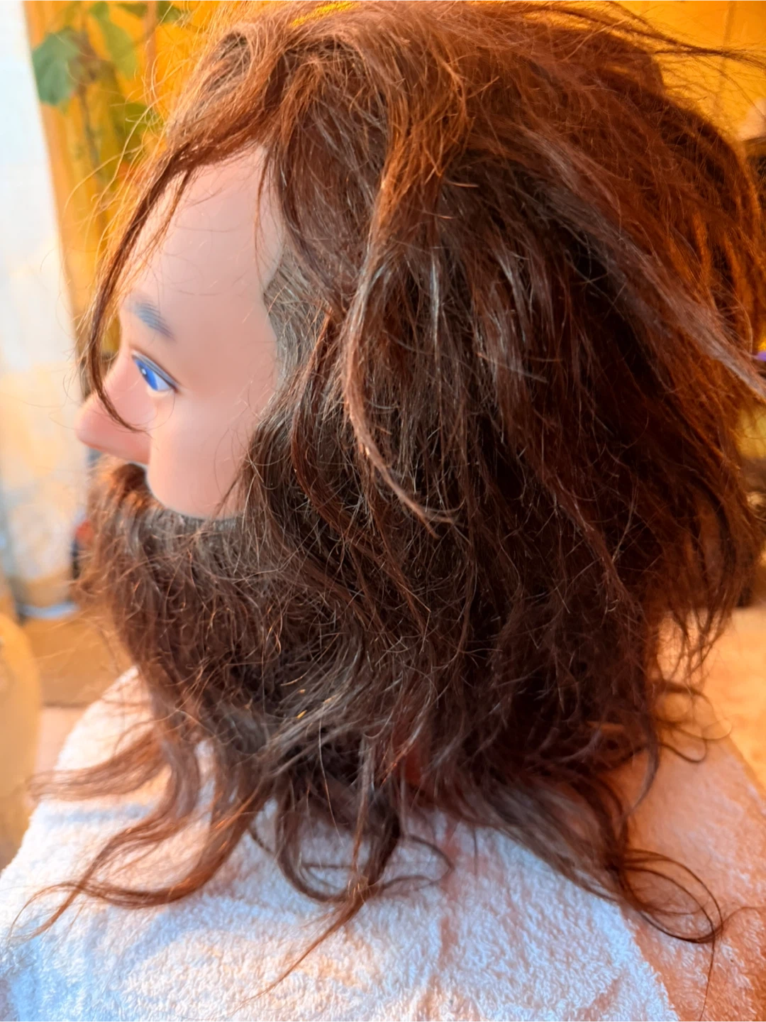 This mannequin head features realistic hair and a beard, perfect for practicing hairstyling techniques. It has blue eyes and a neutral expression. It's suitable for barbershop training or personal use.