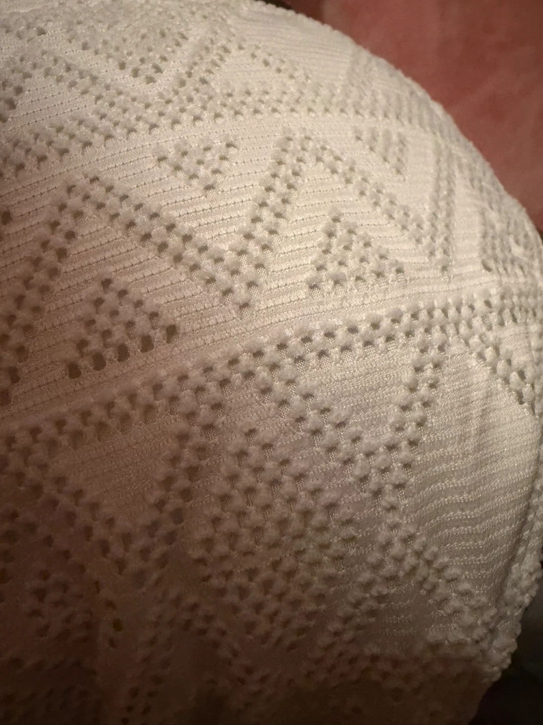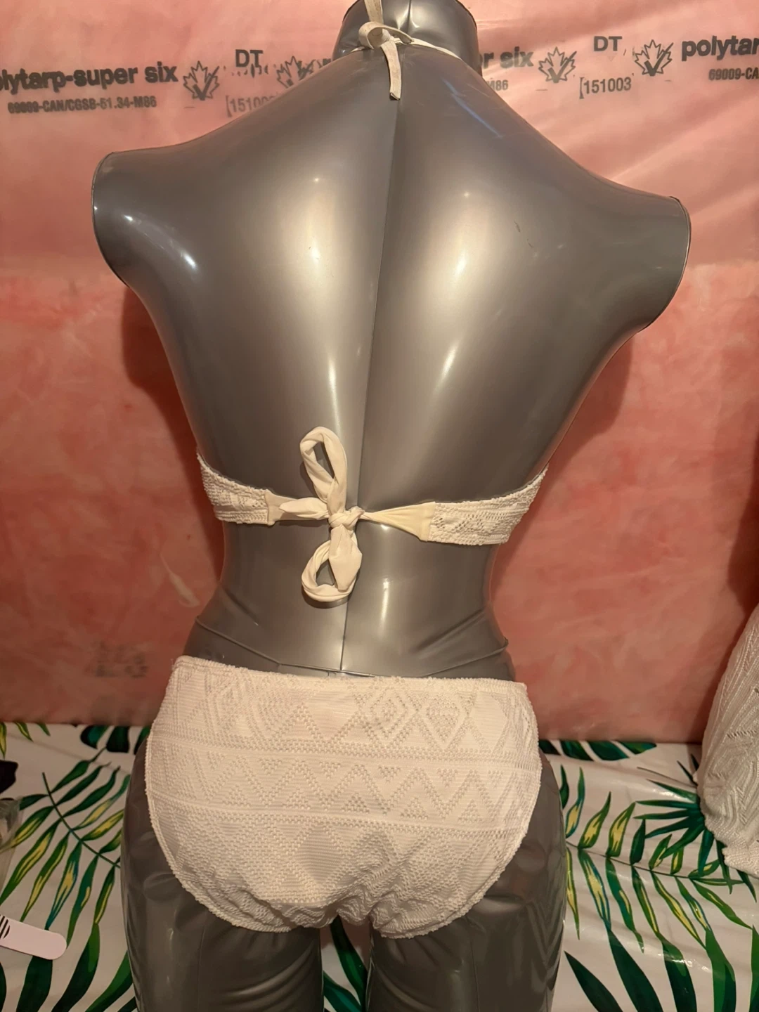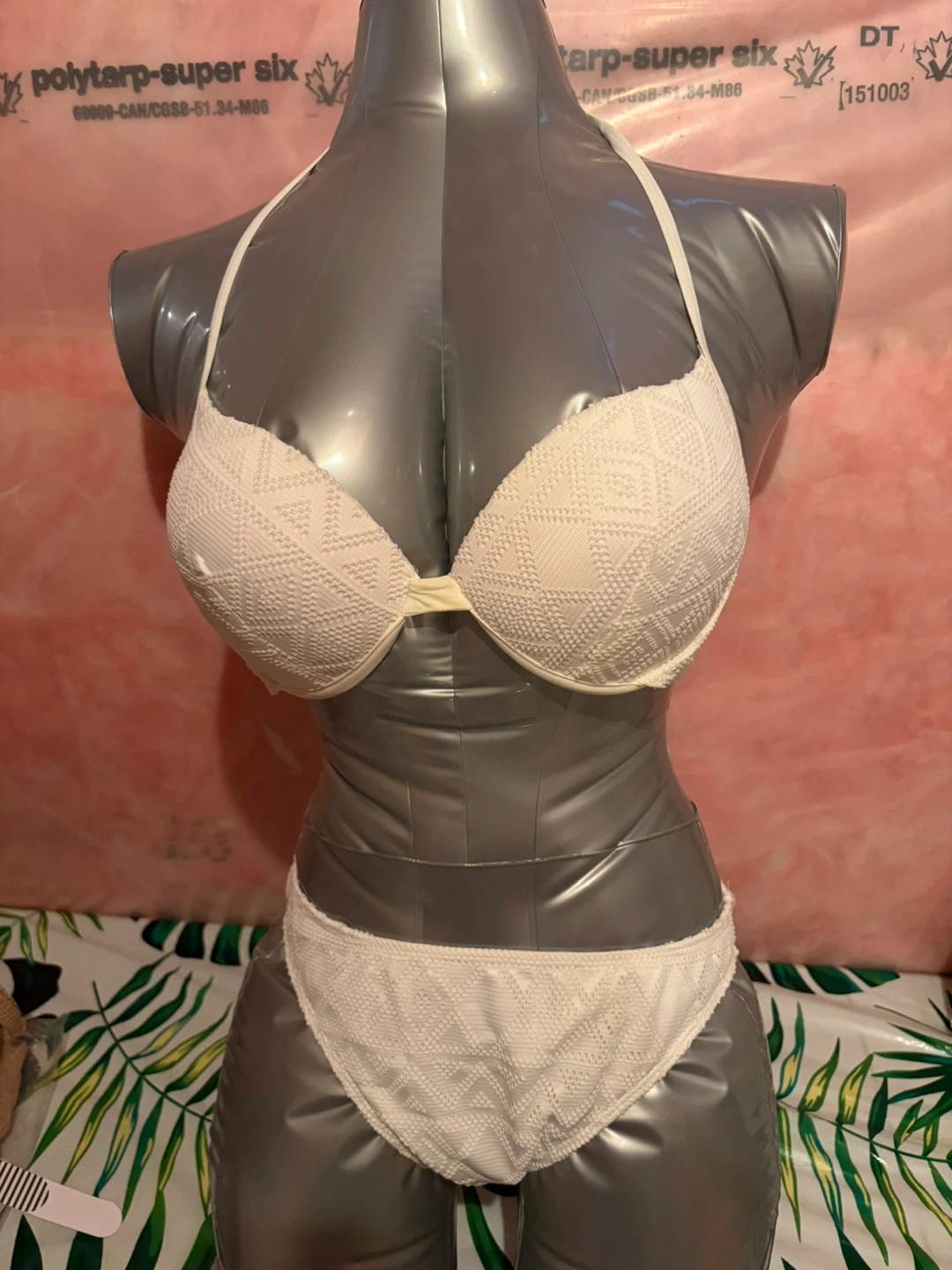 White crochet bikini set with a patterned design. It has a halter-neck top and matching bottoms. Made with a textured fabric for a unique look.