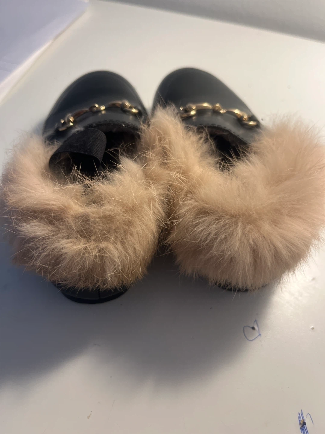 Cute black faux leather loafers for girls. They feature a fuzzy trim and gold horsebit detail. The sole size is 28, which is 190mm. Perfect for keeping little feet cozy and stylish!