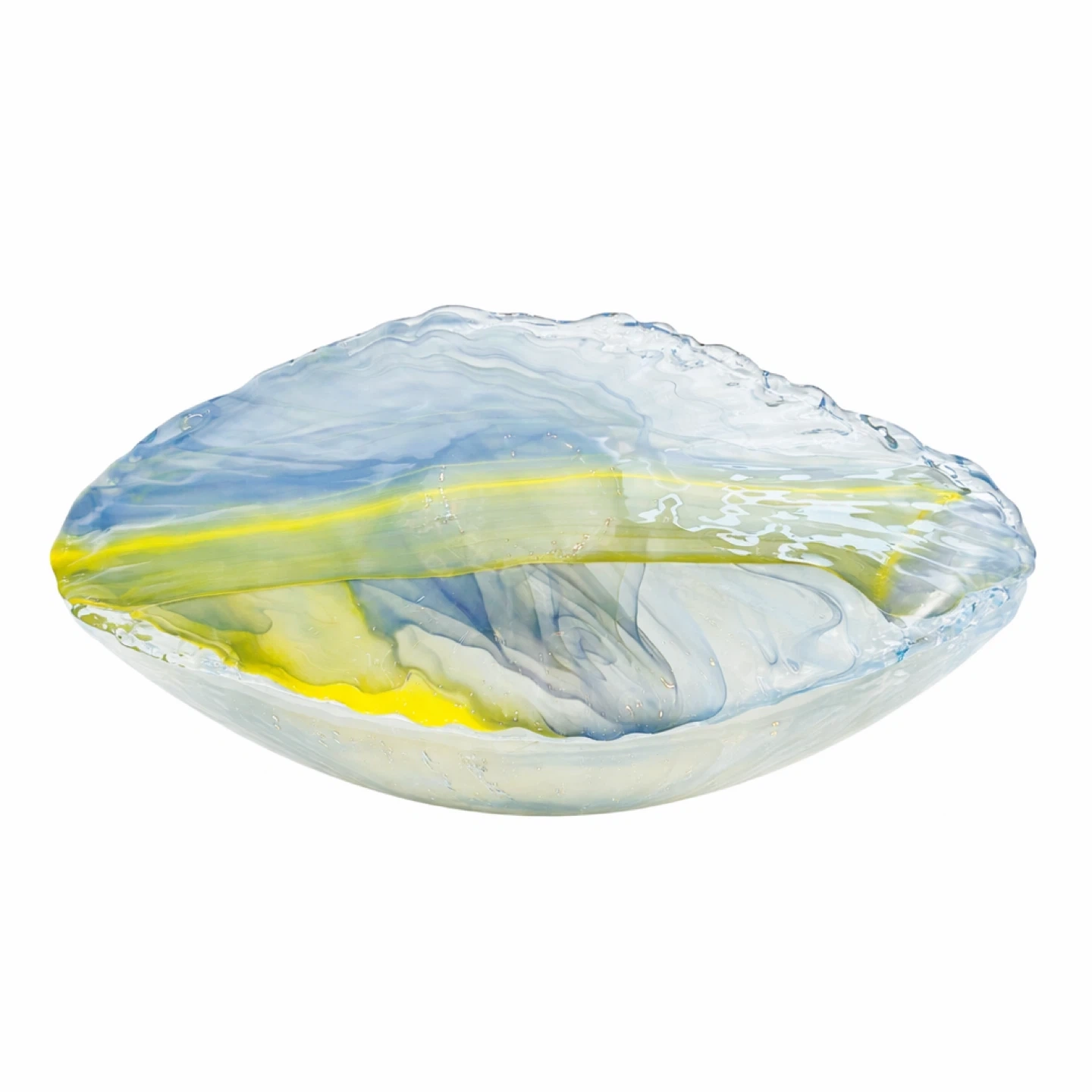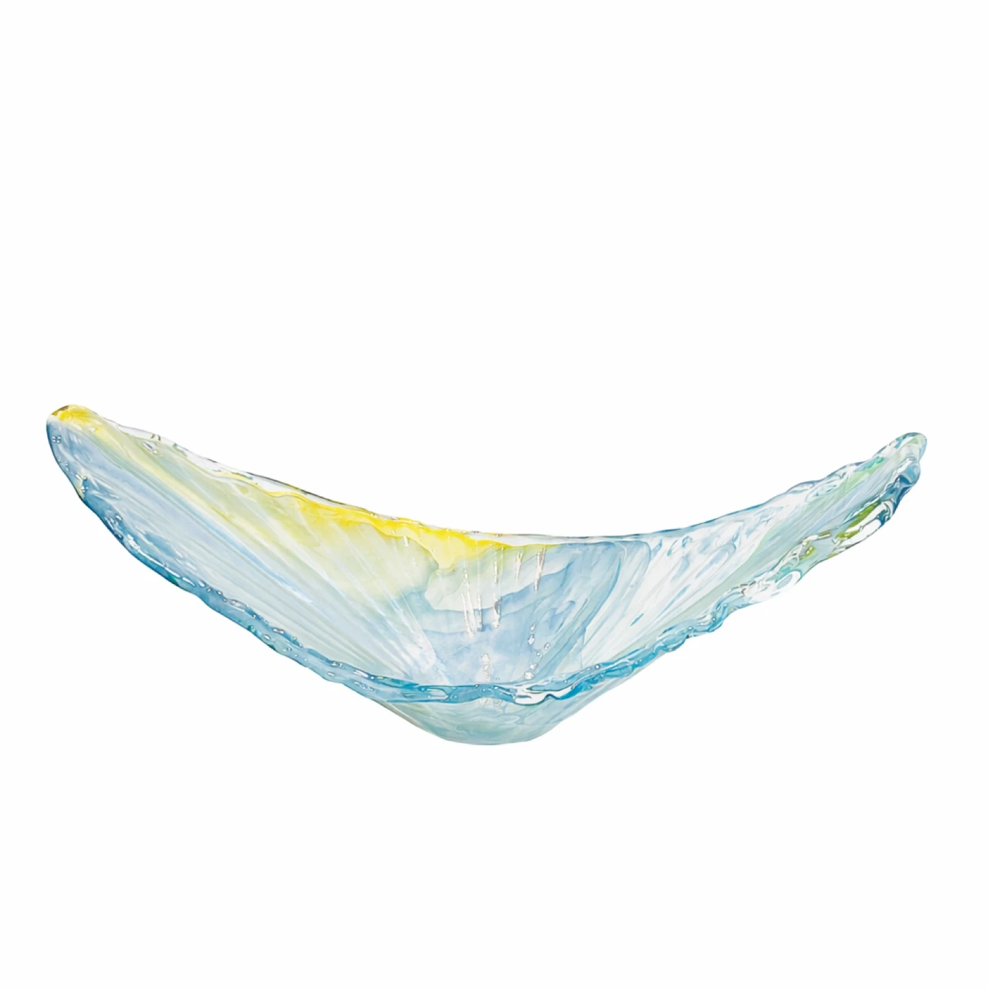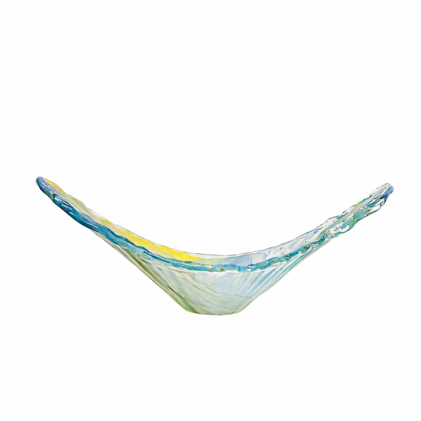 A monumental, sculptural studio art glass bowl defined by dramatic up-swept “wing” rims and a deep, floating basin—an object that reads as contemporary glass sculpture rather than utilitarian form. Thick clear casing amplifies the internal color fields, creating exceptional optical depth and a liquid, suspended-pigment effect as light moves through the glass. The silhouette is intentionally asymmetric, with lifted ends and a softly weighted center, presenting as a gallery-caliber statement piece for a console, cocktail table, or pedestal.
