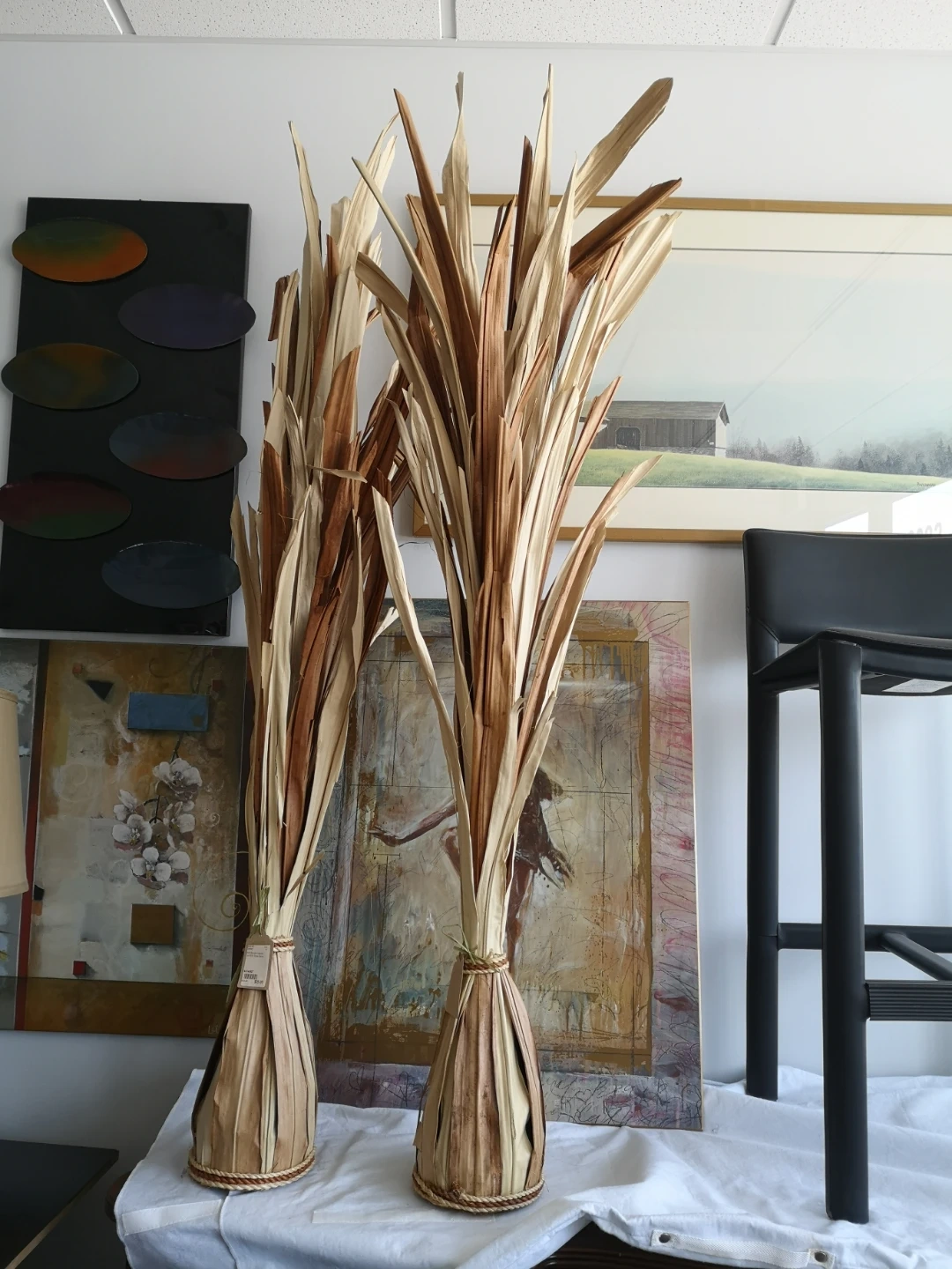 Tall decorative dried tropical plants. These pieces have a natural dried grass appearance and are bound at the base with natural fibre cord. They bring a natural, earthy accent to any space. Great for creating a unique statement in your home decor!