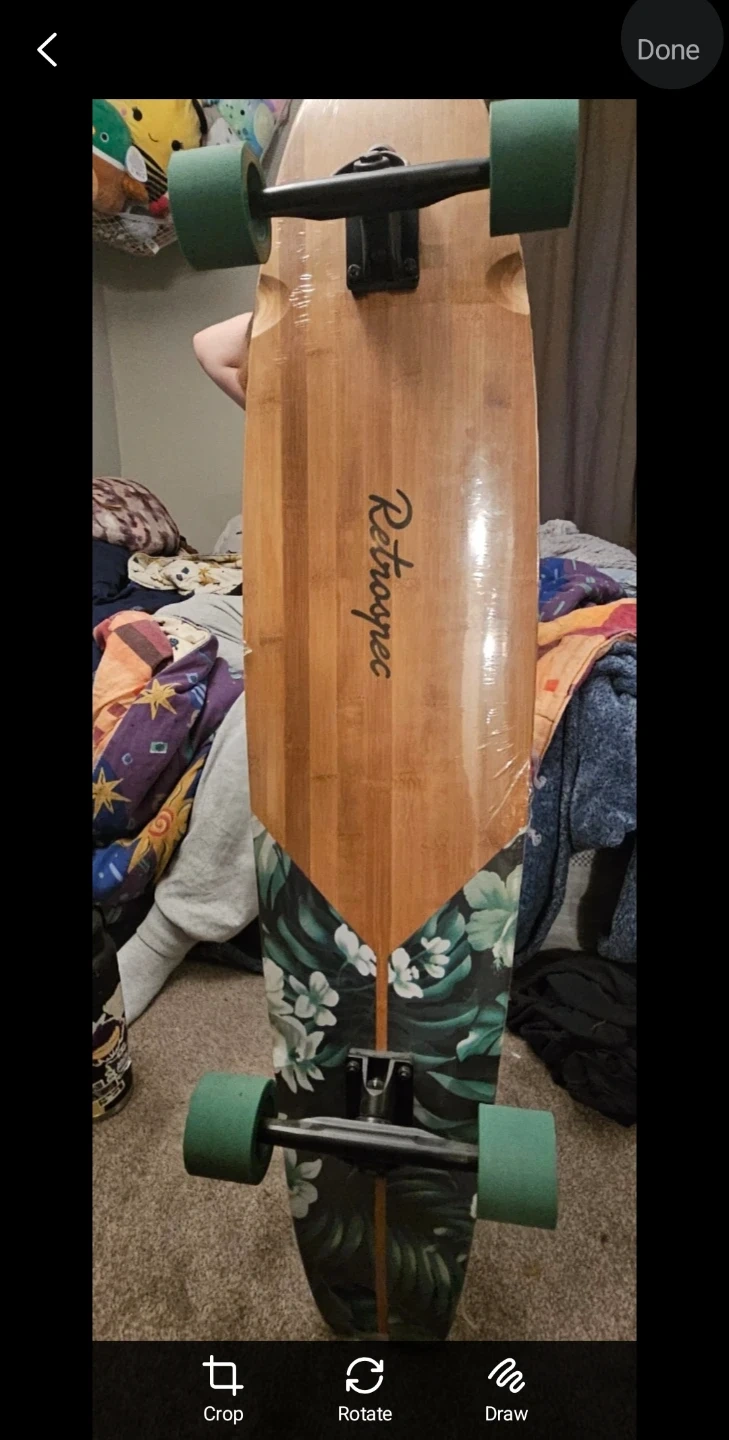 Retrospec longboard has a bamboo deck with a tropical leaf design on the back. Been in a closet for a few years, but still practically new.