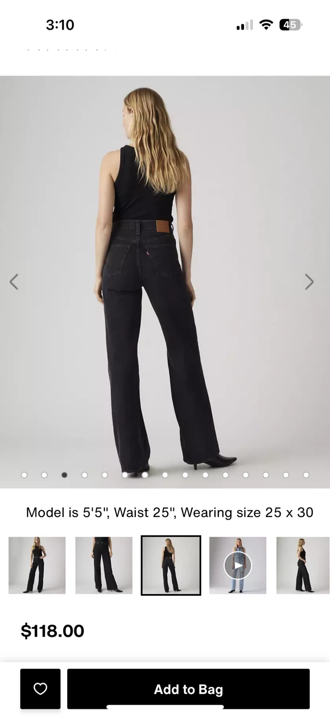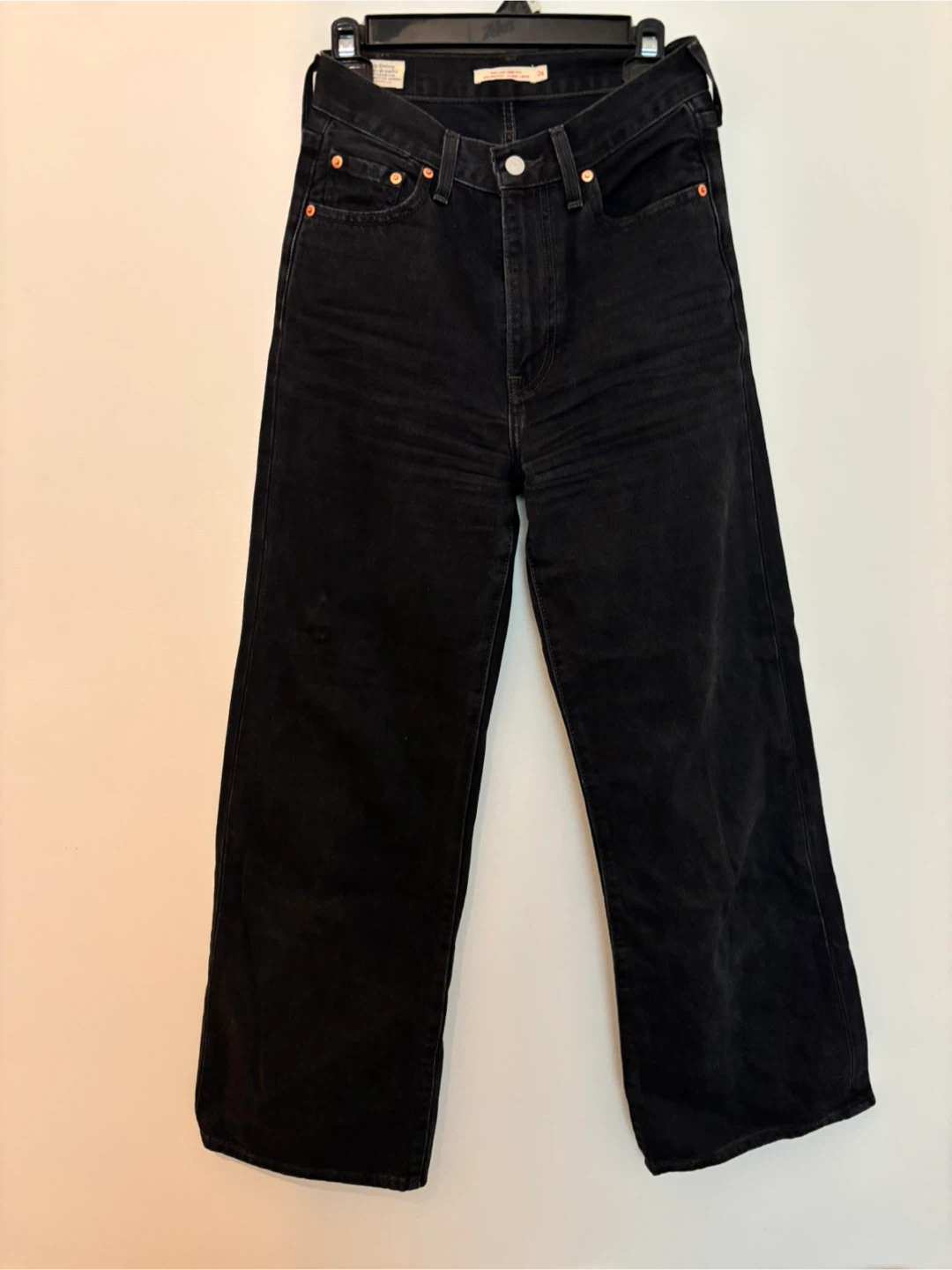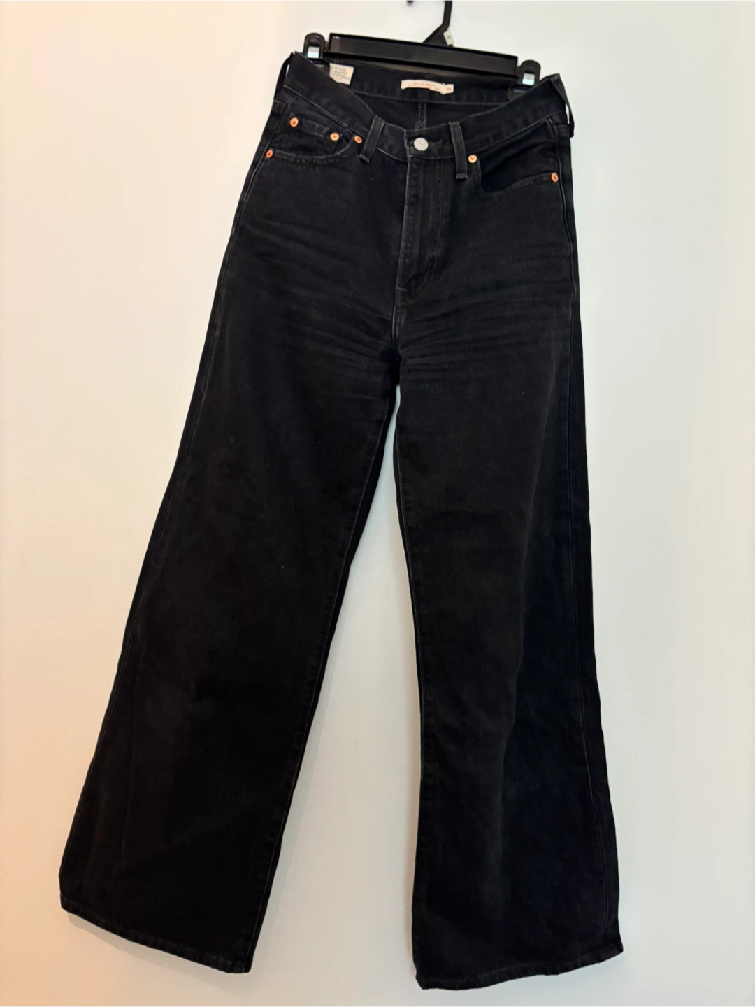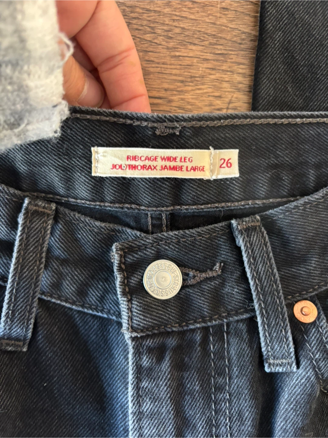 Levi's black ribcage wide leg jeans. Size 26 waist These are made from a durable denim material. They're a stylish option for everyday wear! Cash only.