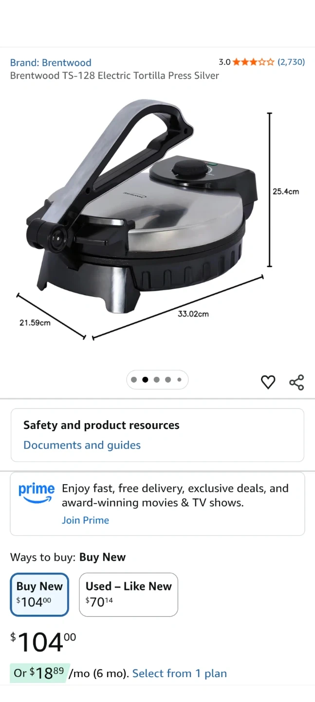 Brentwood TS-128 electric tortilla press in silver. It's 33.02cm long, 21.59cm wide, and 25.4cm tall. This press is great for making fresh tortillas at home!