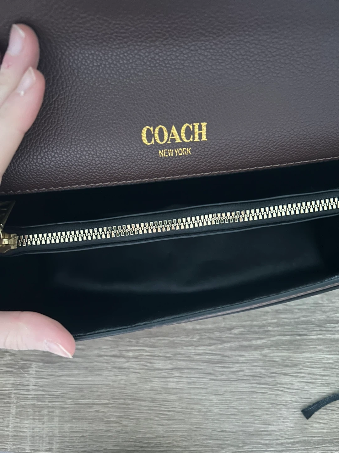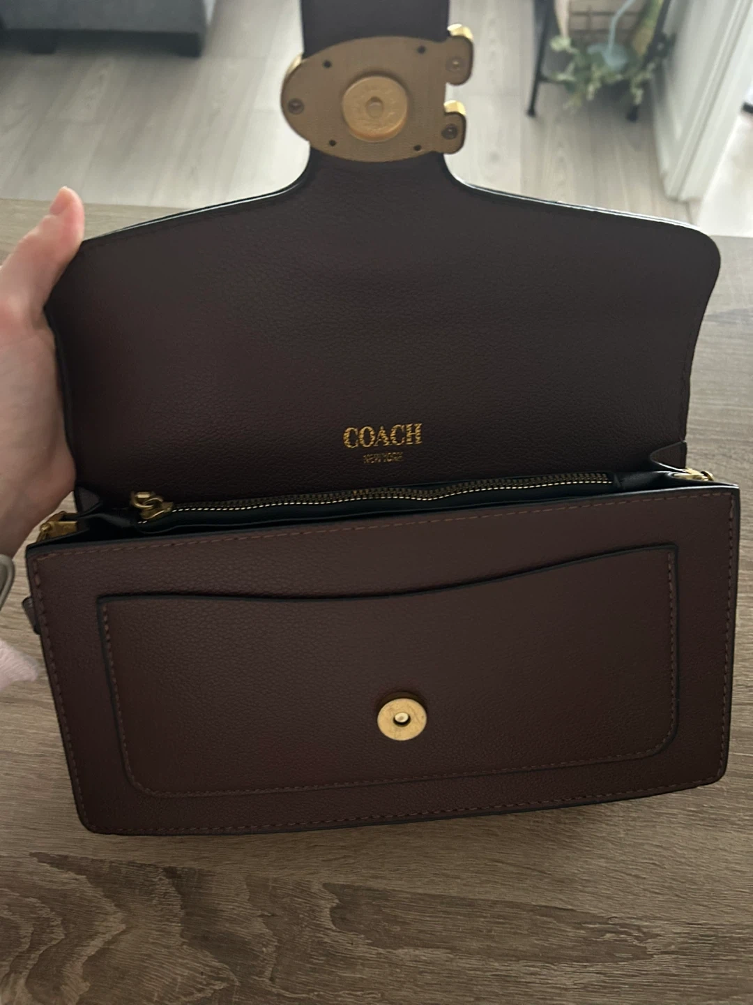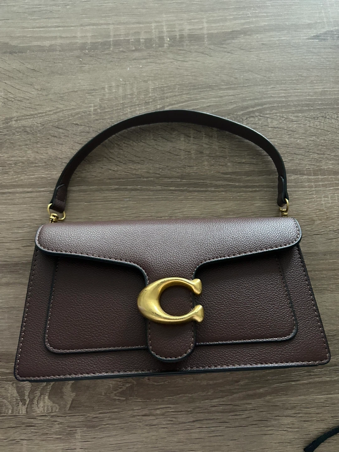 This is a Coach Tabby shoulder bag in a deep brown colour. It's made from pebbled leather with a gold-toned 'C' hardware clasp. The bag features a zip pocket inside and a magnetic snap closure on the front pocket. It's a stylish and practical accessory for everyday use. I got it secondhand so am not sure of authenticity. It regularly retails for over $400. There are small scratches on the C. I only have the short strap, it does not come with a crossbody one.