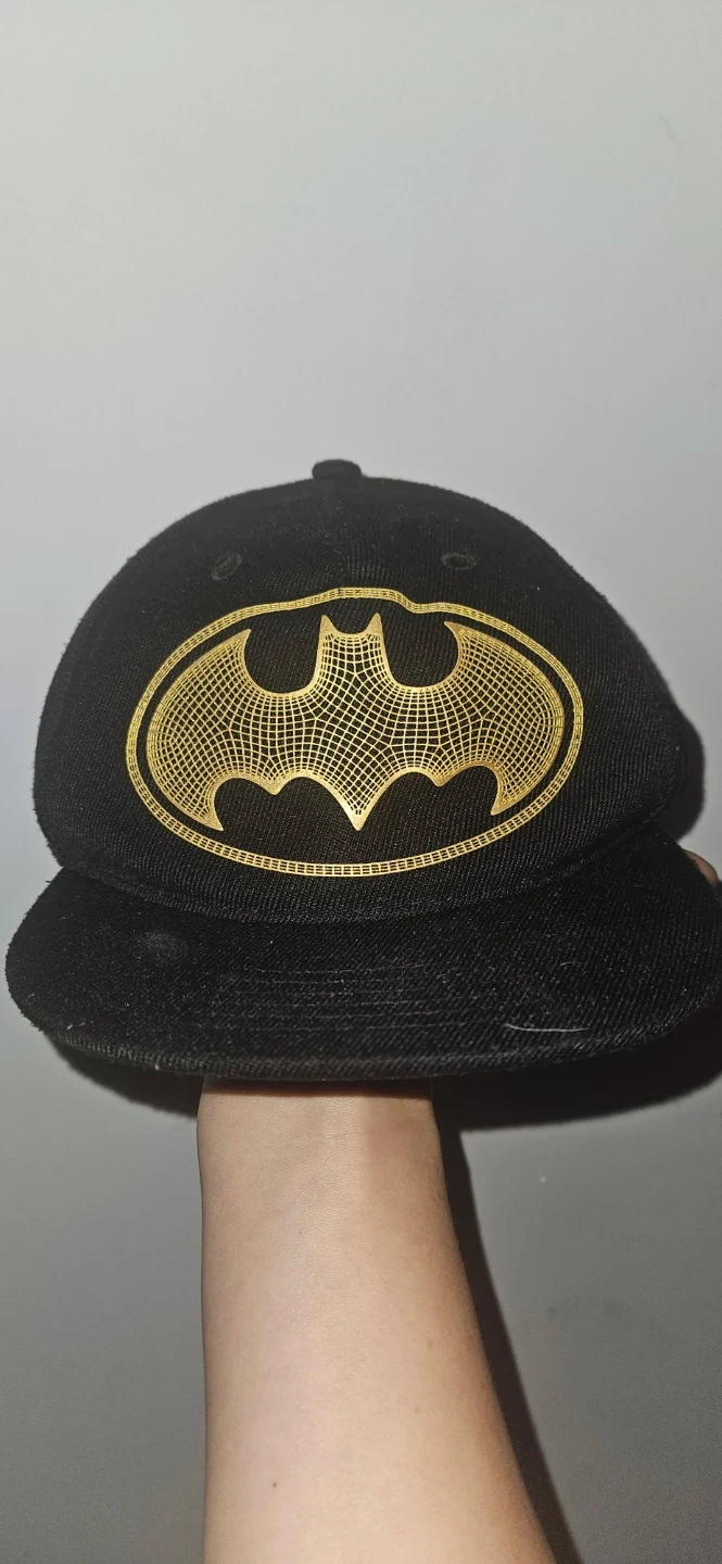 This is a black baseball cap from H&M featuring a gold Batman logo. Adjustable. . It's labelled with sizes EUR 110/128, US 4-8Y, CA 4-8Y, MX 5-8, and AUS 5-8. Made in China.