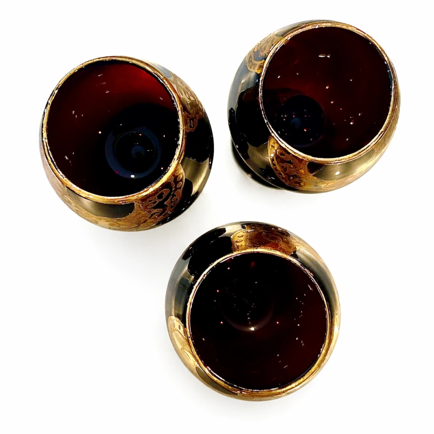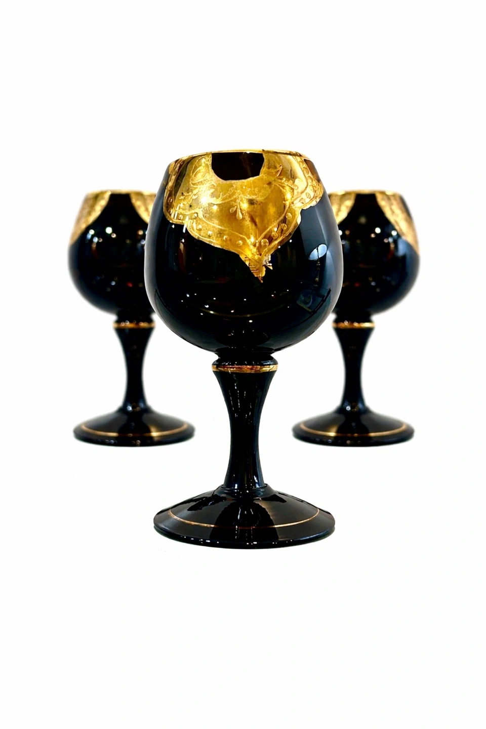 A dramatic set of three early 20th century–attributed black glass goblets, richly embellished with hand-applied raised gilt enamel in ornate cartouche motifs. Against the mirror-dark, obsidian body, the gold decoration reads like jewelry—dimensional, tactile, and sculptural—catching light with a warm antique glow. The interiors reveal subtle deep wine and midnight-toned undertones under illumination, adding depth and complexity beyond a simple black profile.