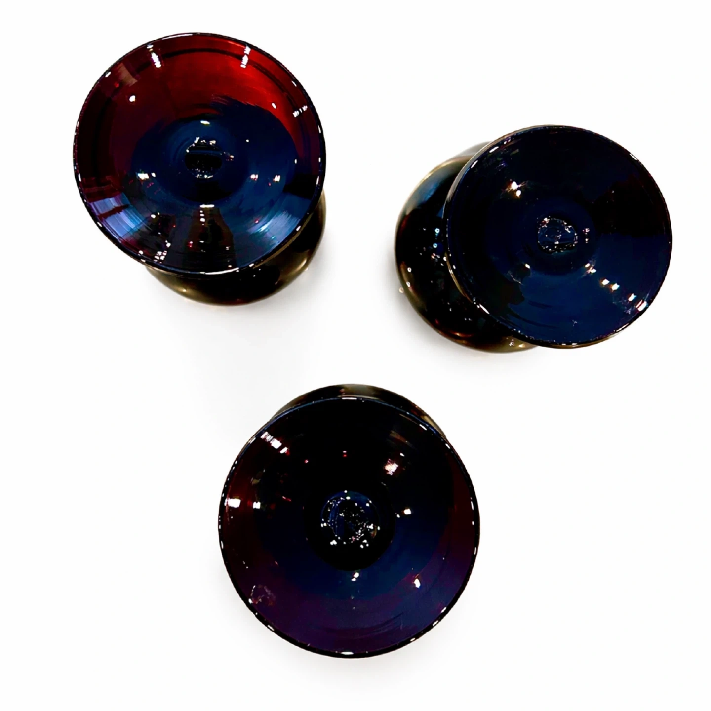 Dimensions: Two goblets measure approximately 5 inches tall; one measures approximately 4 7/8 inches tall. Base diameter is approximately 2 1/2 inches on all three.