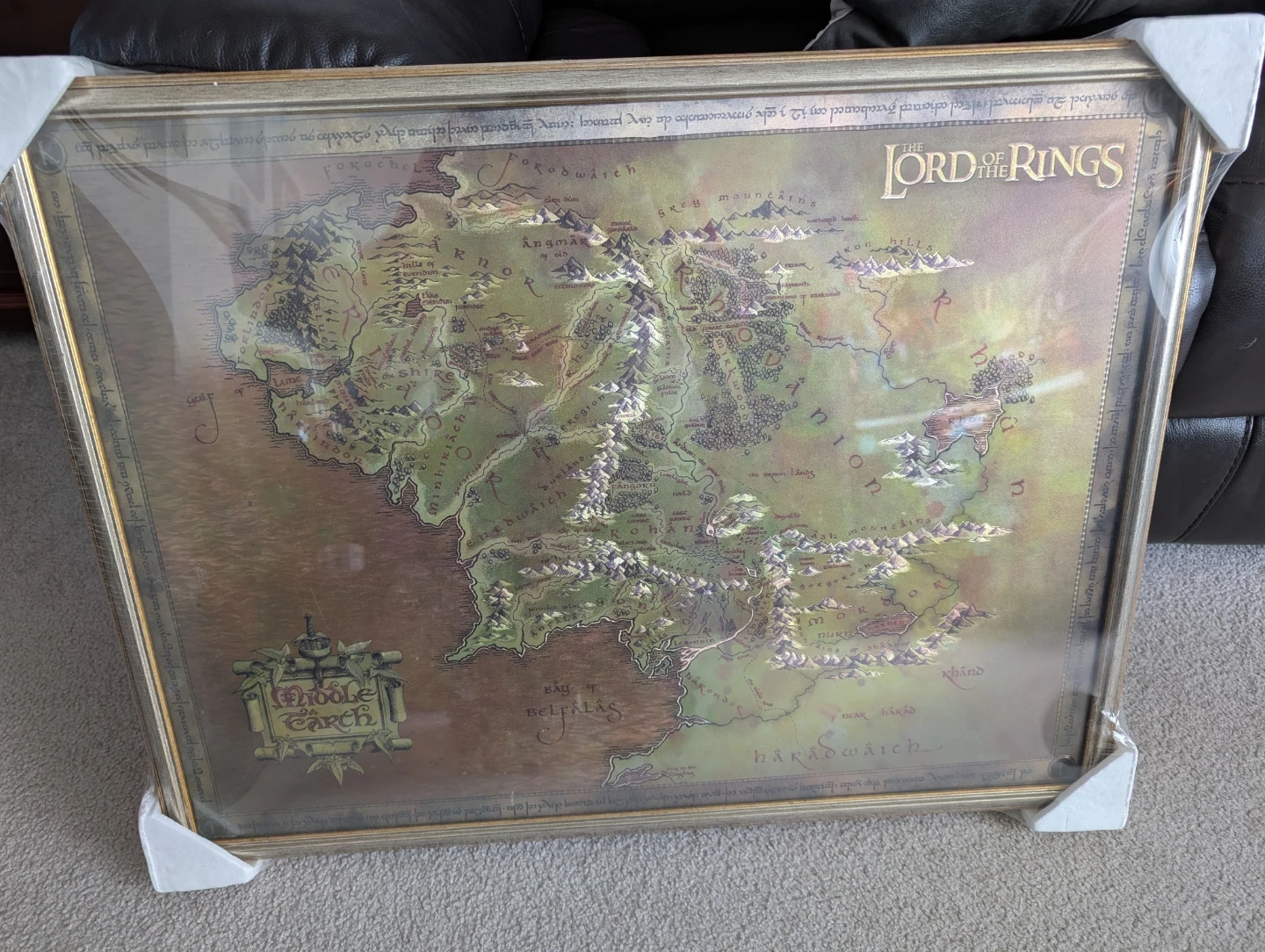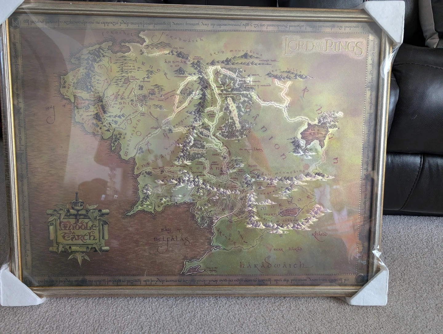 Framed map of Middle-earth from The Lord of the Rings. Detailed artwork shows various regions and locations. It's ready to hang!