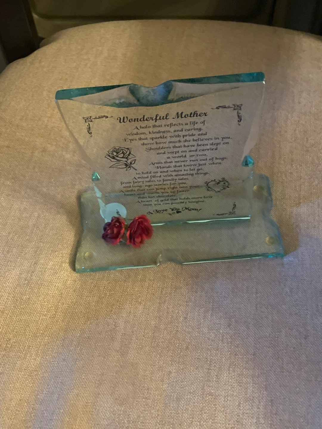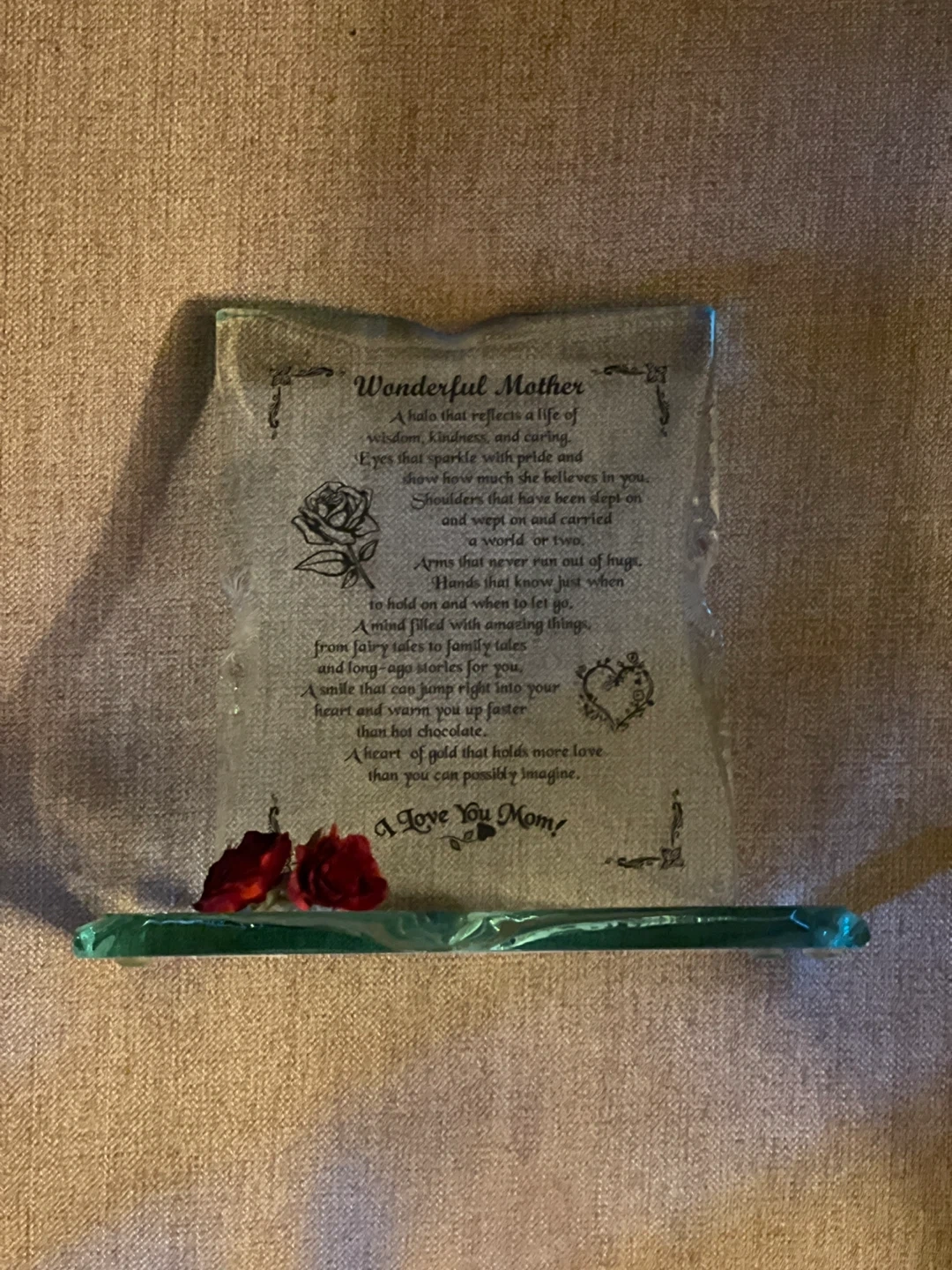 Glass plaque featuring a poem for a wonderful mother. Includes a rose design and a heart accent. It stands on a clear glass base with two small red roses. A lovely sentiment piece!