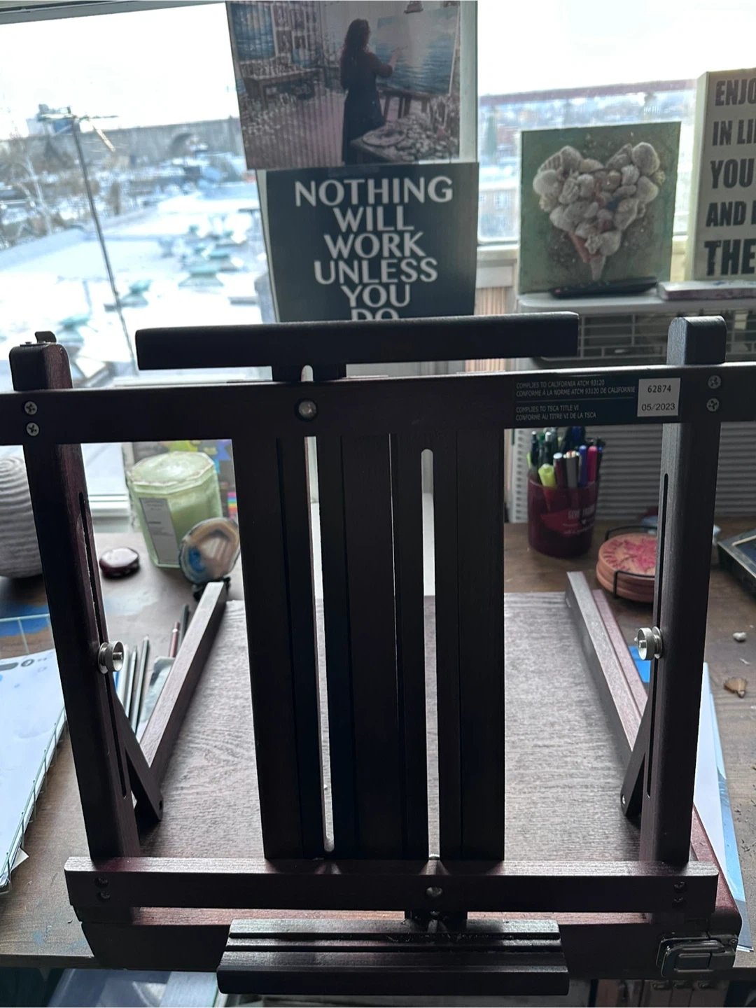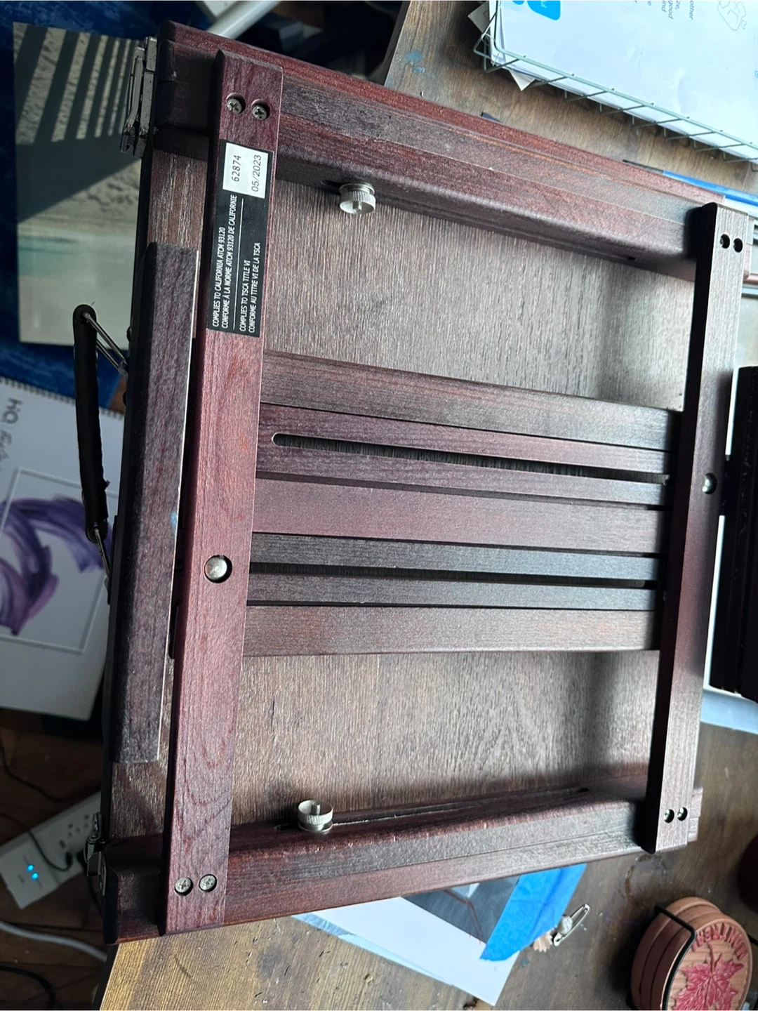 This is a wooden art easel. It's made of dark wood and has adjustable components. It's perfect for artists who need a portable and stable surface for their work.
