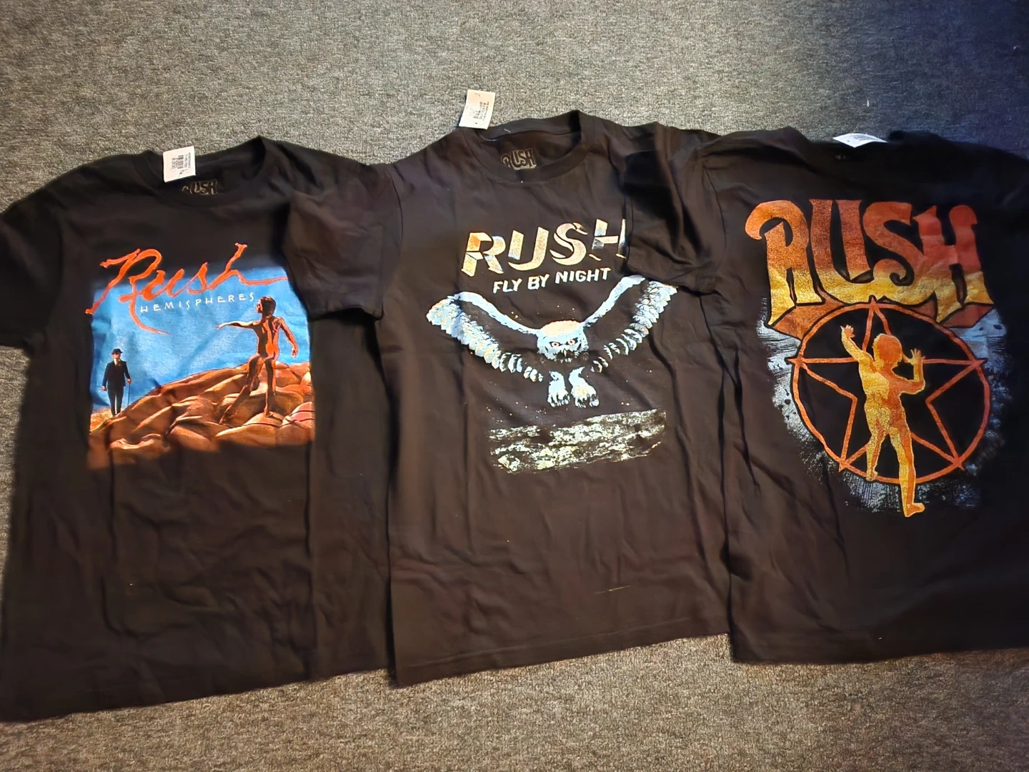 This is a bundle of three Rush band t-shirts. One shirt features the Hemispheres album art. Another shirt has the Fly By Night album art. The third shirt displays the Rush starman logo. All shirts are size unisex small. Each shirt is $20.