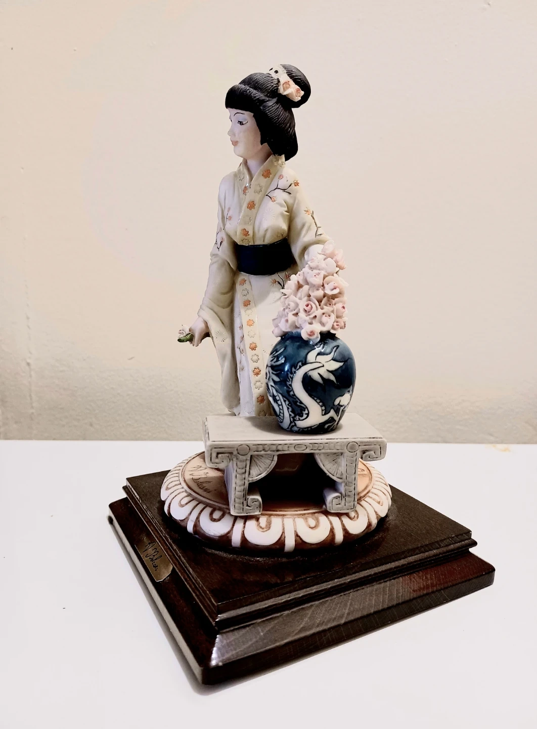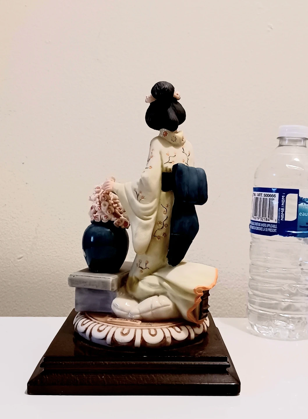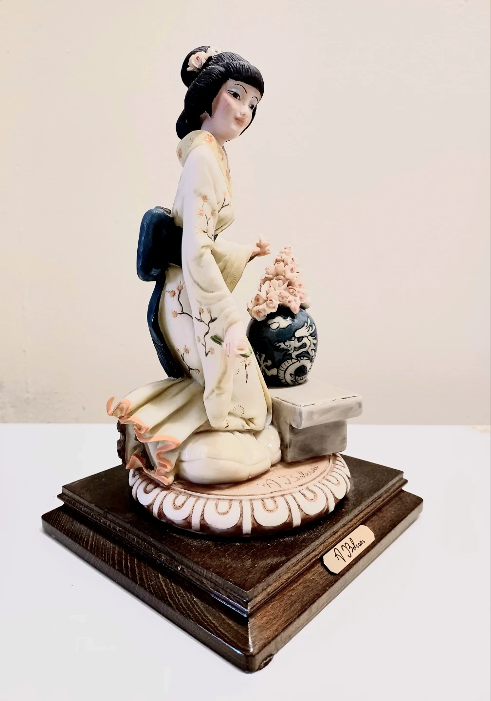This is a Vintage A. Belcari Figurine is a Stunning collectible, showcasing a Geisha with a Vase. The piece is signed by the artist A. Belcari, adding to its Value and Authenticity.