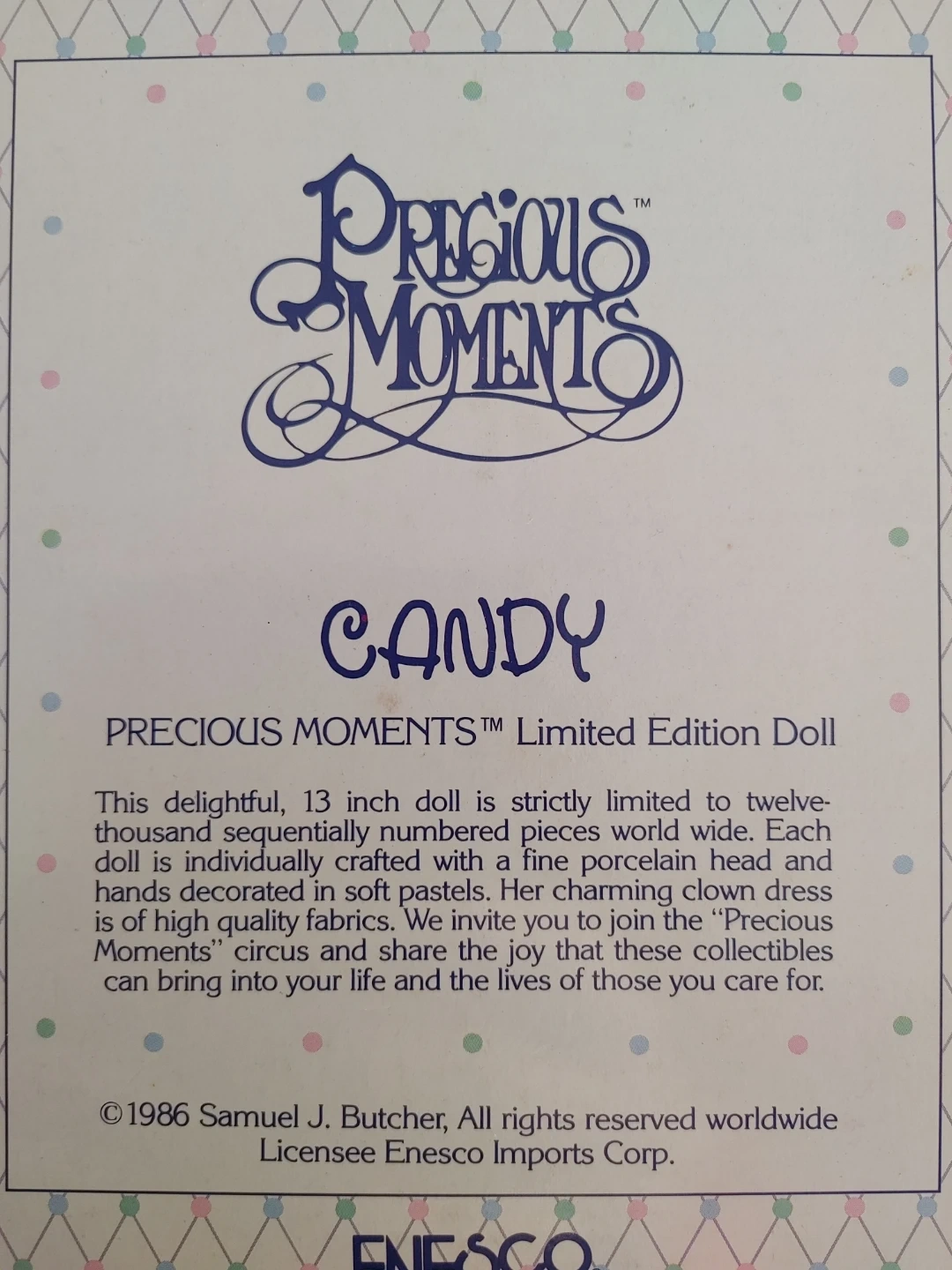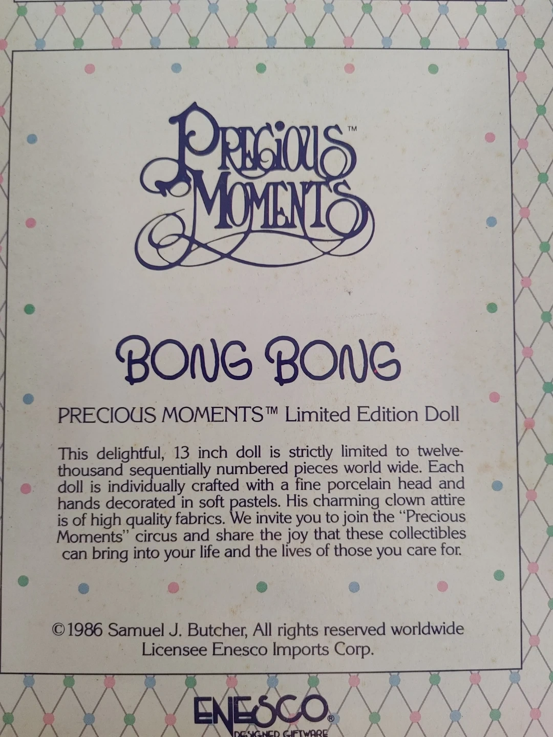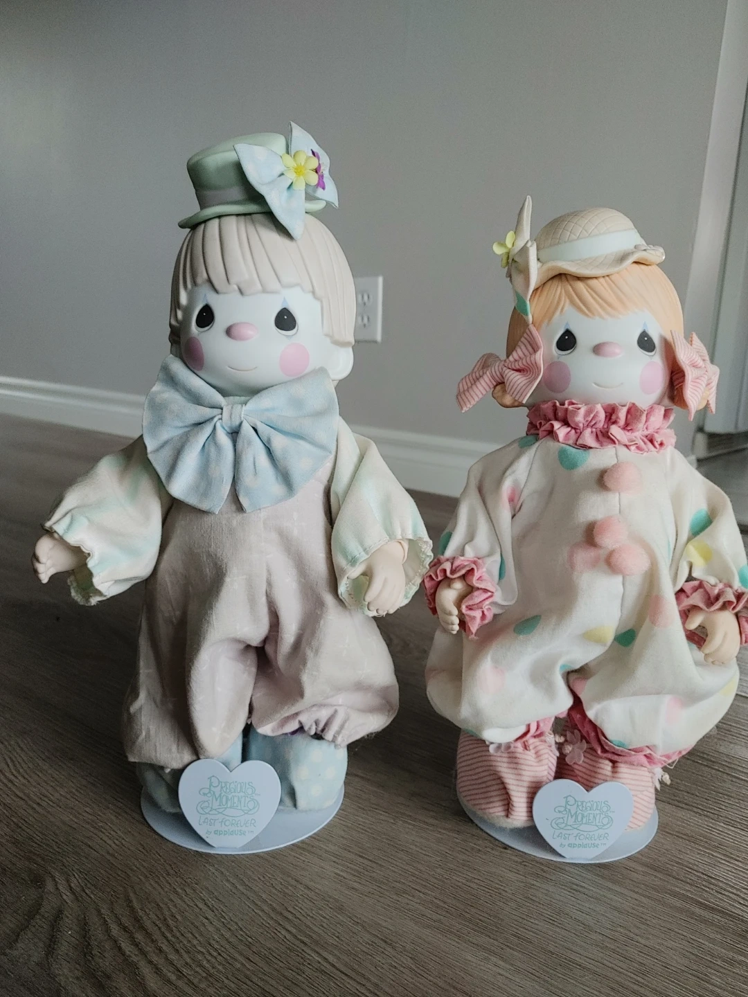 A delightful pair of Precious Moments Limited Edition dolls, Candy and Bong Bong. Each doll is crafted with a fine porcelain head and hands, dressed in charming clown attire. These collectibles are strictly limited to twelve-thousand pieces world-wide. They're a lovely addition for any collector!