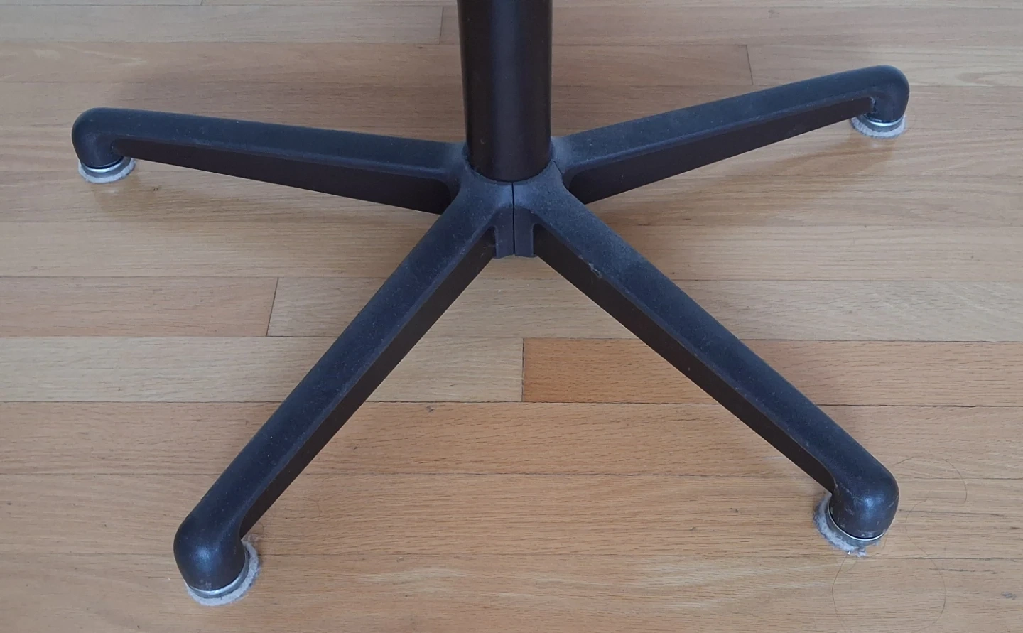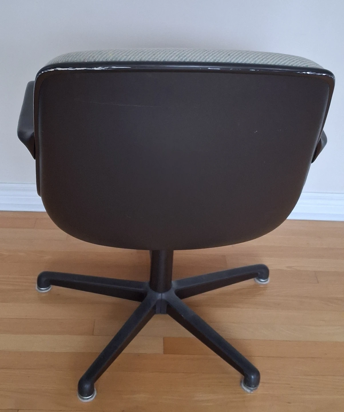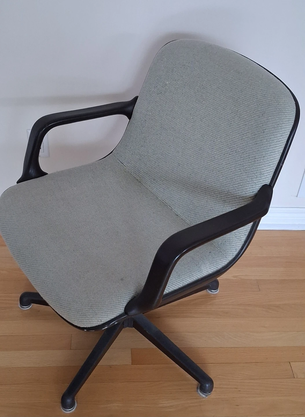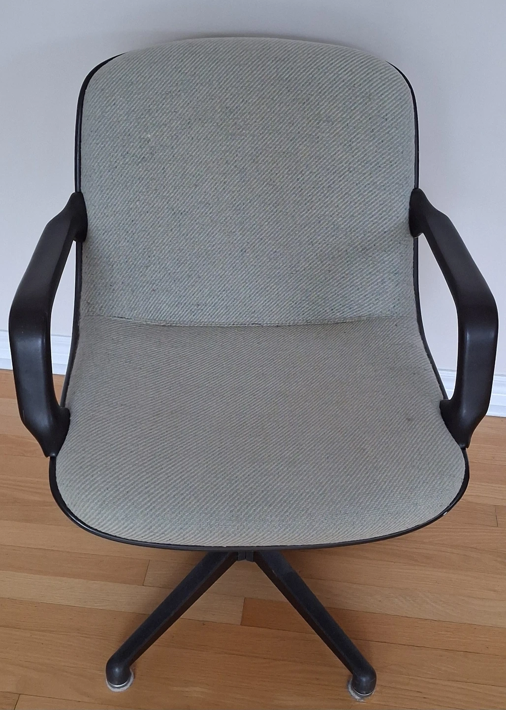 Used office swivel chair with light grey fabric upholstery and black plastic frame and arms. It's a basic, functional office chair with a five-star base. This chair's suitable for a home office or workspace.