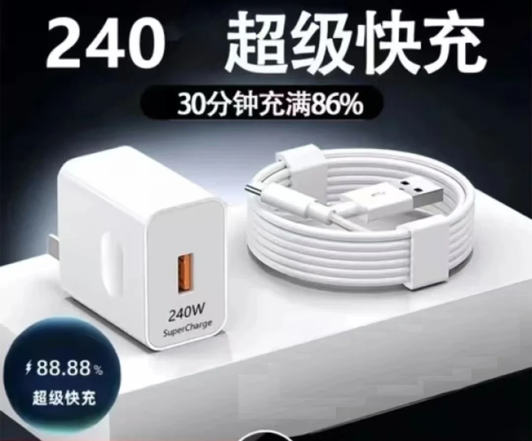 This is a 240W SuperCharge fast charger and cable set. It's white and designed for quick charging, with 86% charge in 30 minutes.