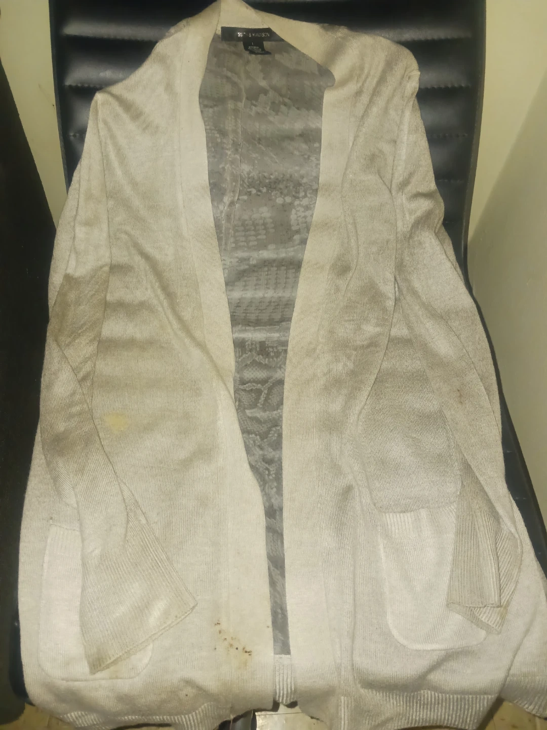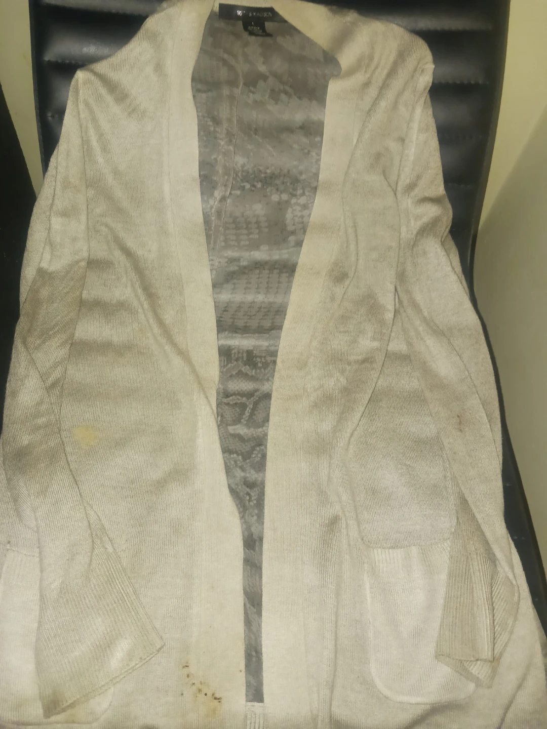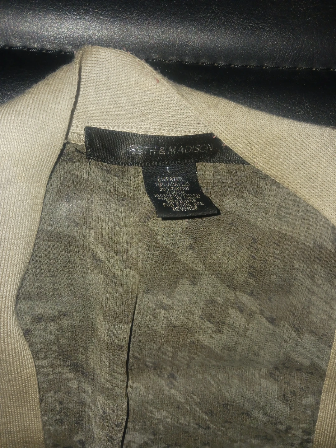 Lightweight cardigan sweater with a patterned lining. Size L. It's a beige knit with a grey and black abstract print lining. It has two front pockets.