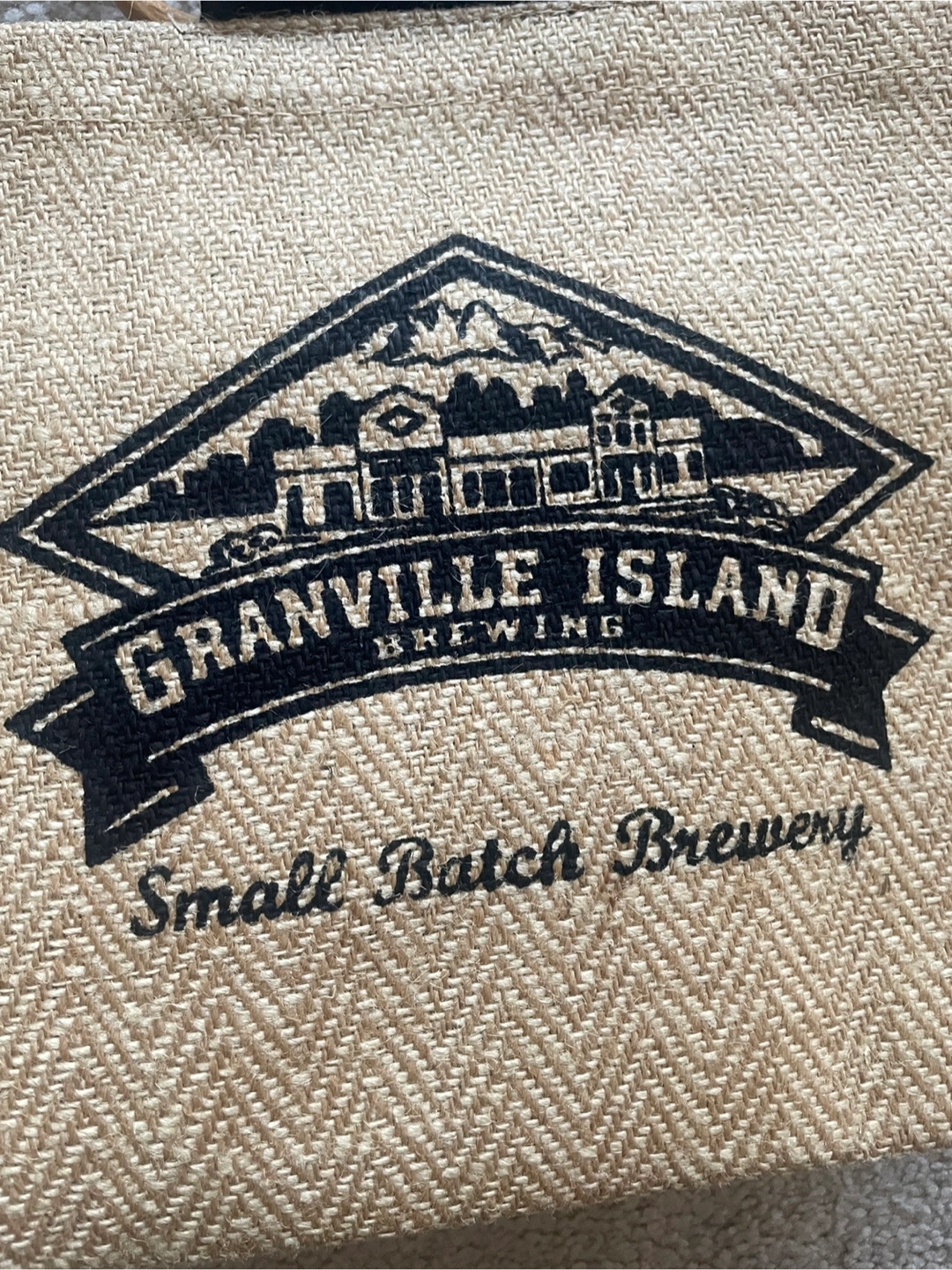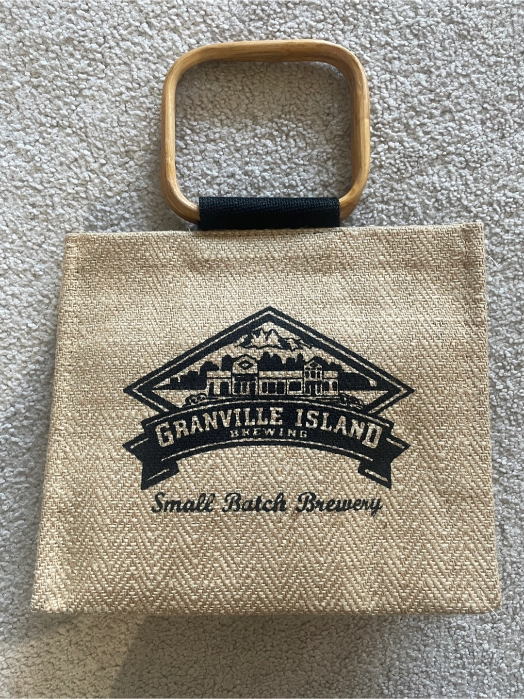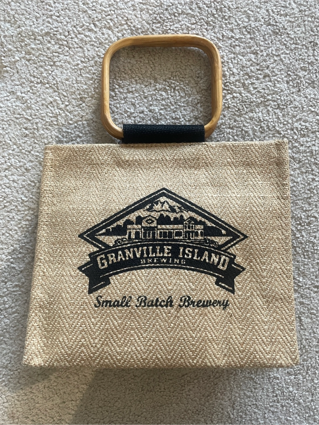 This tote bag features the Granville Island Brewing logo. It has a woven jute exterior and a wooden handle with black fabric wrapping. Interior has multiple compartments.