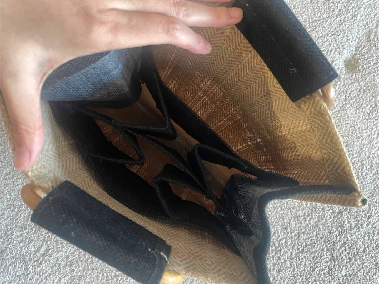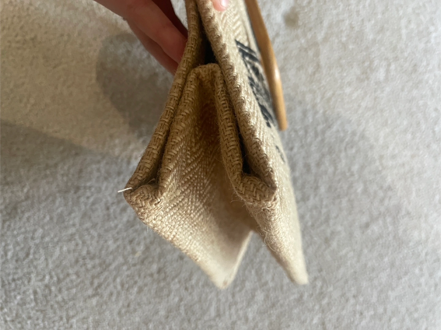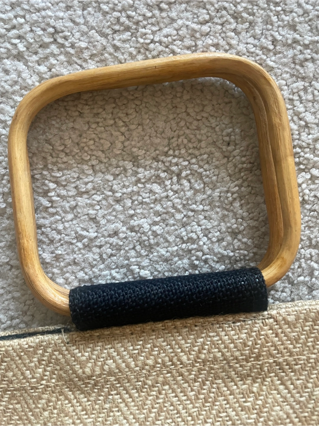 This tote bag features the Granville Island Brewing logo. It has a woven jute exterior and a wooden handle with black fabric wrapping. Interior has multiple compartments.