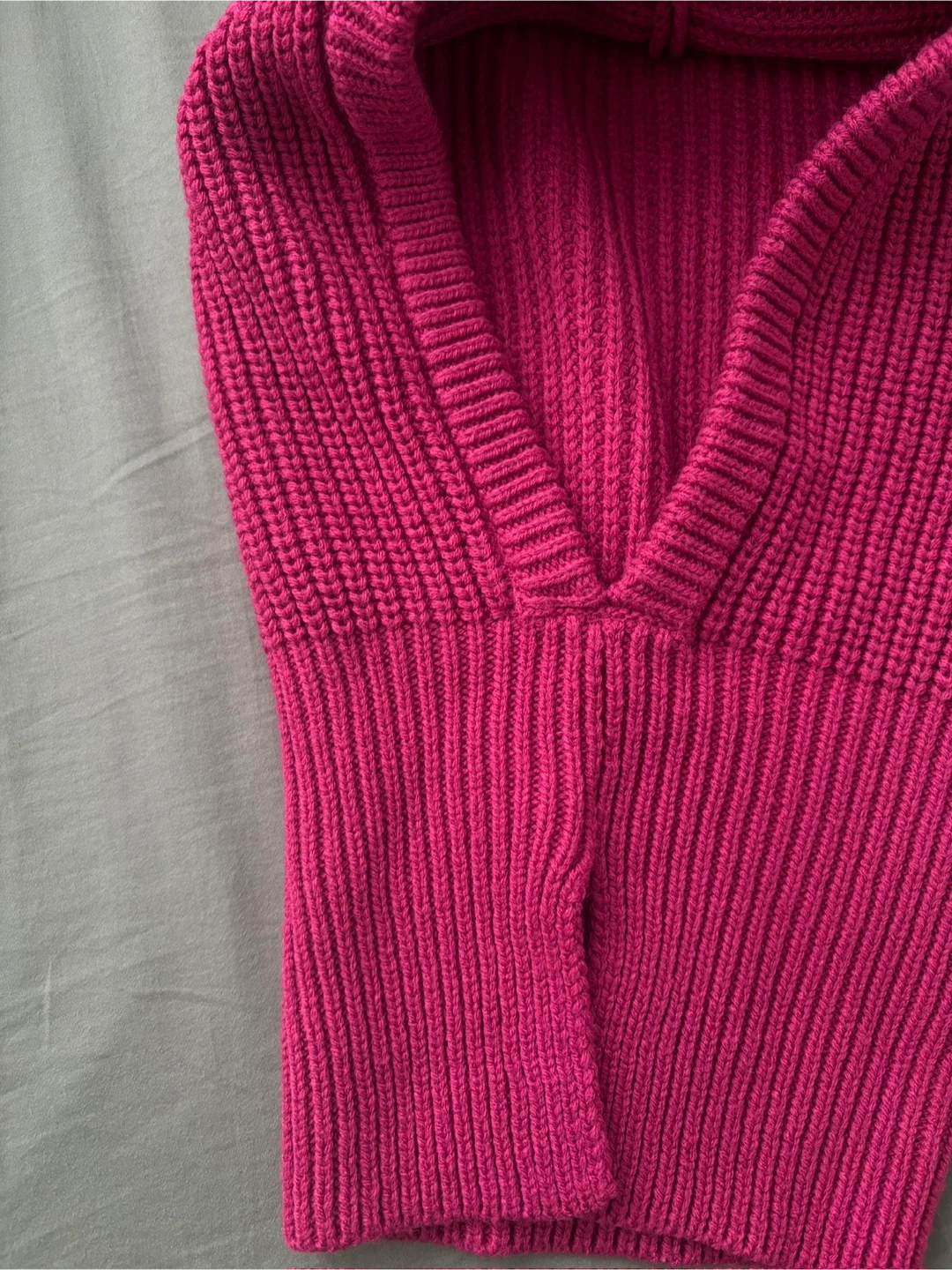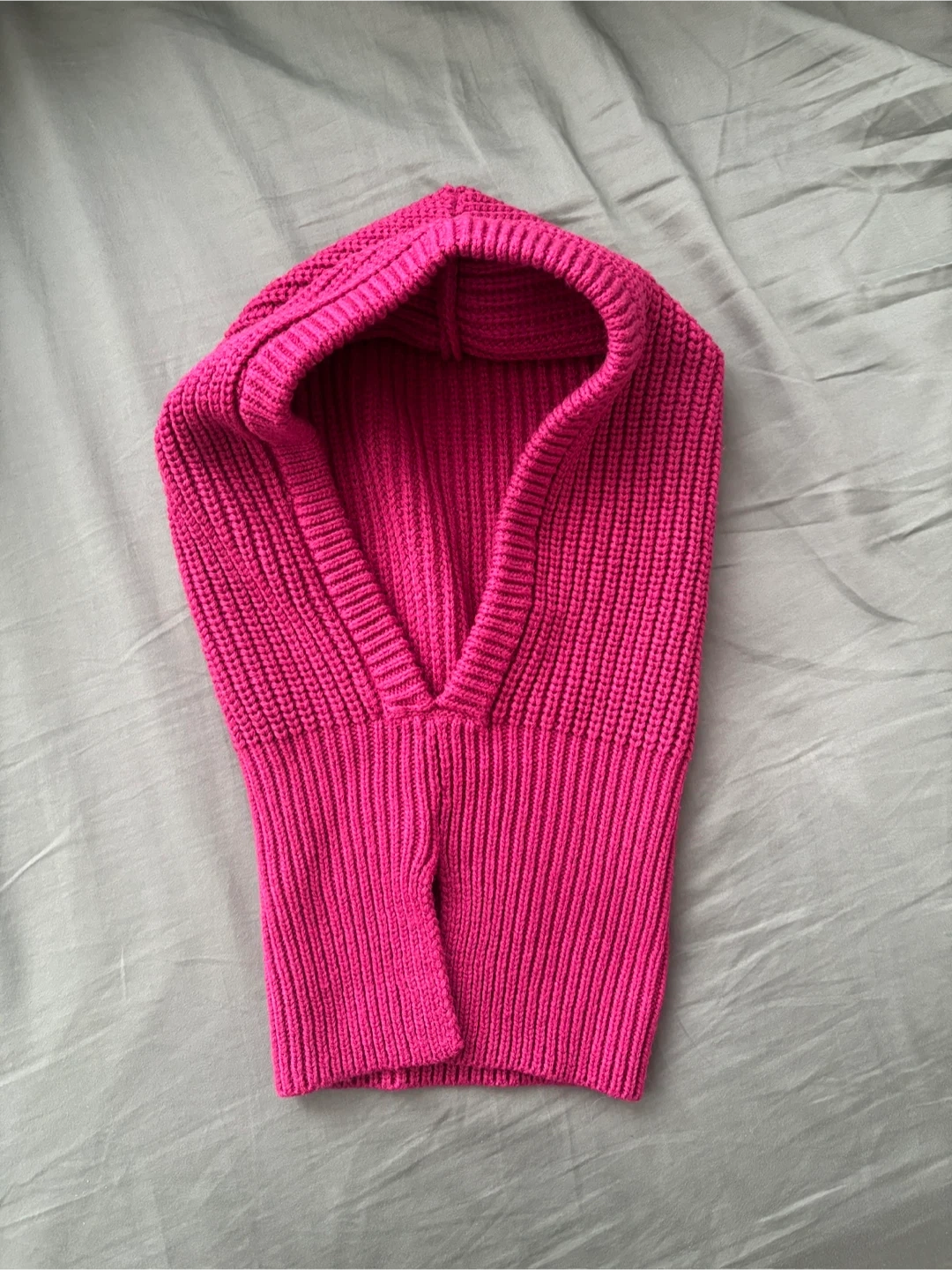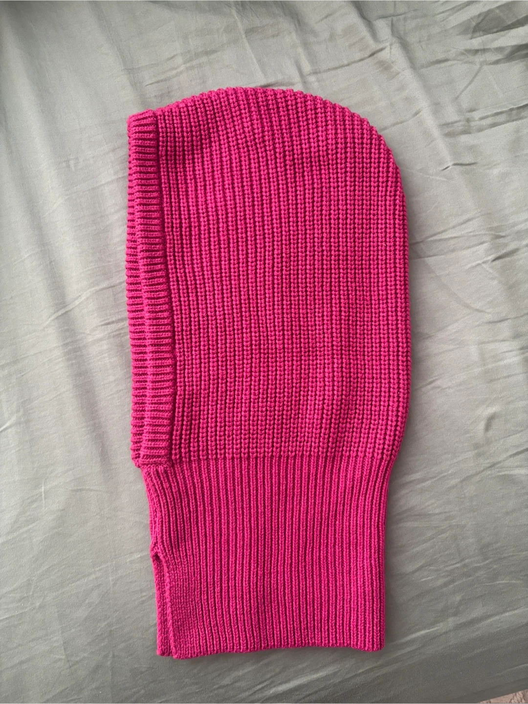 Super trendy, from Japan’s GU, a Uniqlo sister brand. Knitted hood/ snood in a gorgeous pink/purple magenta.