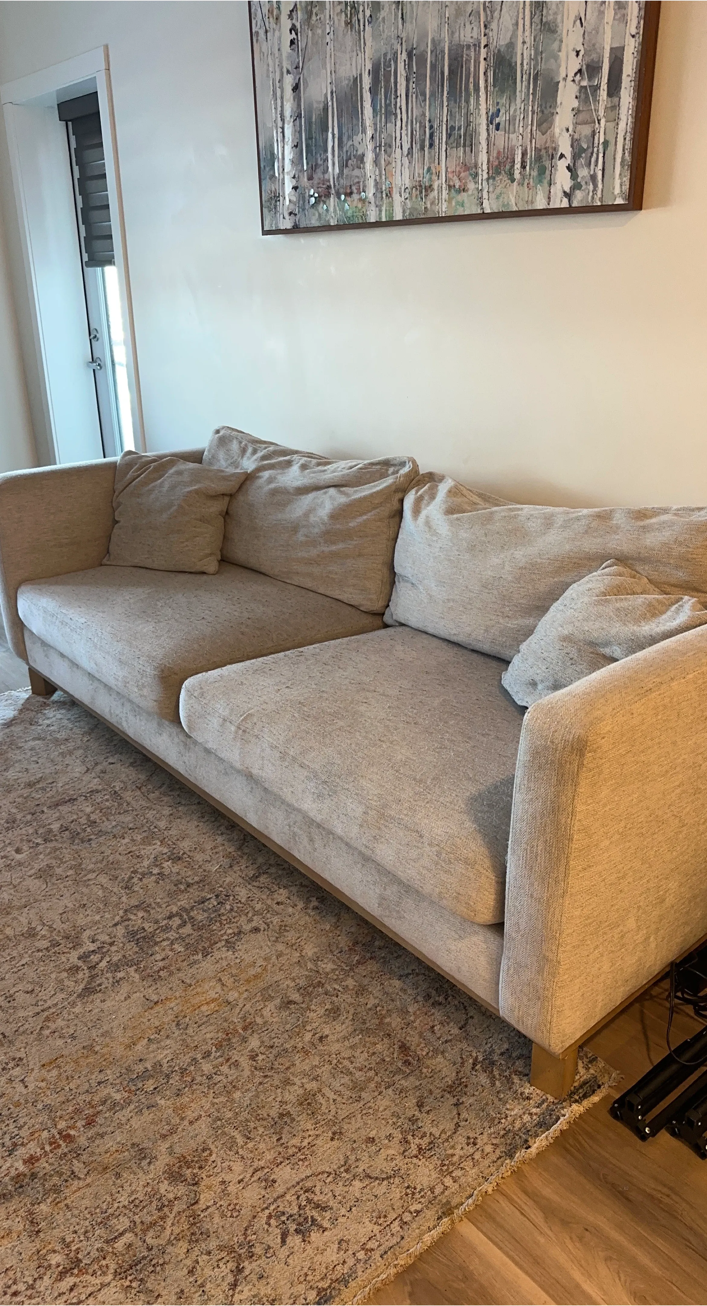 This comfortable sofa features a light beige upholstery with a subtle texture. It comes with matching throw pillows. The wooden frame and legs offer a modern look. It's a great addition for any living space!