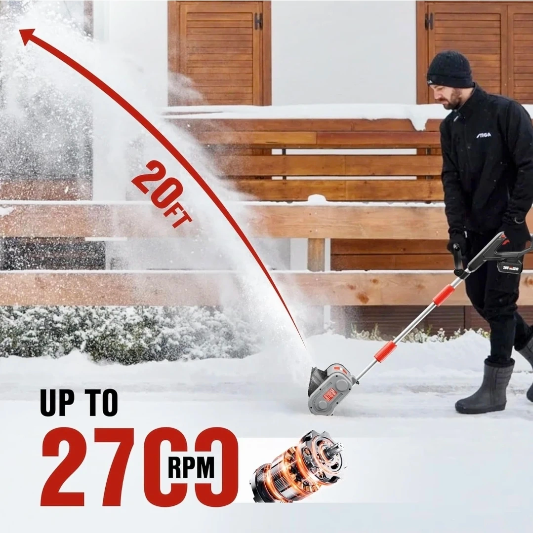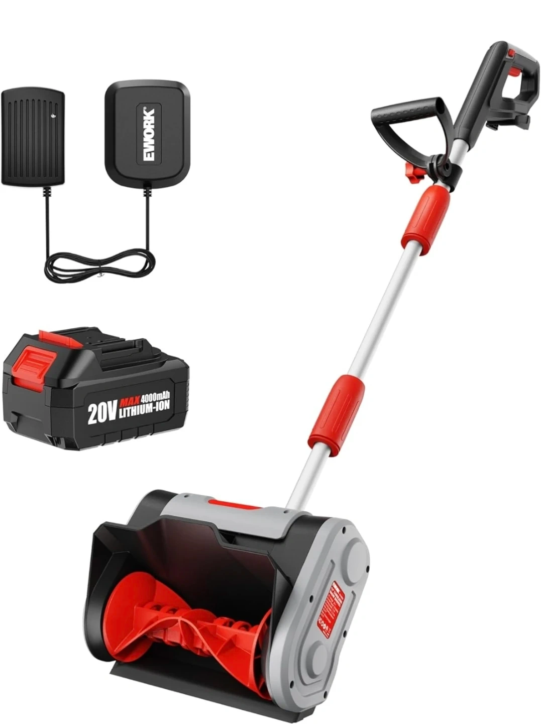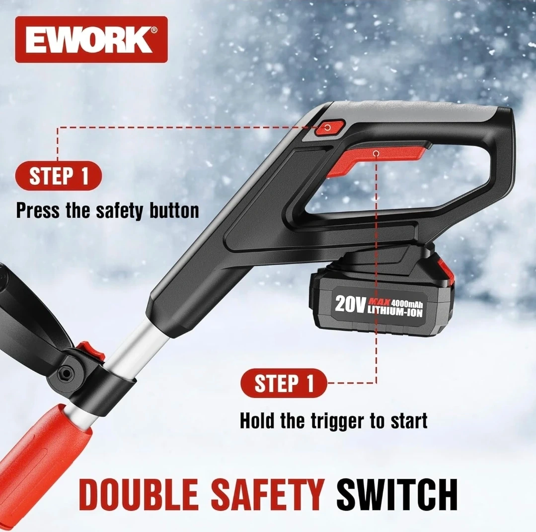 This EWORK cordless electric snow shovel features an 11-inch cleaning width and a 6-inch cleaning depth. It's powered by a 20V MAX 4000mAh lithium-ion battery and can throw snow up to 20ft. It includes an adjustable secondary handle and a double safety switch for ease of use and safety! Brand new comes with battery and charger