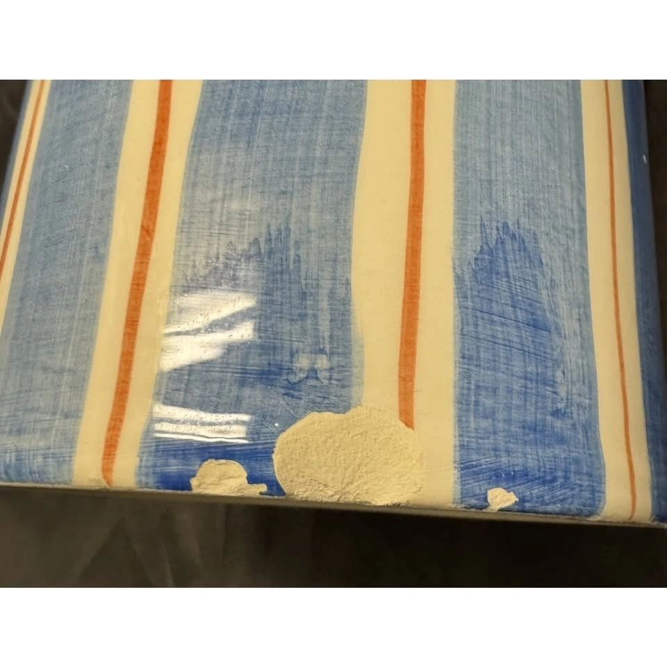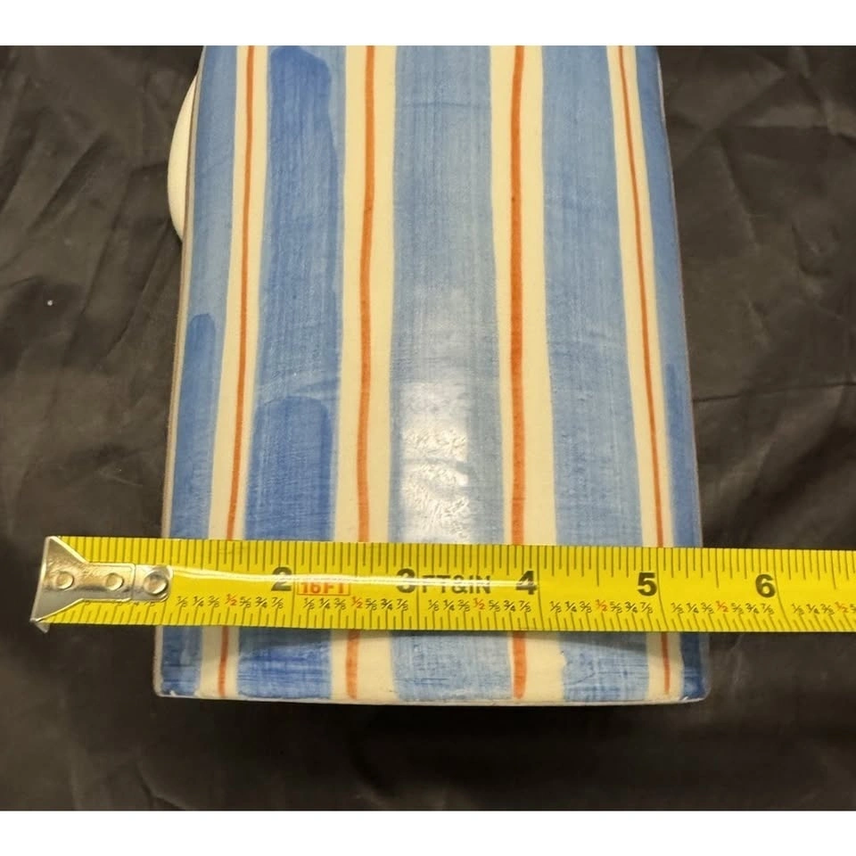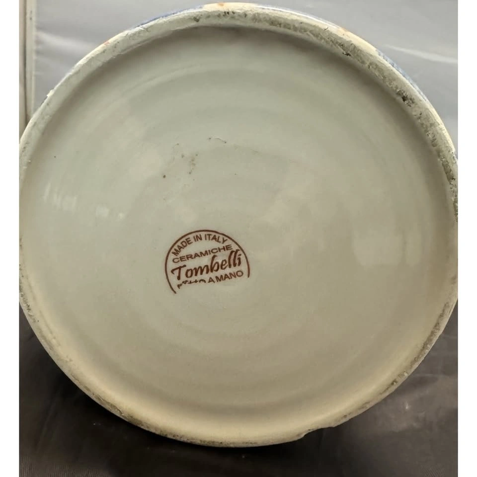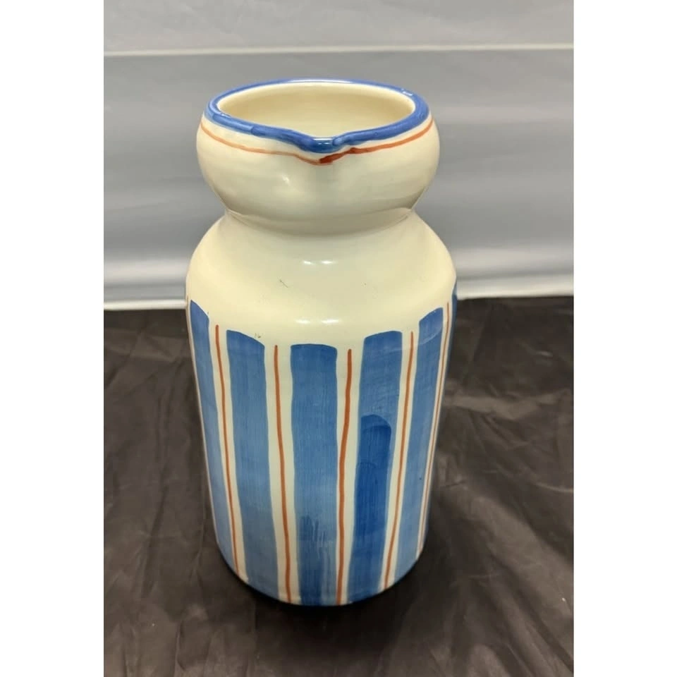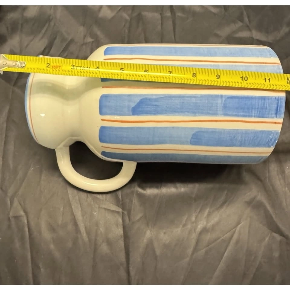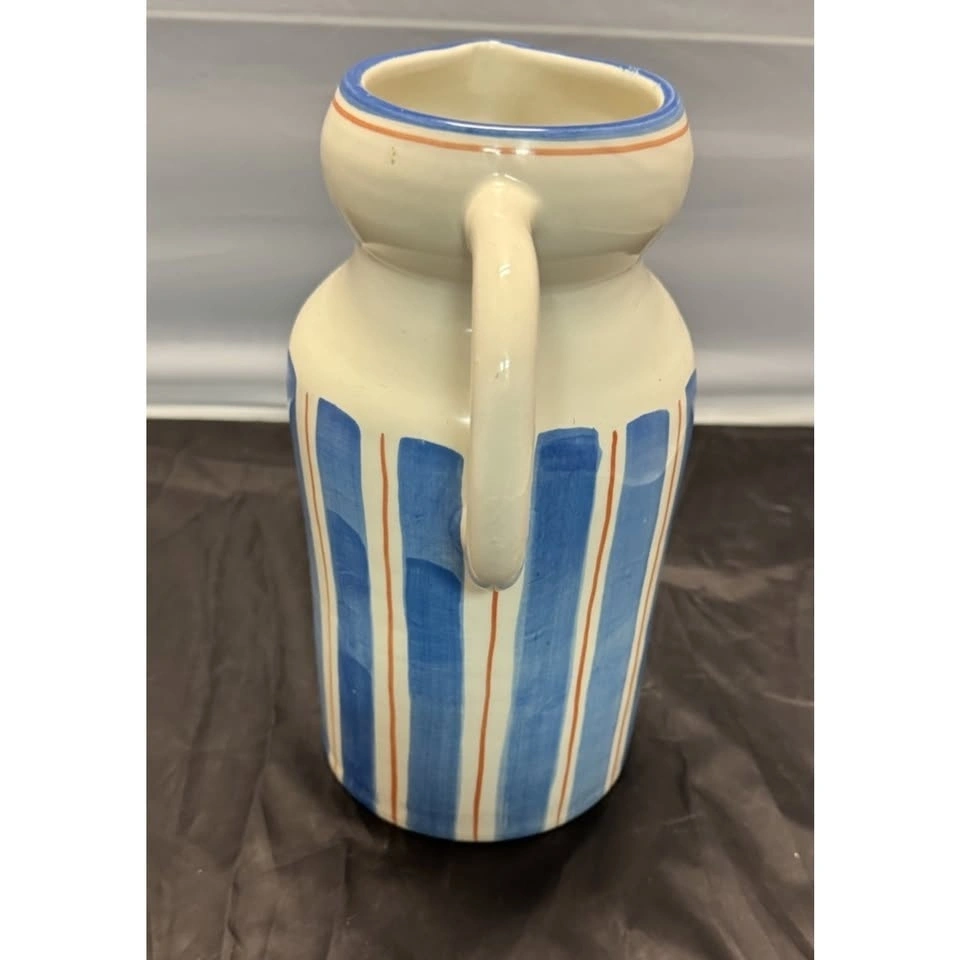 Handmade, large/tall ceramic pitcher made in Italy by Ceramiche Tombelli. Features a multicolor striped pattern, hand painted on a glossy finish. Pottery production technique. Stands at 11-12" tall. A unique addition to any decorative cookware, dinnerware, or serveware collection. Stylish and functional piece for any kitchen or dining space. Pitcher has a chip at bottom, see photos.