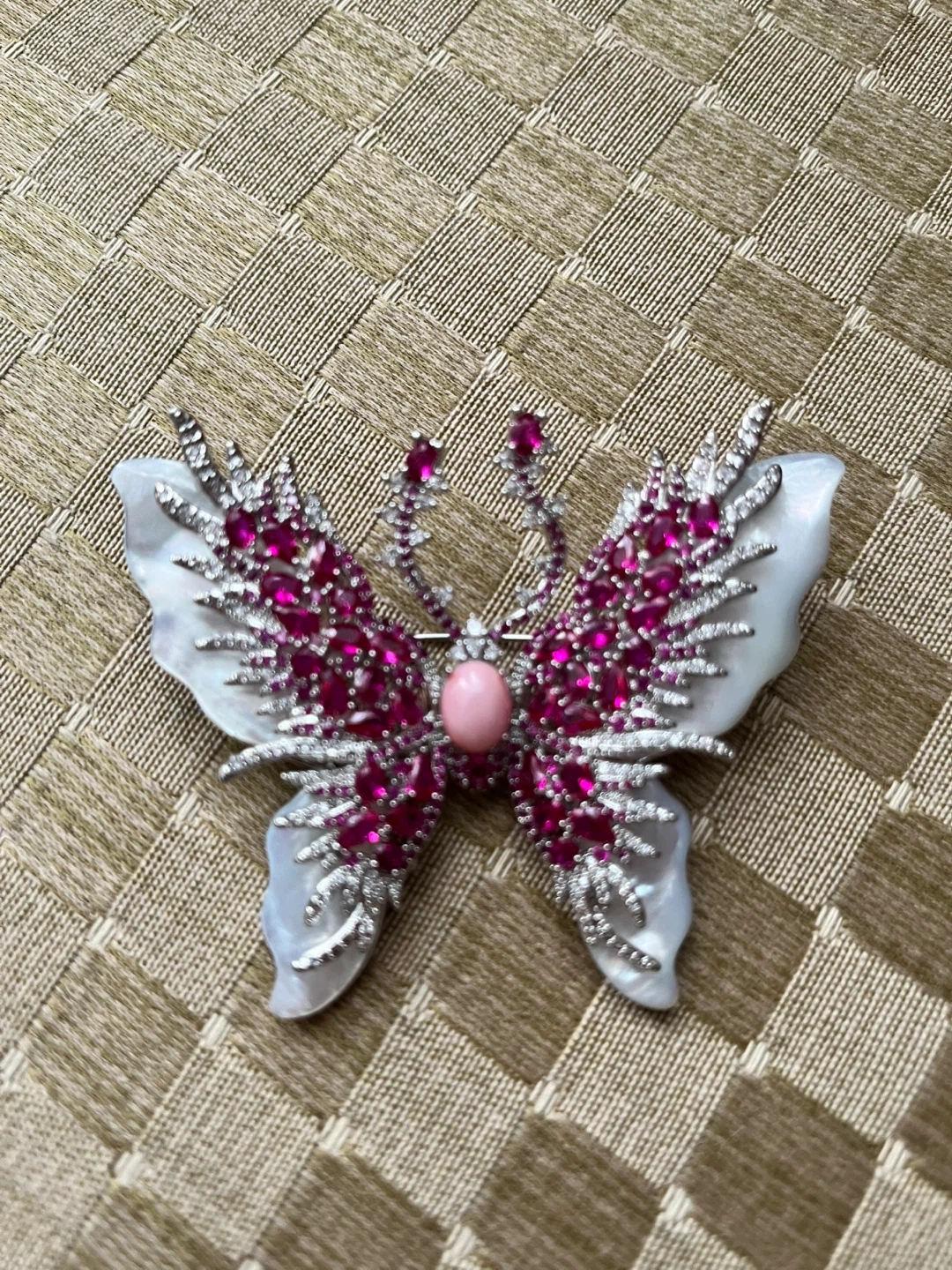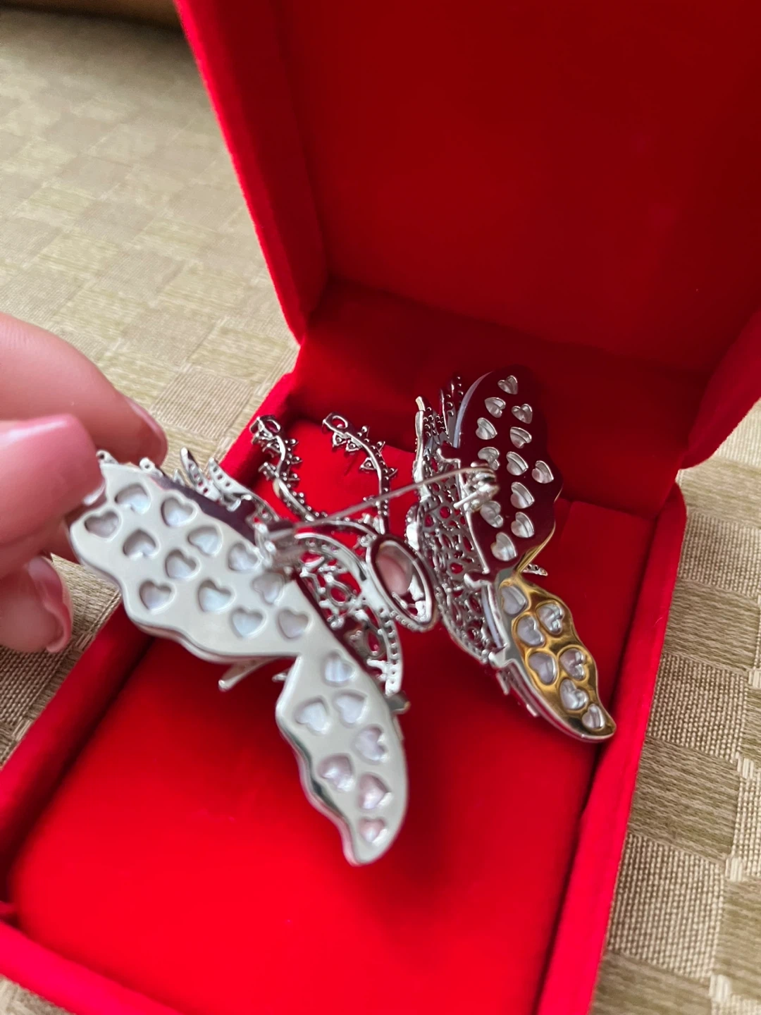 A beautiful butterfly-shaped brooch adorned with shimmering pink gemstones and lustrous pearl accents. This piece comes in a striking red velvet box, ready for gifting or safekeeping. It's a lovely accessory that adds a touch of elegance!