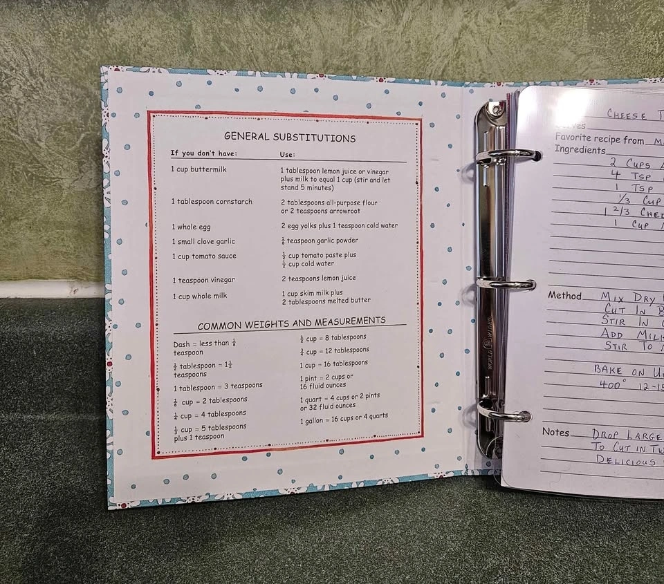 Includes everything you need to organize your recipes. 100 Recipe pages, 6 tab dividers, 2 splash guards, 6 vinyl sleeves, Measurements, hints & cooking tips. Book measures 8" X 9" X 1.5". Pick up is Appleby and Fairview in Burlington.