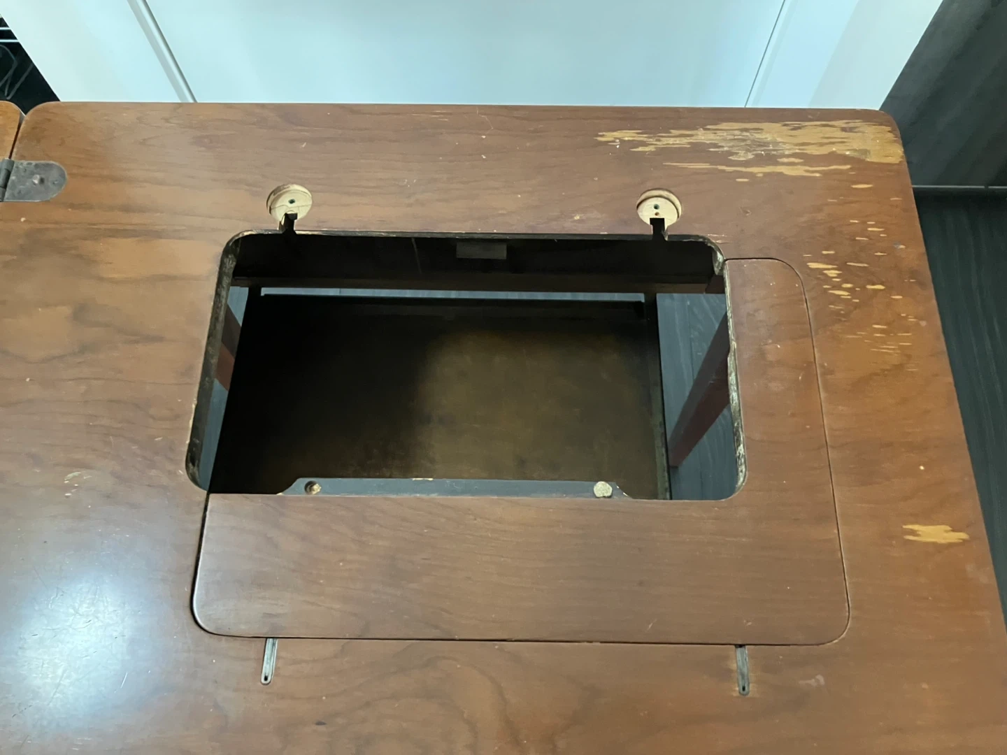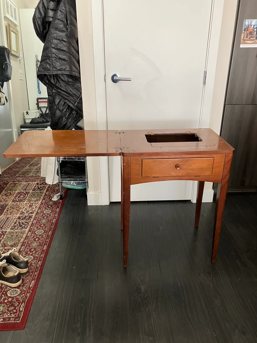 A wooden sewing machine table with a flip-top surface and a single drawer. It has a classic design and can be folded down for storage. Perfect for any crafter looking for a dedicated sewing space!