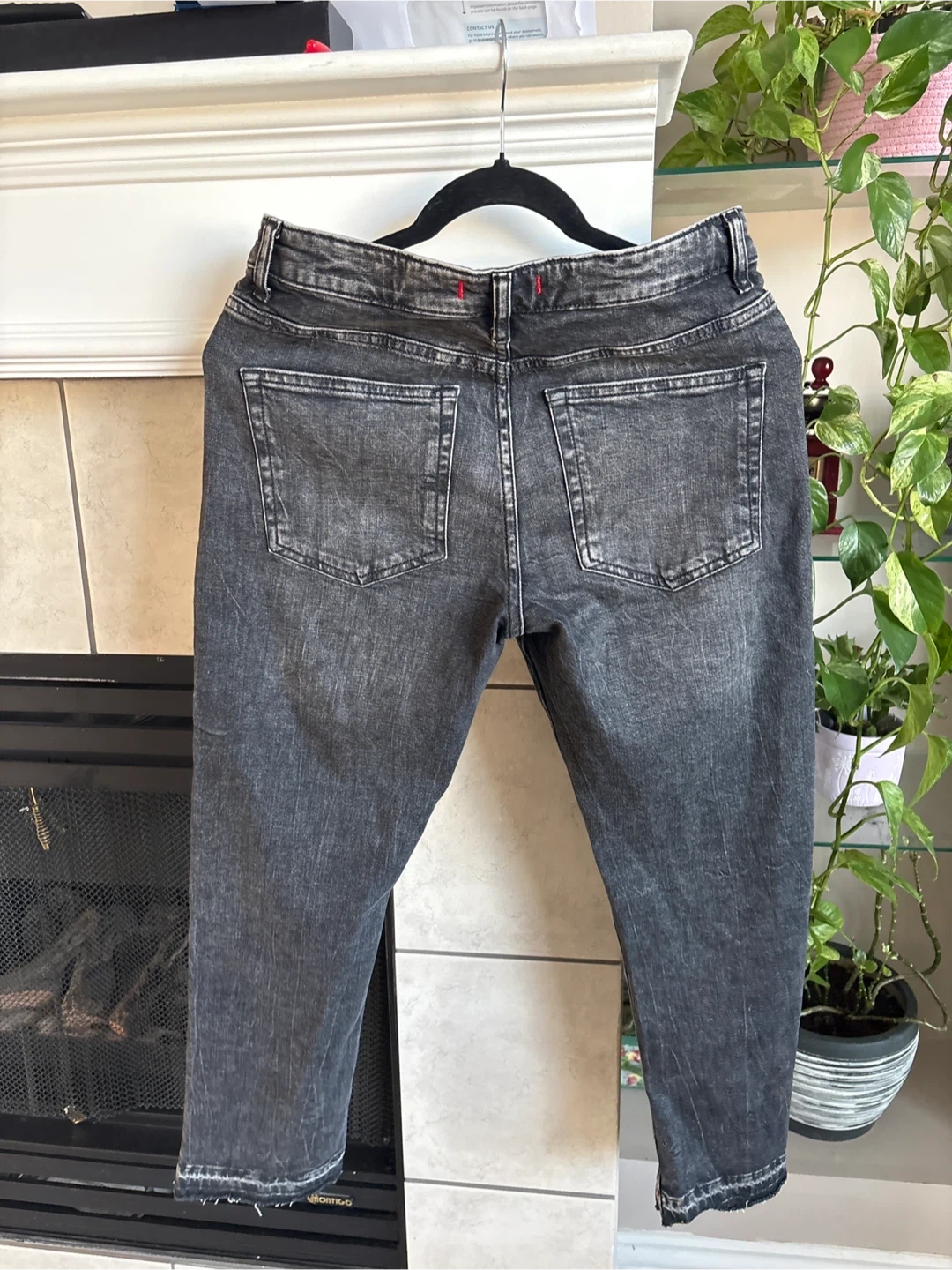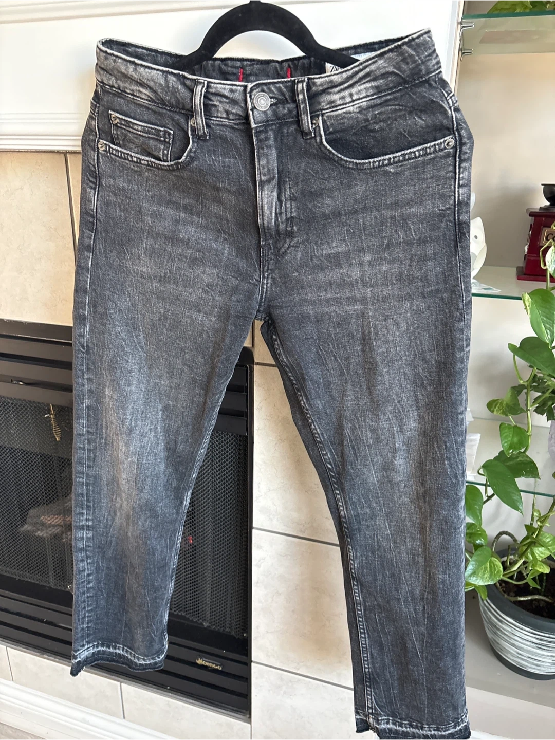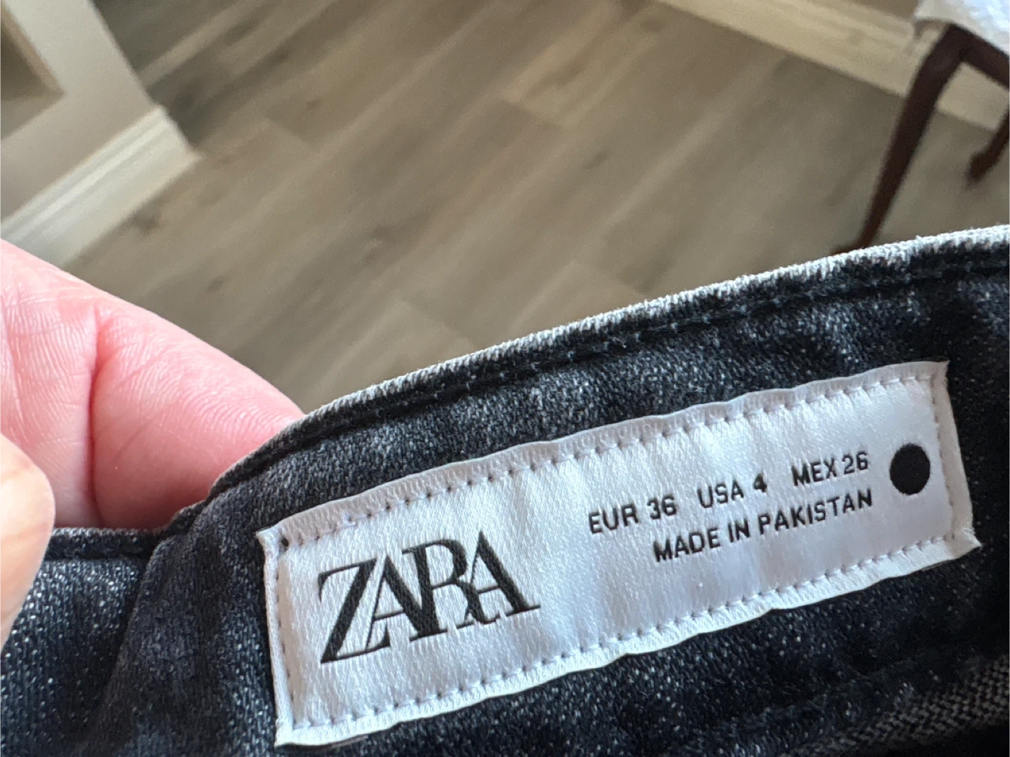 ZARA women's grey denim jeans. Made in Pakistan. Size EUR 36, USA 4, MEX 26. They're a stylish option for casual wear.