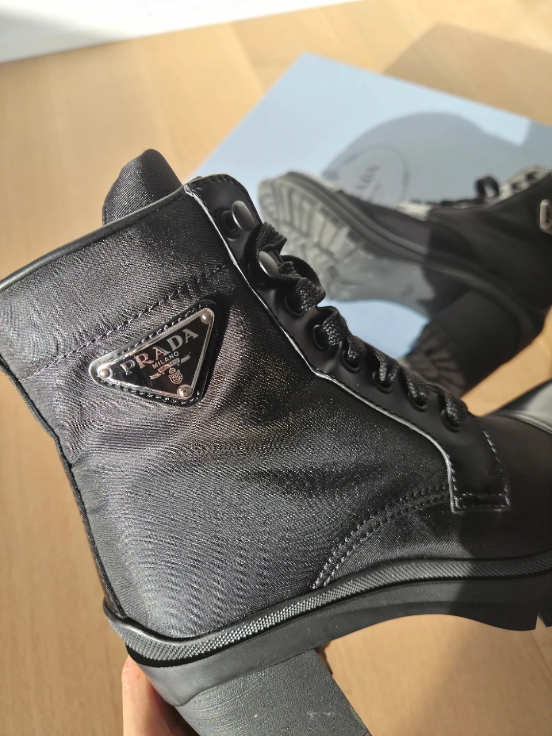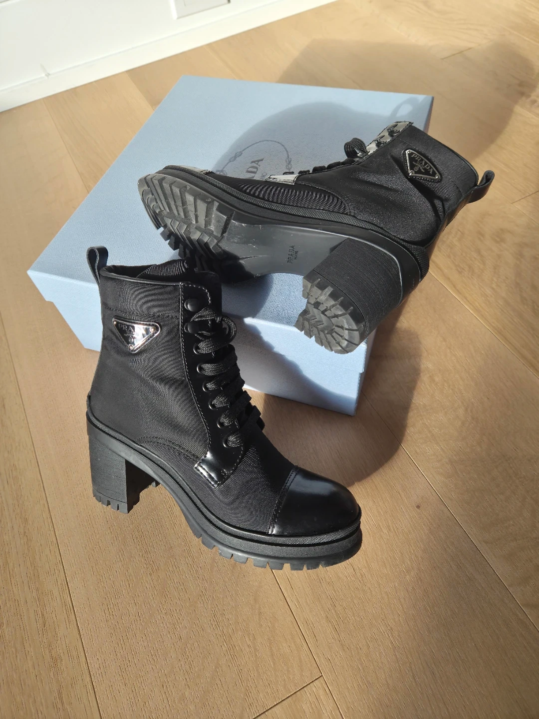 Stylish Prada combat boots in black. These boots are made from durable nylon with patent leather accents. They feature lace-up closure and a sturdy block heel and slim fit. Comes with the original box and packaging. Price negotiatable.