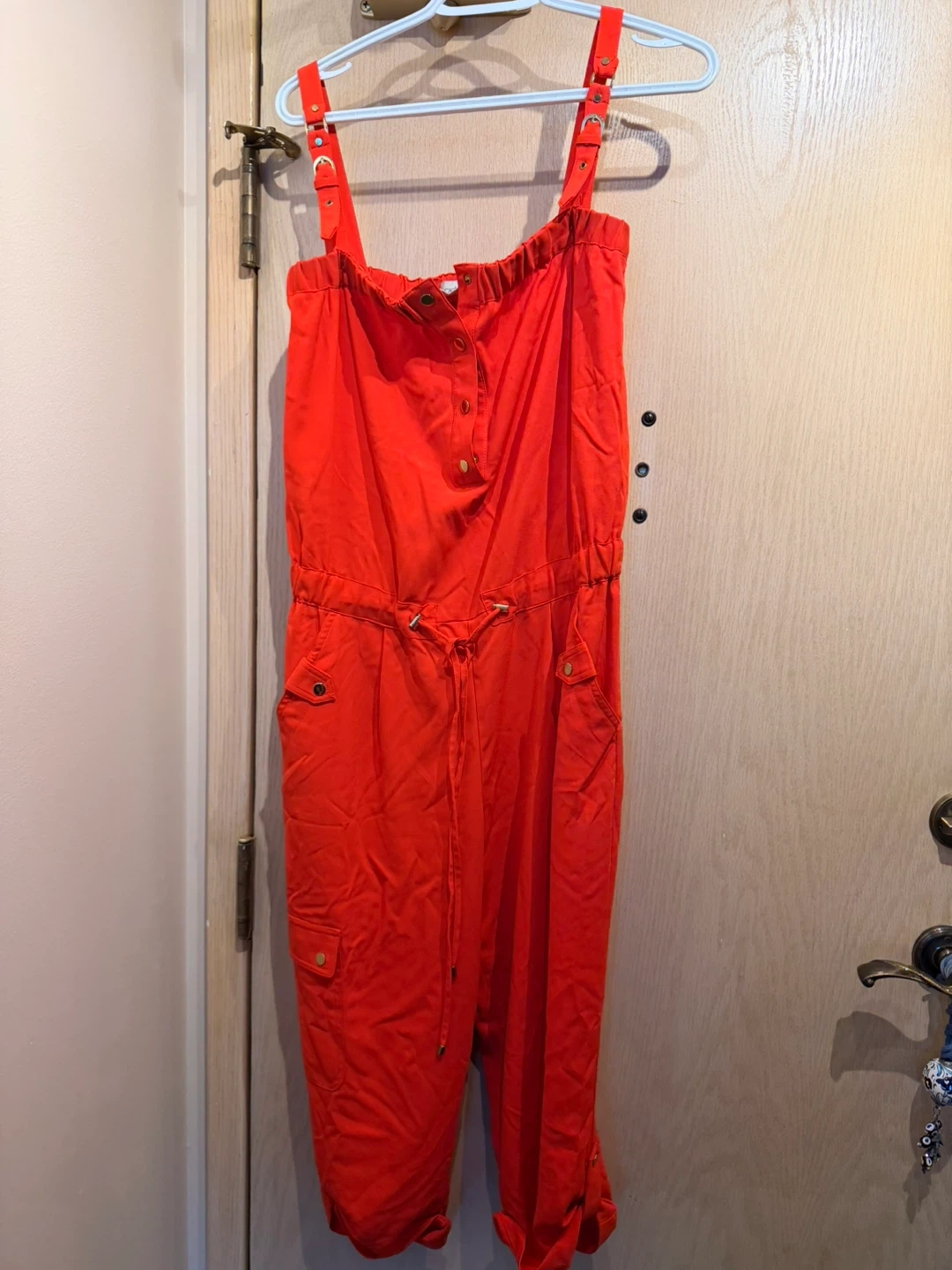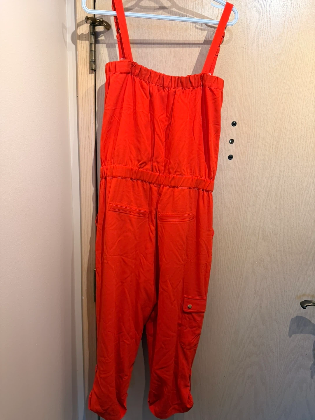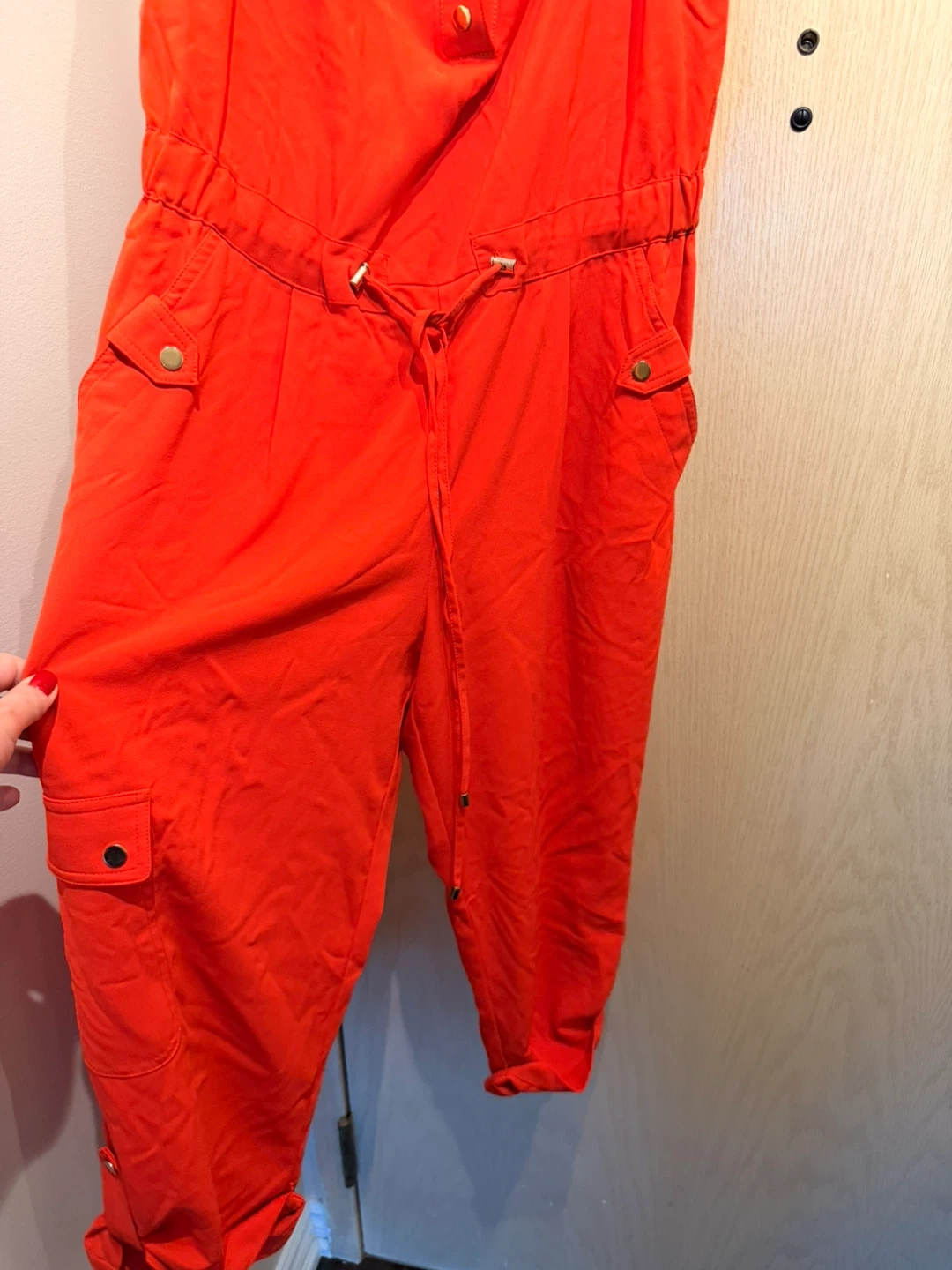 This red Cache jumpsuit is a size medium. It's made of 95% polyester and 5% spandex. It has a drawstring waist and cargo pockets.