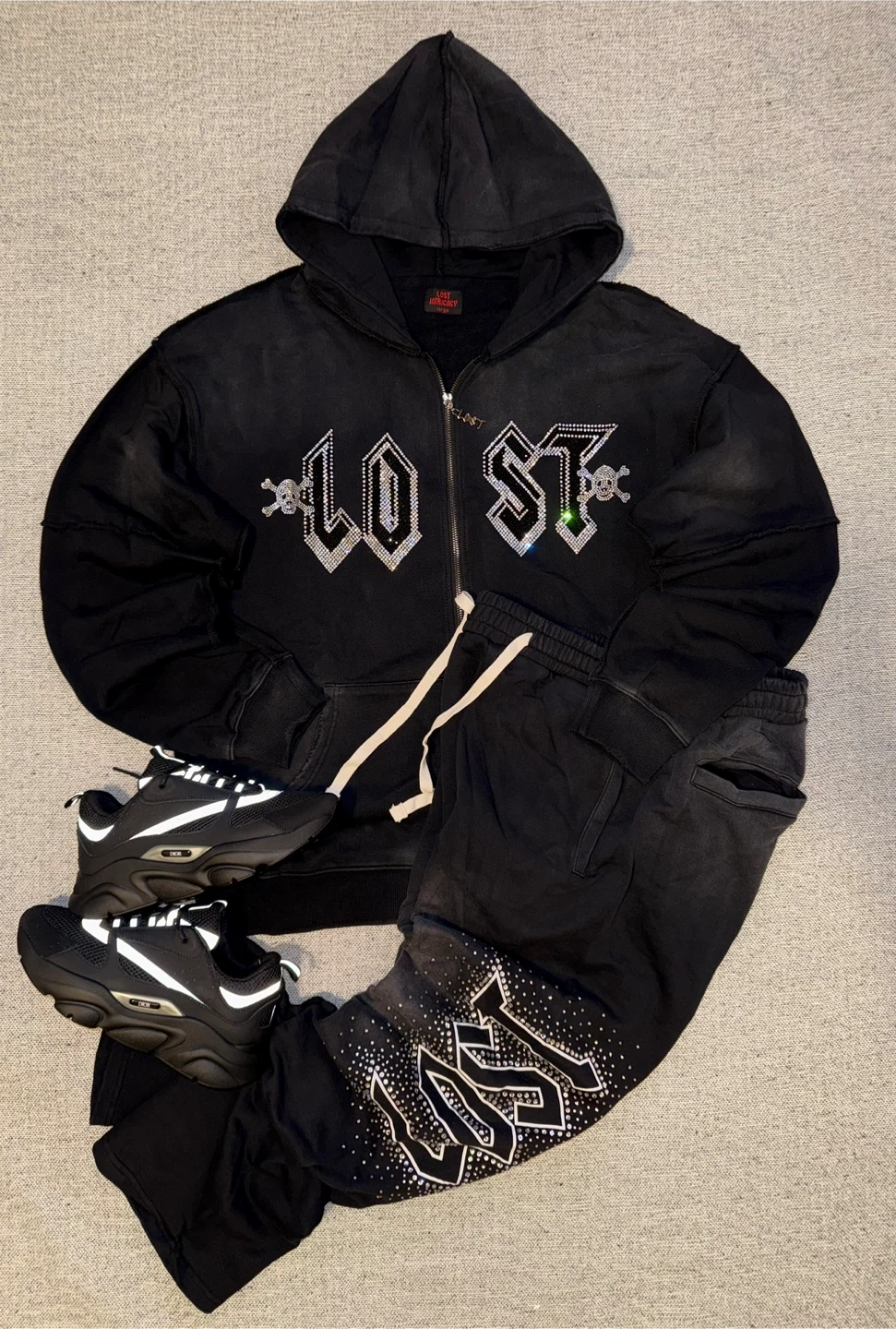 This black zip-up hoodie and jogger set features "LOST" text embellished with rhinestones on both pieces. It's a comfortable tracksuit for casual wear. Cotton blend material.