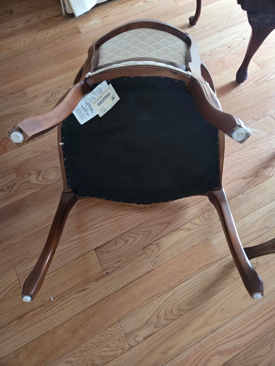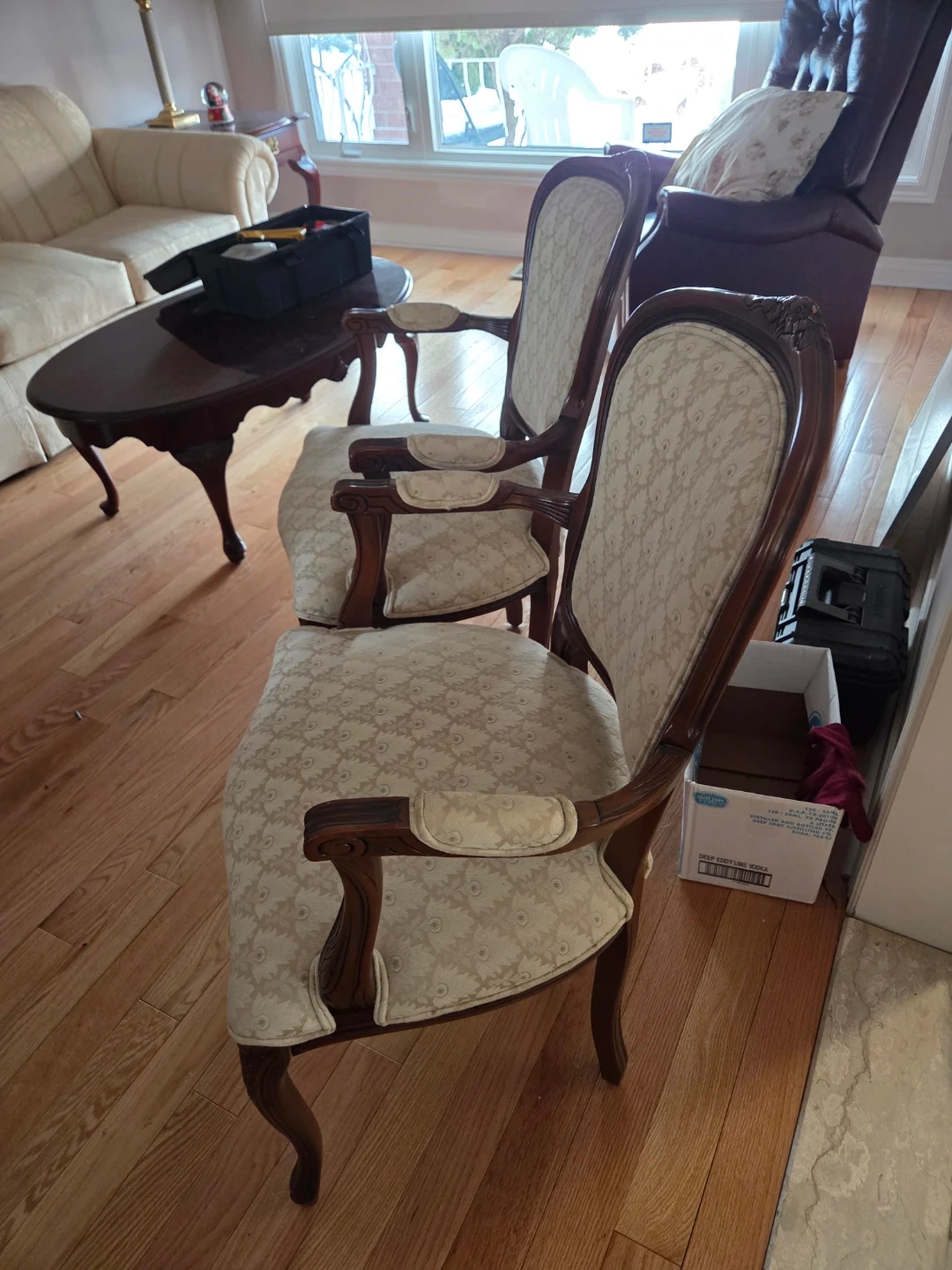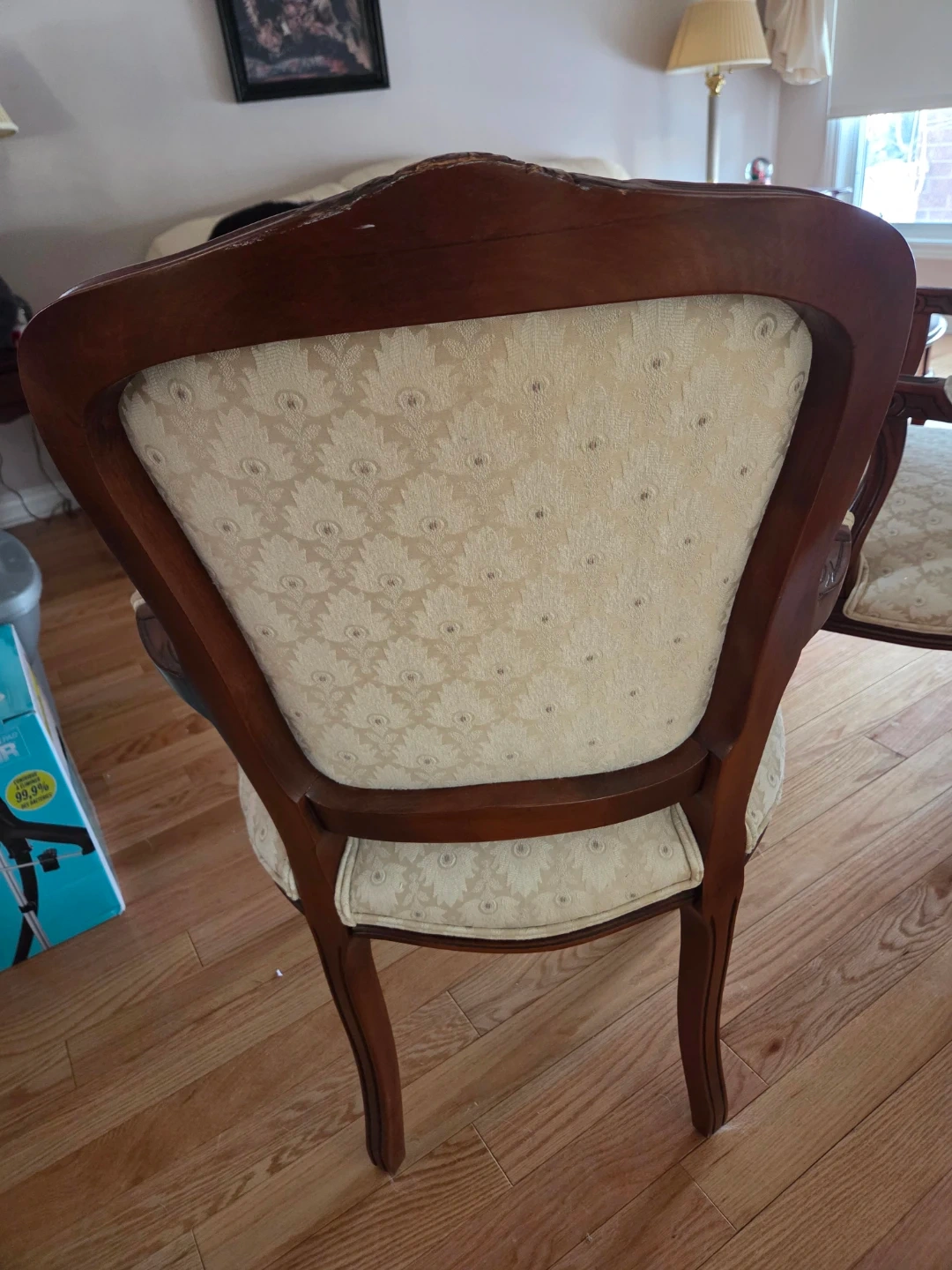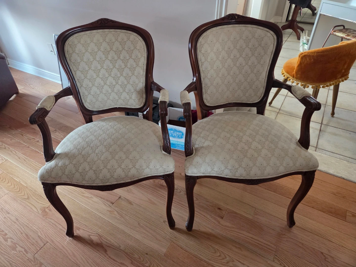 Beautiful set of two white upholstered wooden chairs. In great used condition. Fabric is in excellent condition. Some wear to the wood at top of chair as shown in last 2 photos. Measurements as shown in photos.