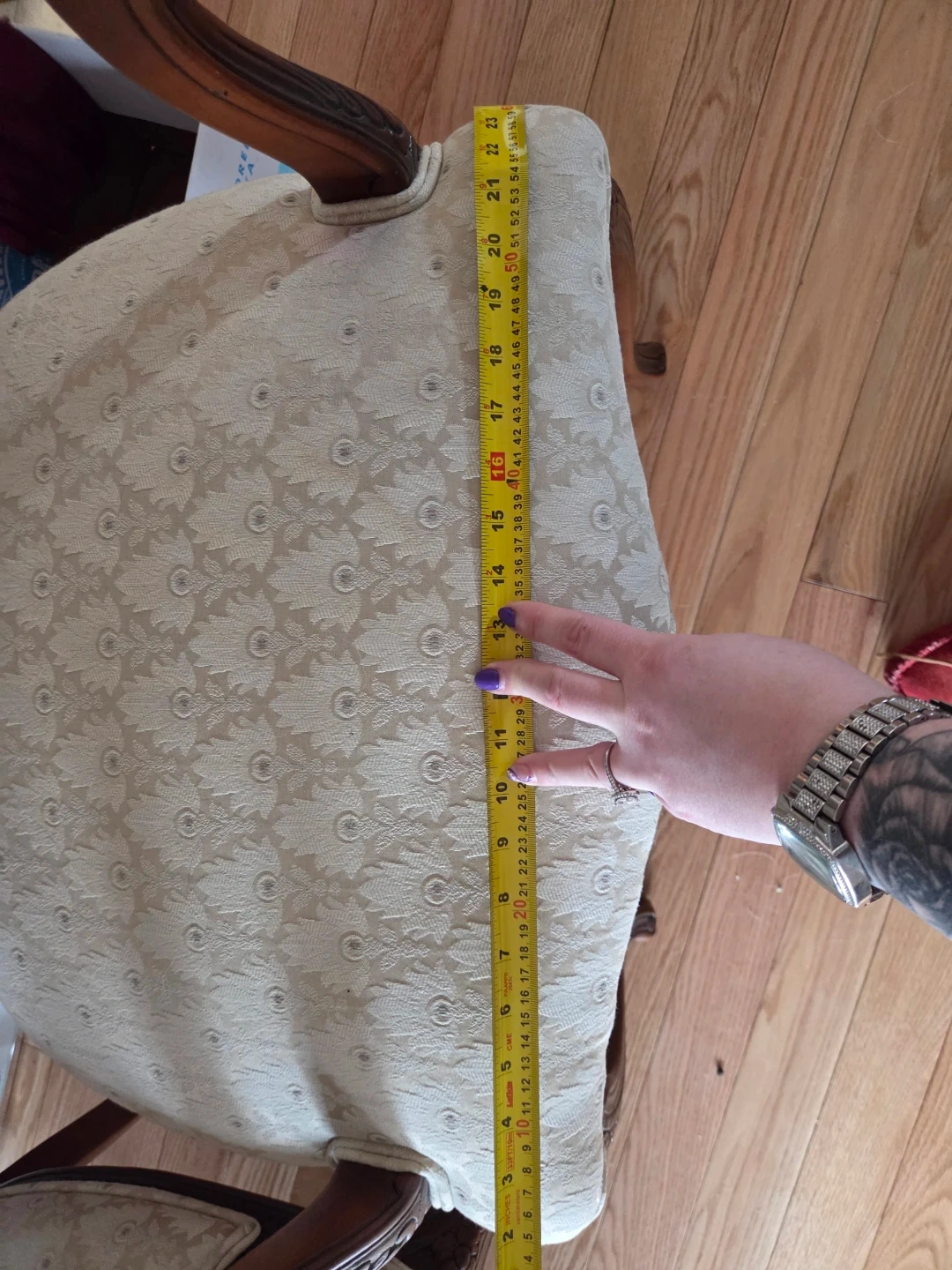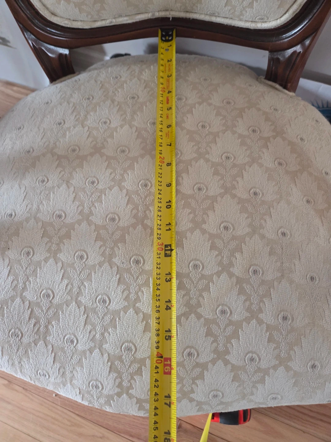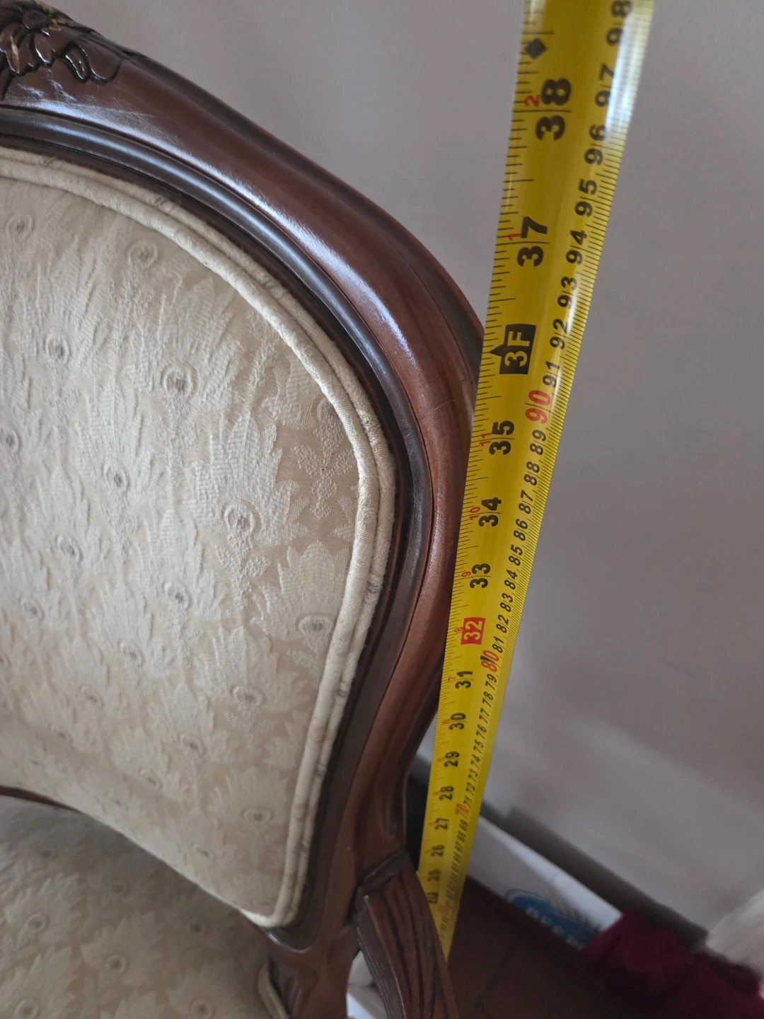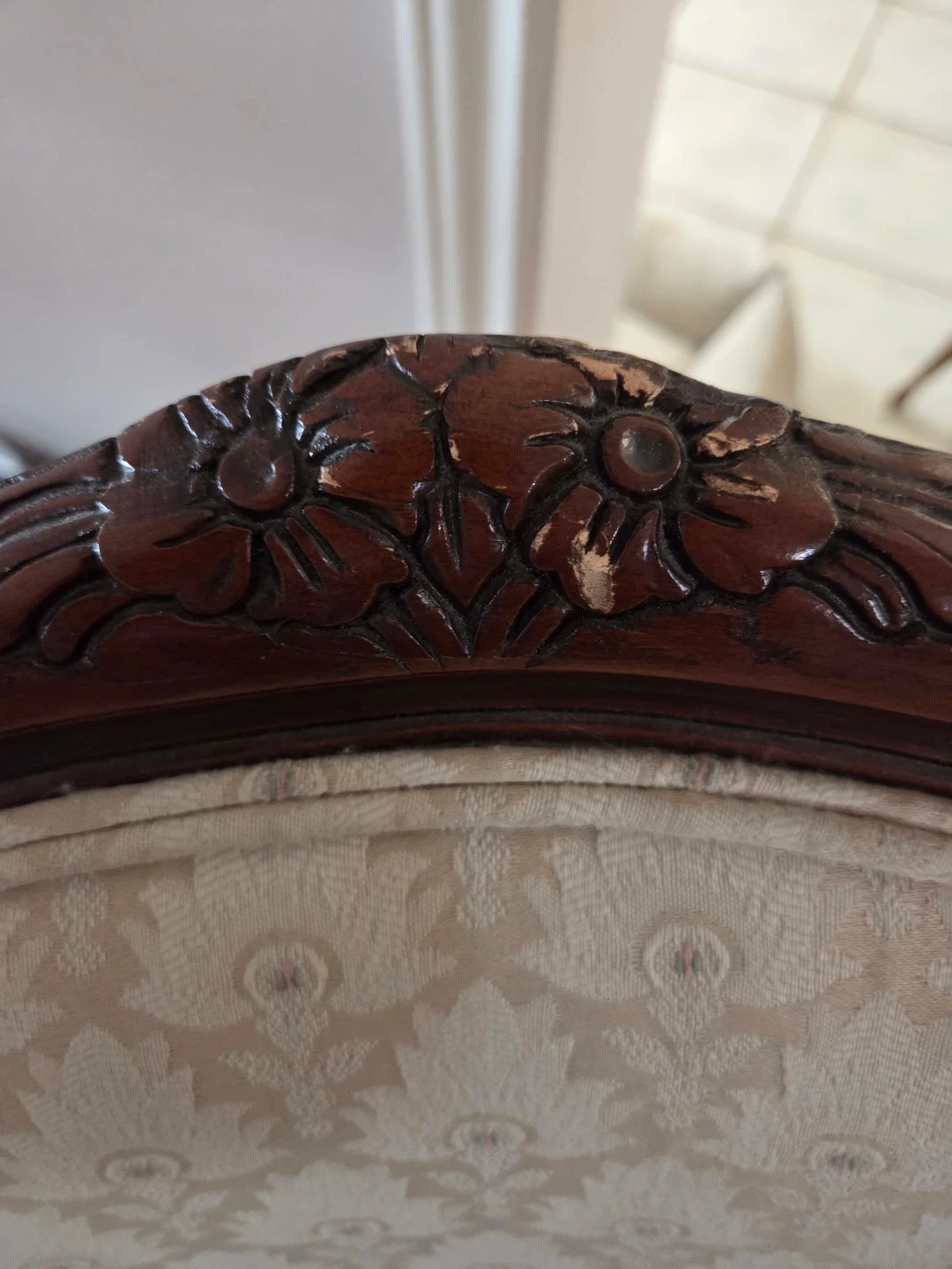 Beautiful set of two white upholstered wooden chairs. In great used condition. Fabric is in excellent condition. Some wear to the wood at top of chair as shown in last 2 photos. Measurements as shown in photos.