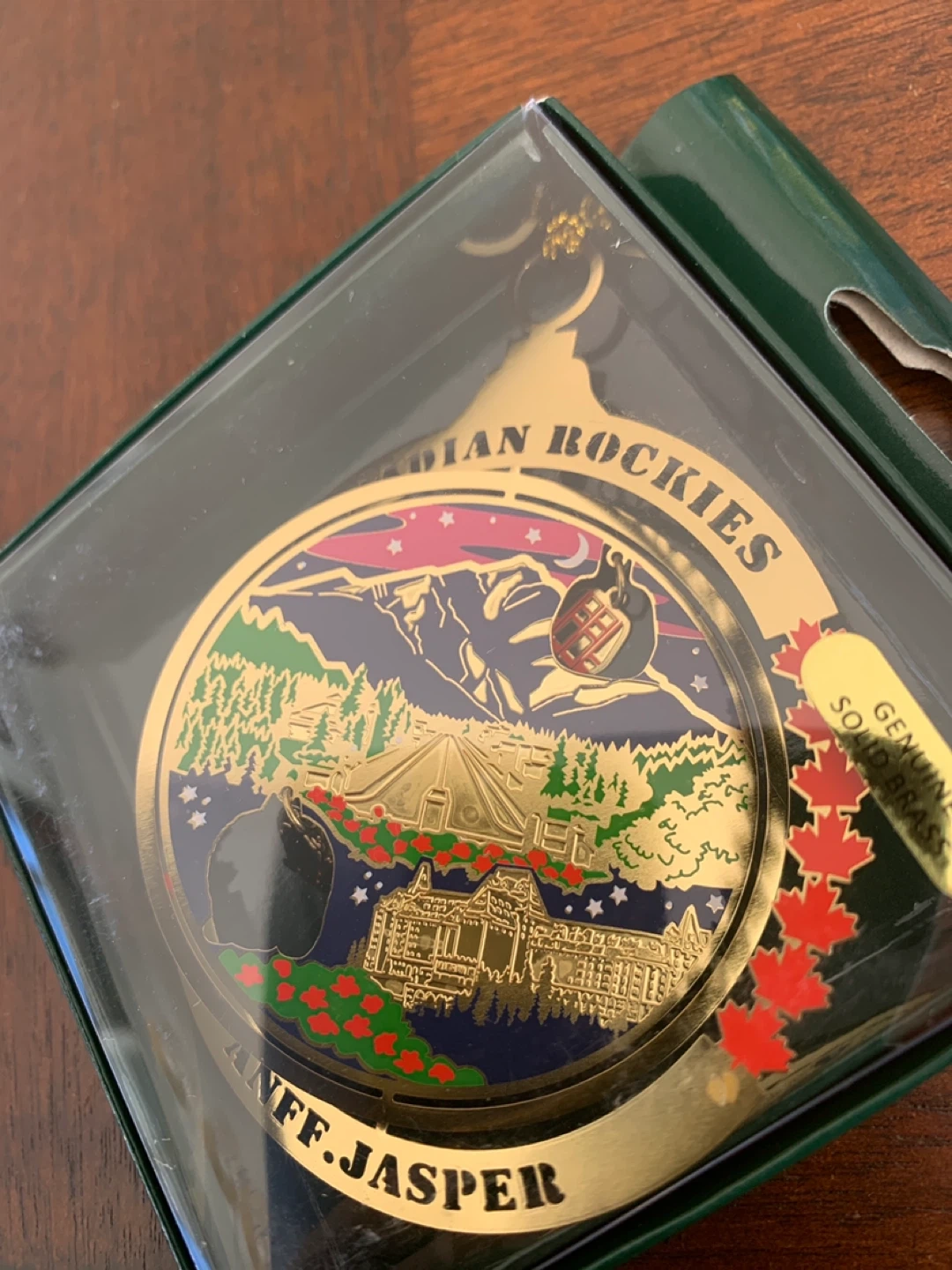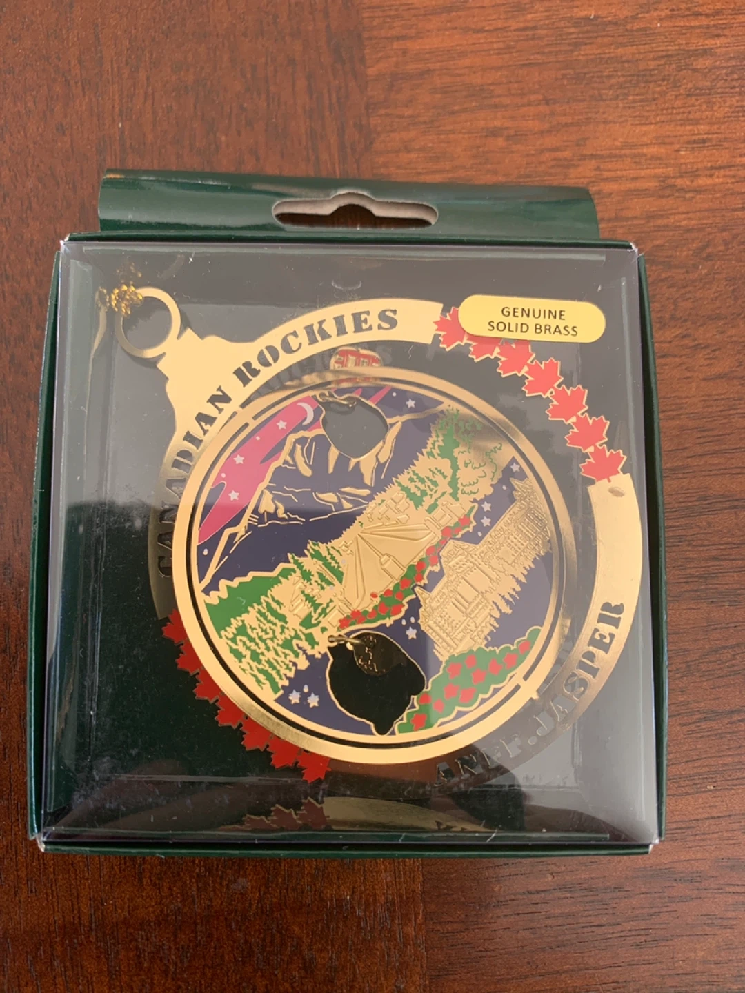 Genuine solid brass collectible Christmas ornament featuring Canadian Rockies Jasper. It's made in PRC.