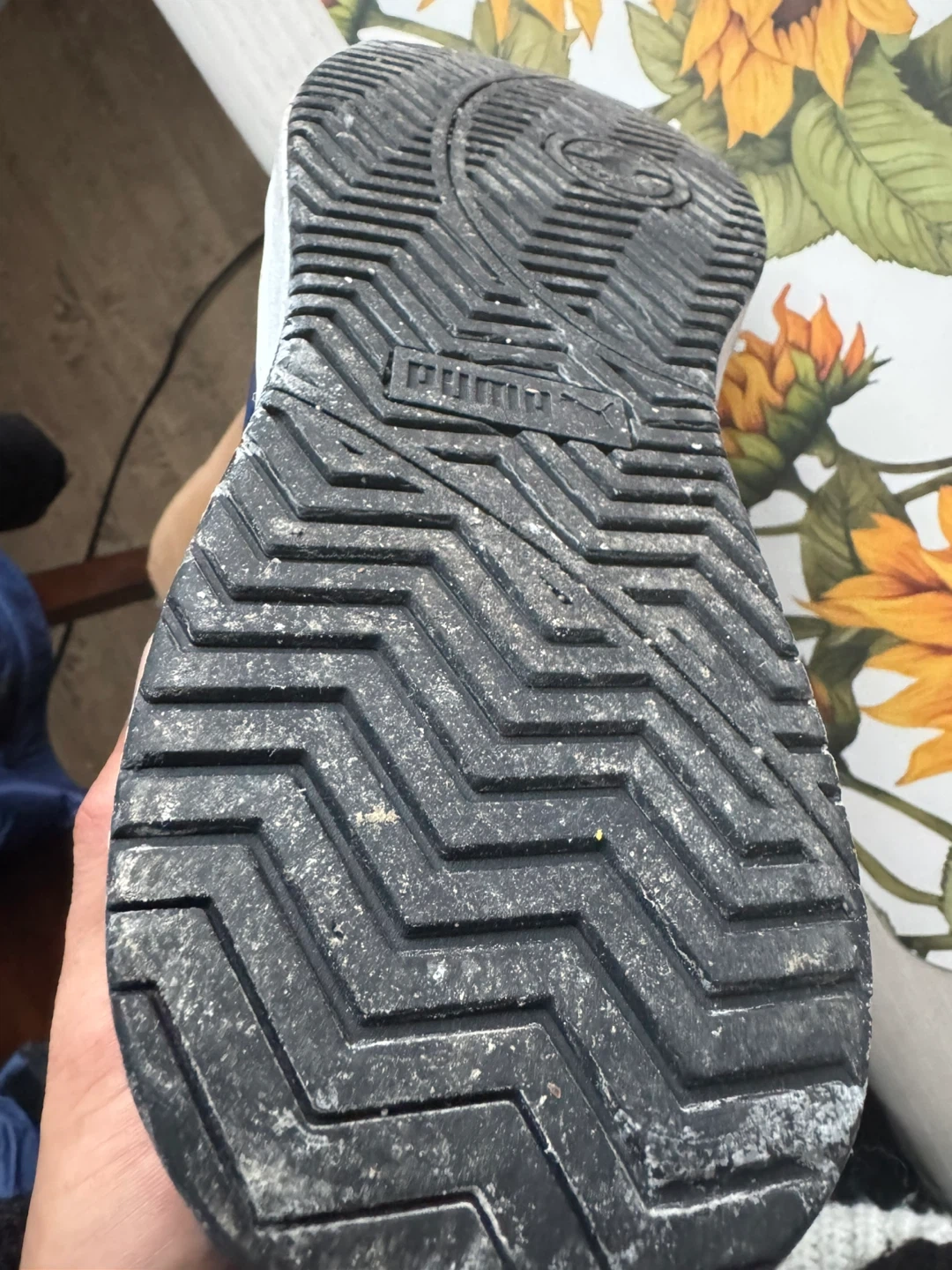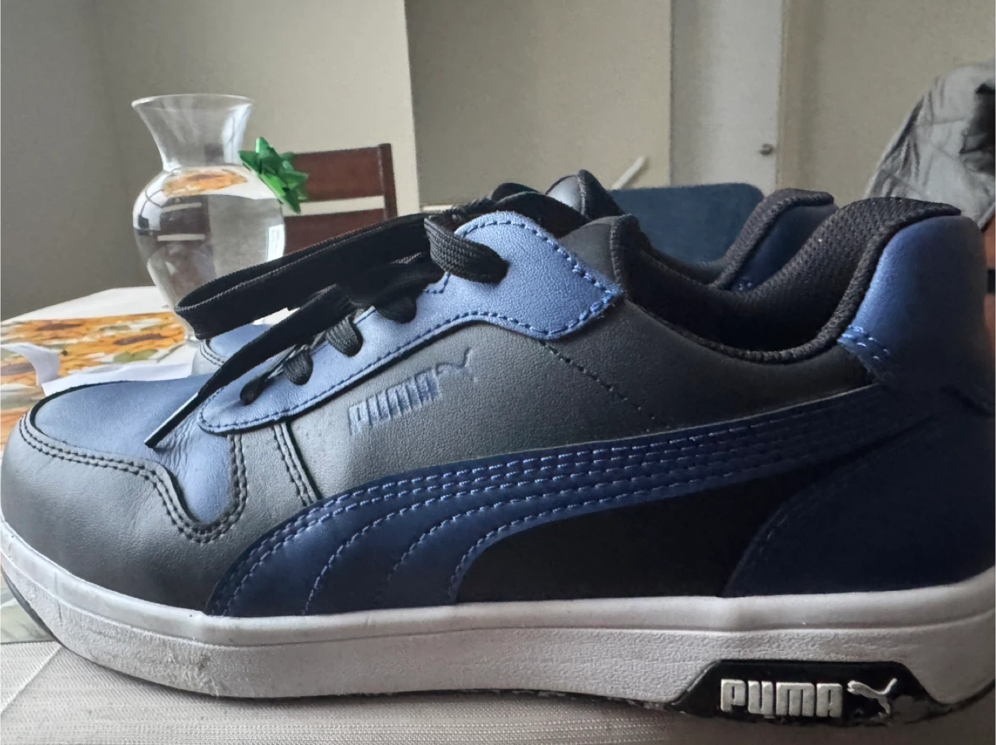 These Puma sneakers are black with blue accents. They have a classic lace-up closure. Durable rubber sole provides good traction.