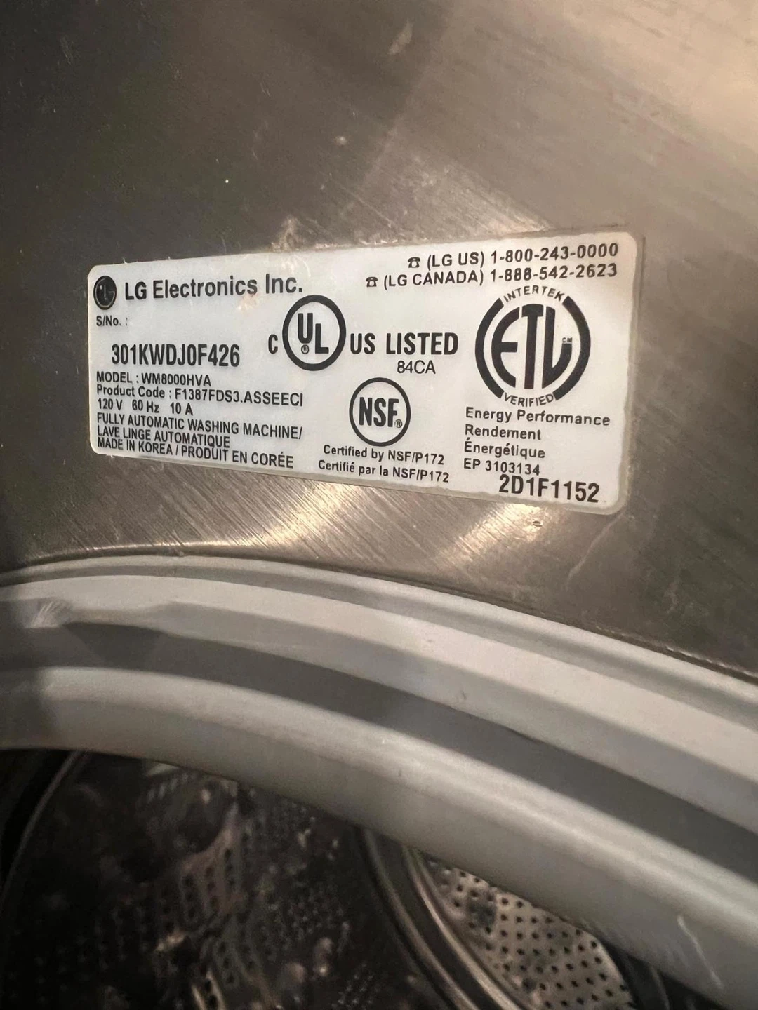 LG Direct Drive front load washing machine in a dark grey finish. It's a 120V, 60 Hz, 10 A appliance. Features automatic washing with steam. Made in Korea. This is a great appliance for busy households!