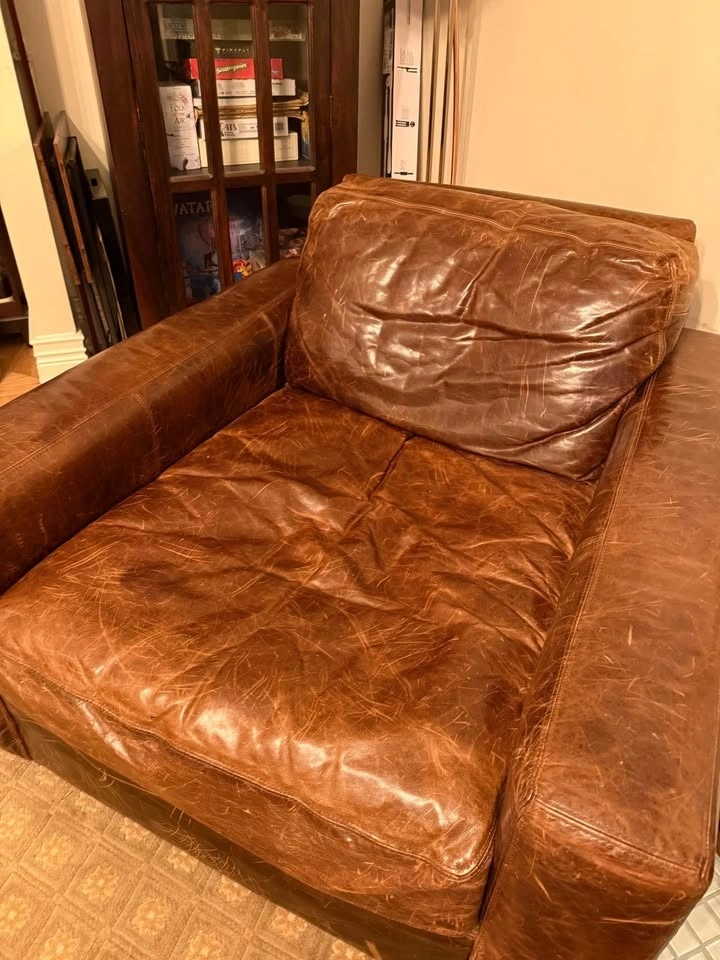This is the Maxwell distress leather. If you scratch it, it’s absorbed into the leather and looks more weathered. Supposed to be the intended look. Matching oversized 9 foot sofa if interested.