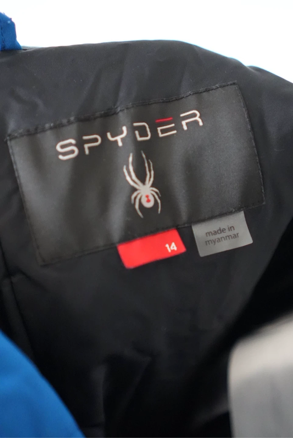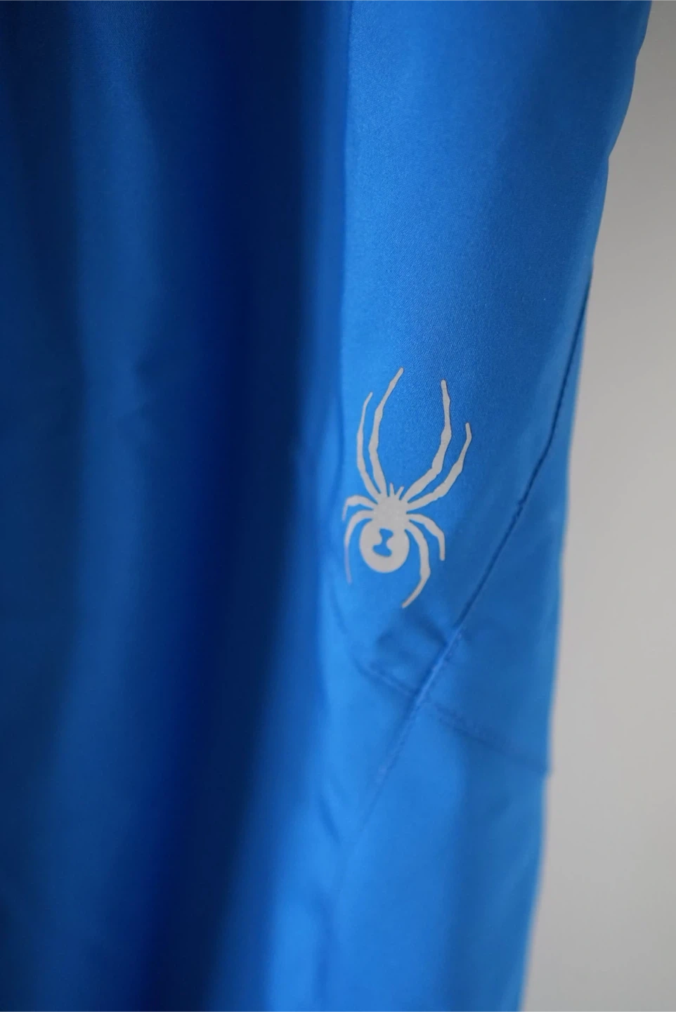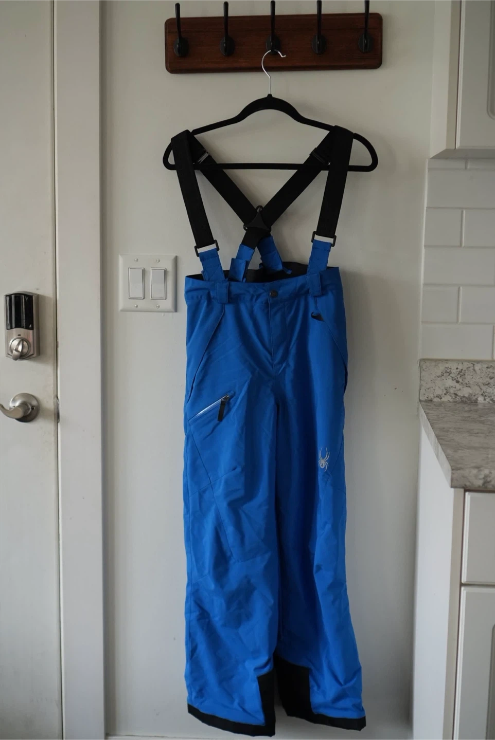 Bright blue ski or snowboard pants are from Spyder. They feature adjustable suspenders and a zipper pocket on the front. The size is 14.