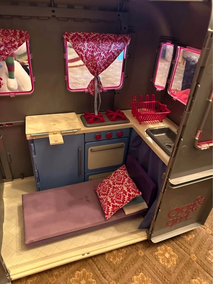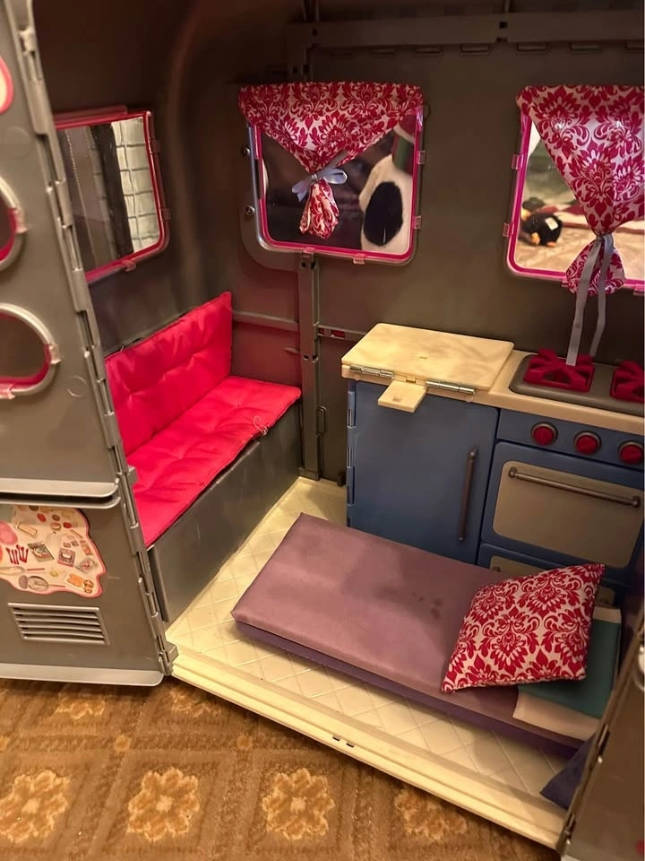 Great condition trailer for your 18-inch dolls, the "Our Generation R.V. Seeing You Camper!". Includes a few extra items, like an extra bed as seen in the pictures. More pictures available upon request.