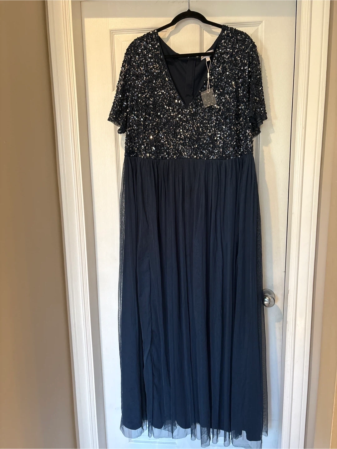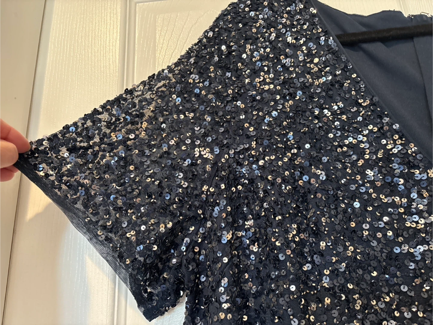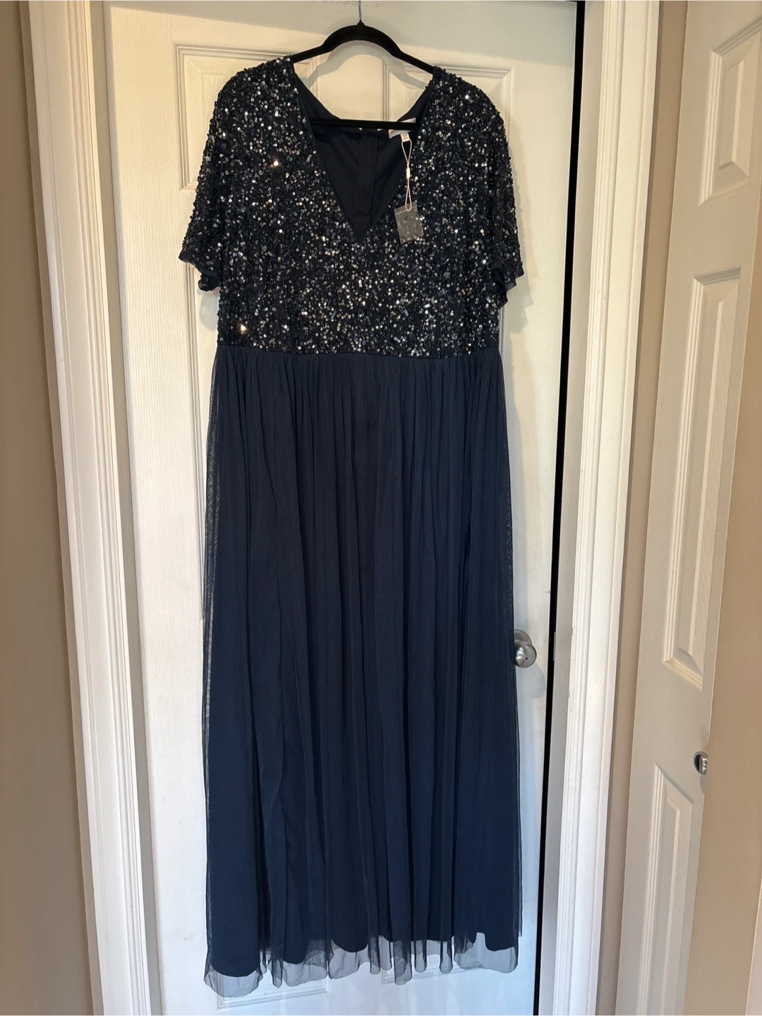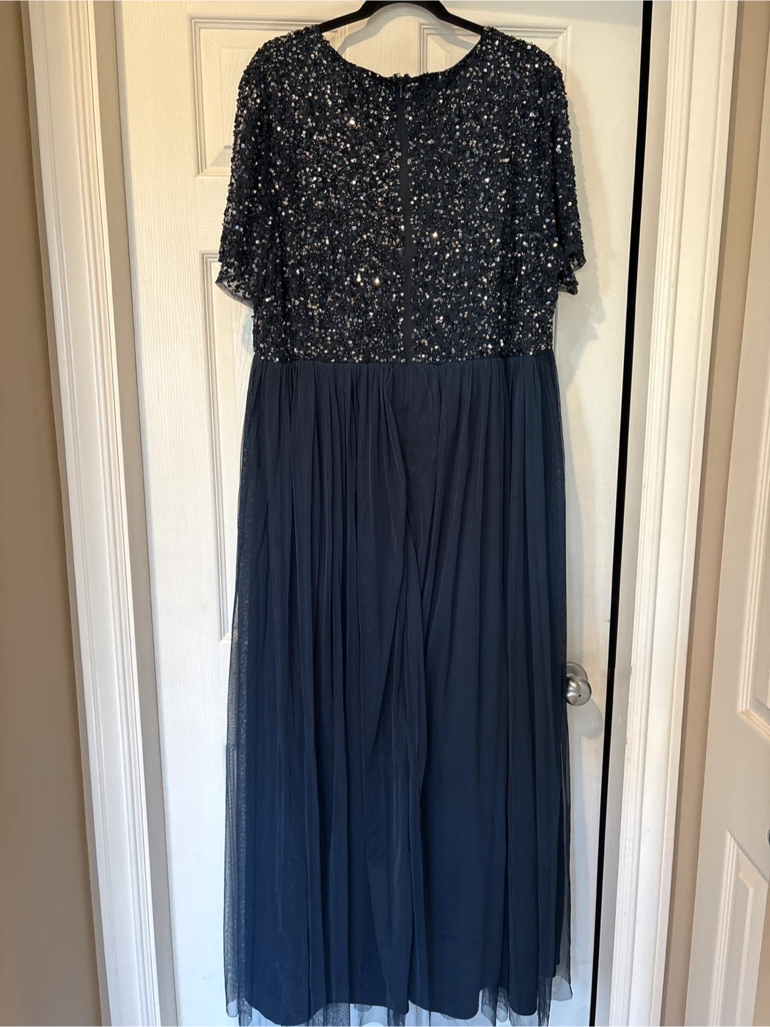 This Adrianna Papell gown features a sequined bodice and a flowy navy blue tulle skirt. It has short sleeves and a V-neckline. Includes extra sequins.Size 3X or XXL pick up walnut grove Langley