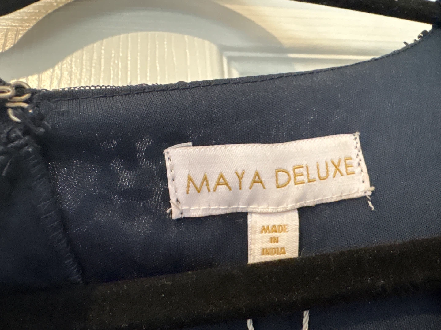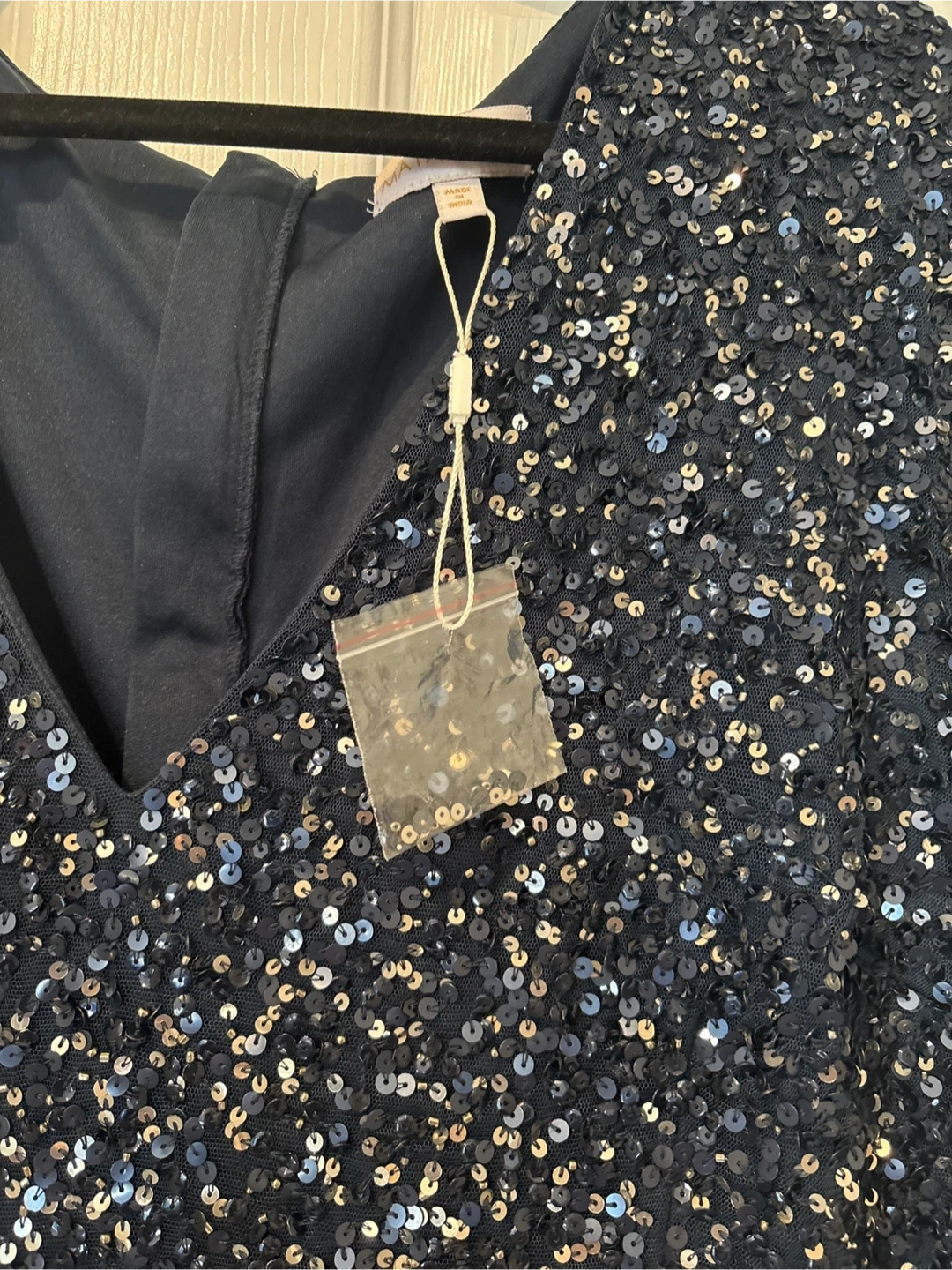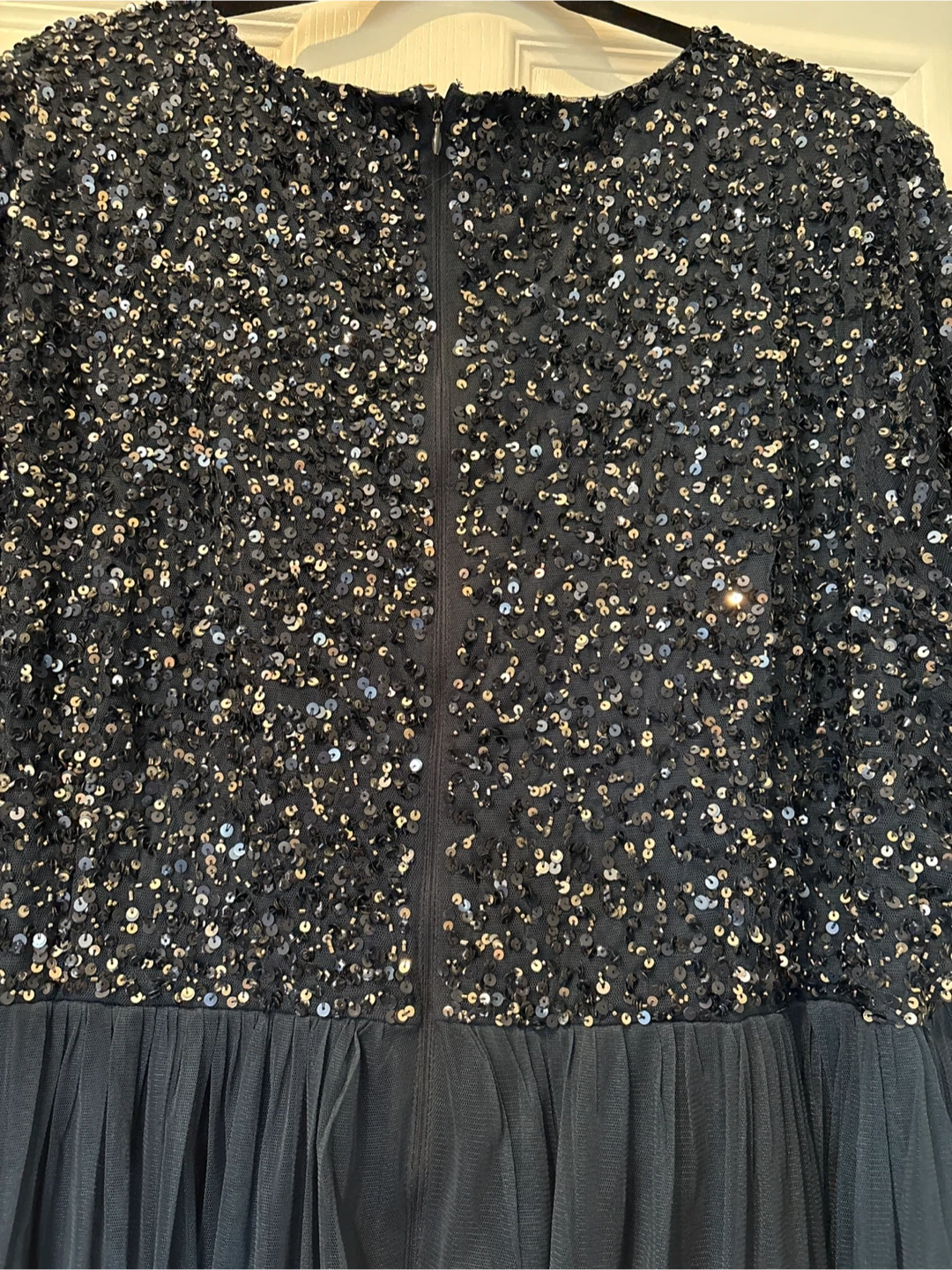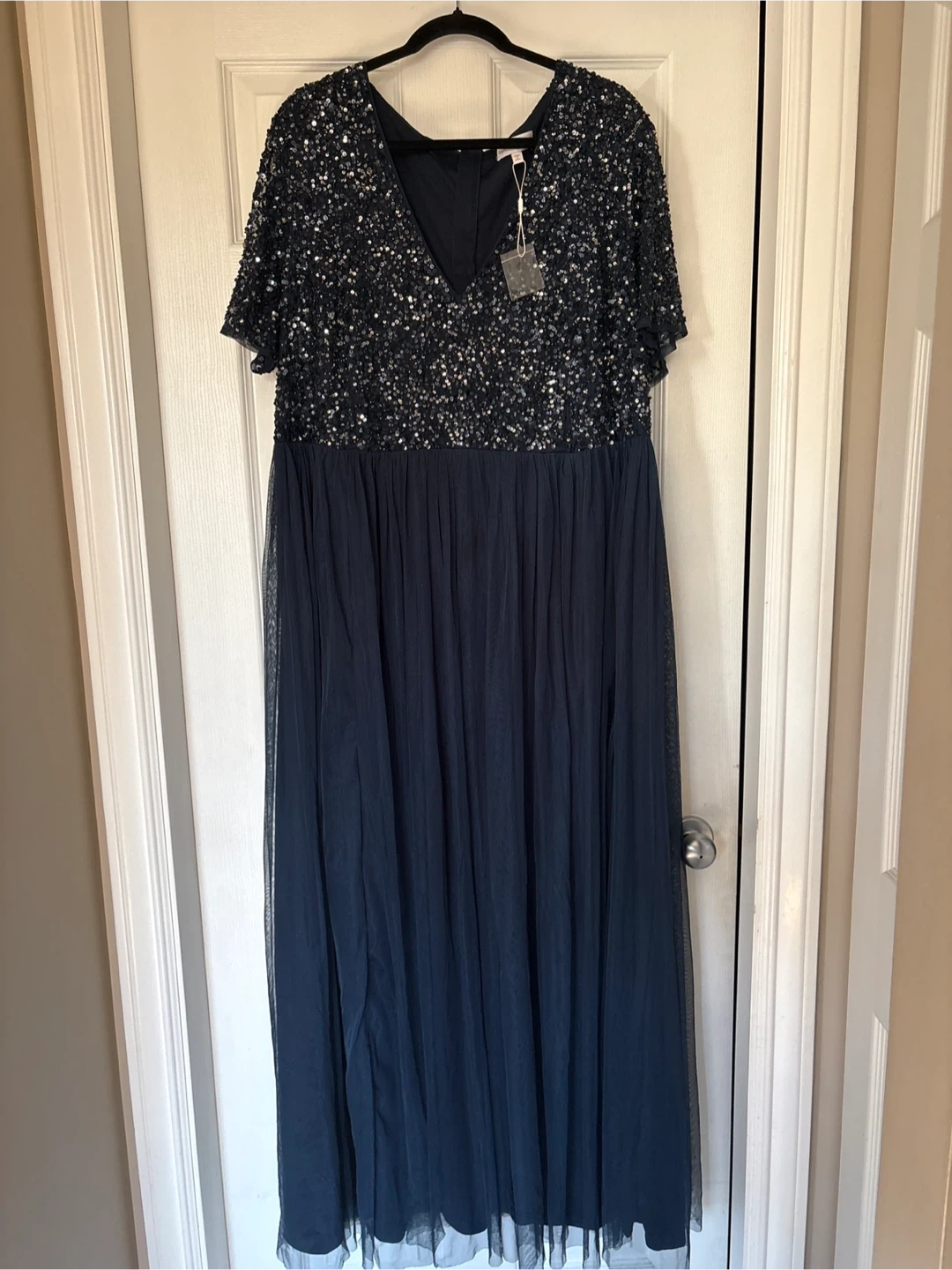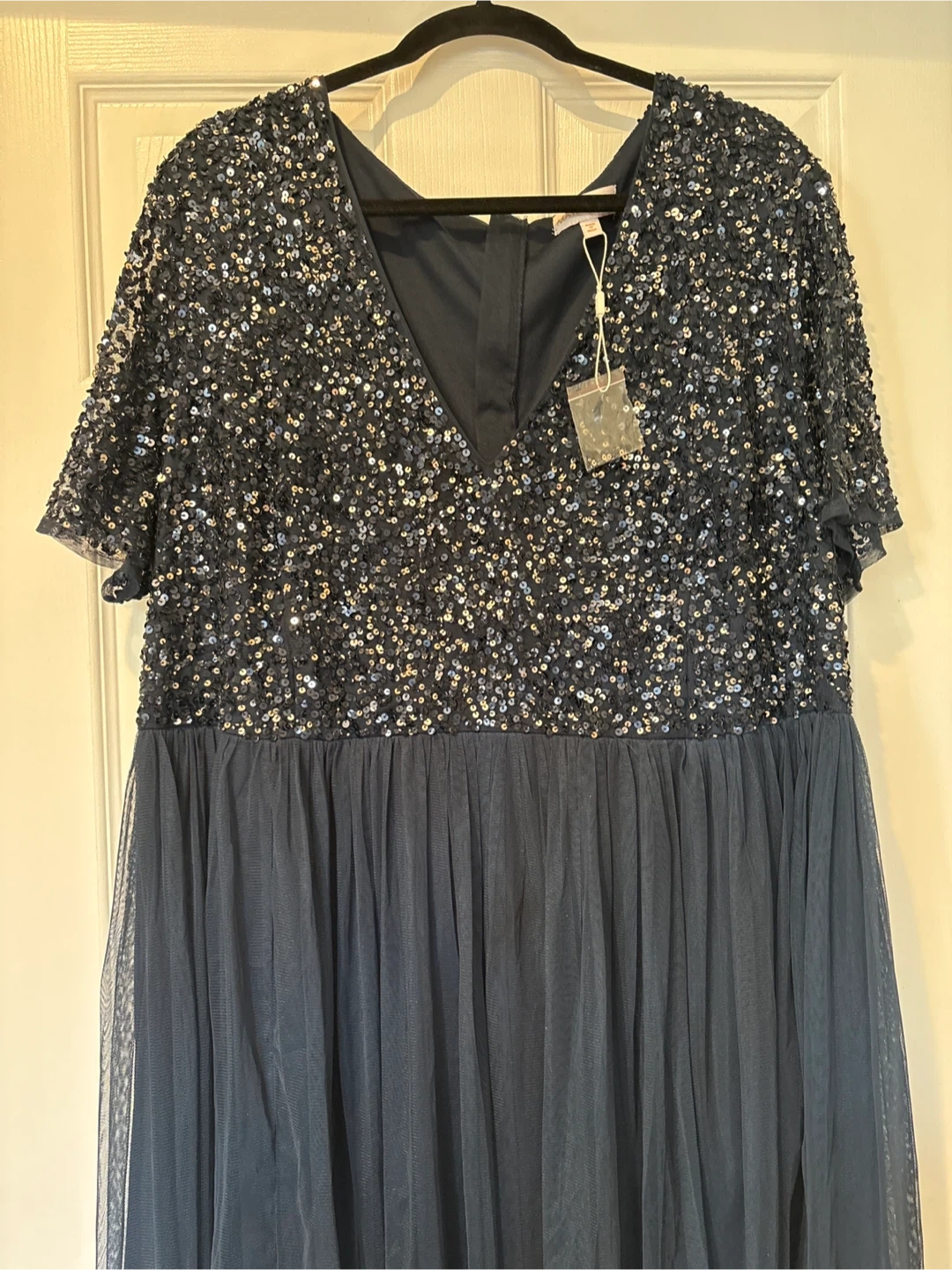 This Adrianna Papell gown features a sequined bodice and a flowy navy blue tulle skirt. It has short sleeves and a V-neckline. Includes extra sequins.Size 3X or XXL pick up walnut grove Langley