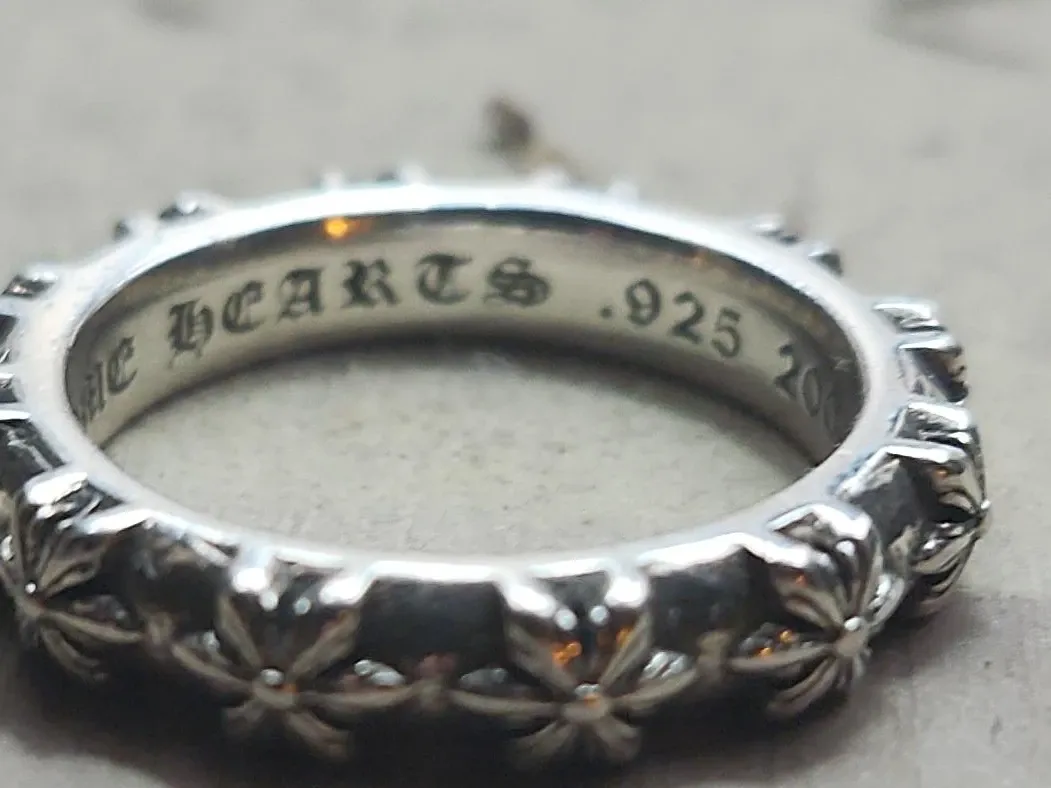 This is a Chrome Hearts ring crafted from .925 sterling silver. It features a repeating floral motif along the band. The inside is stamped with "CHROME HEARTS .925 2002".