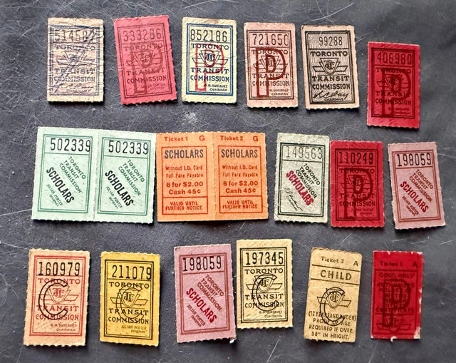 I am offering a collection of vintage Toronto Transit Commission (TTC) tickets. These tickets are a piece of Toronto's history, showcasing different designs and fare values from past eras. These are in used condition. These vintage TTC tickets are more than just paper; they're tiny time capsules that whisk you back to the good old days of Toronto's transit system! They've been waiting patiently to find a new home with someone who appreciates the charm of yesteryear. If this ad is still up, you bet your bottom dollar these tickets are still available! Cash accepted, Cashless payment.