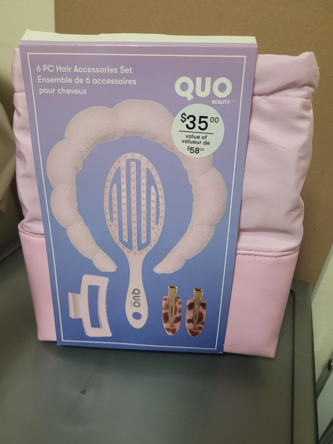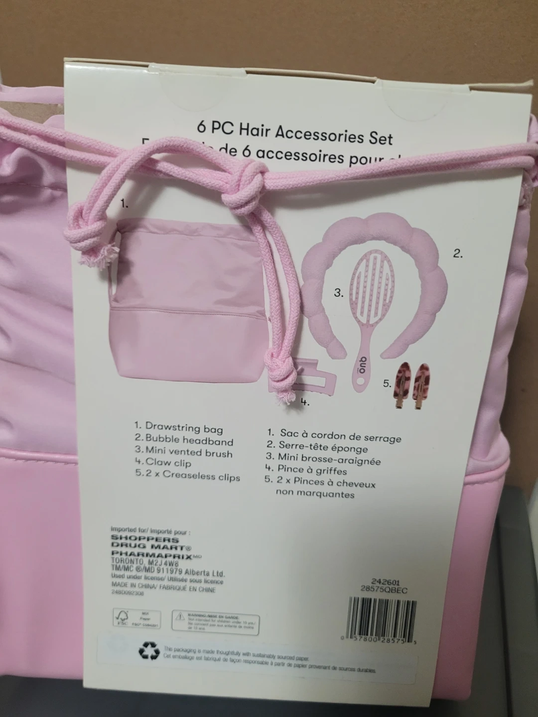 This set includes a pink drawstring bag, bubble headband, mini vented brush, claw clip, and 2 creaseless clips. It's a complete collection for your hair care needs. A handy set for anyone looking to organize or style their hair.