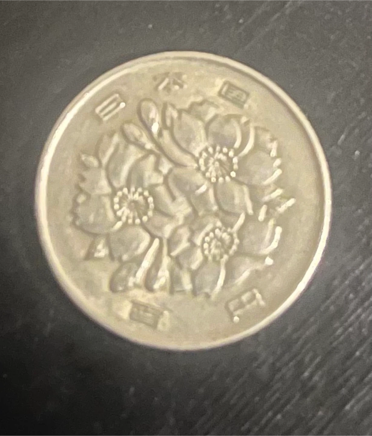 This is a 100 yen coin from Japan. It features a floral design on one side and the numeral "100" on the other. The coin is made of a silver-coloured metal.