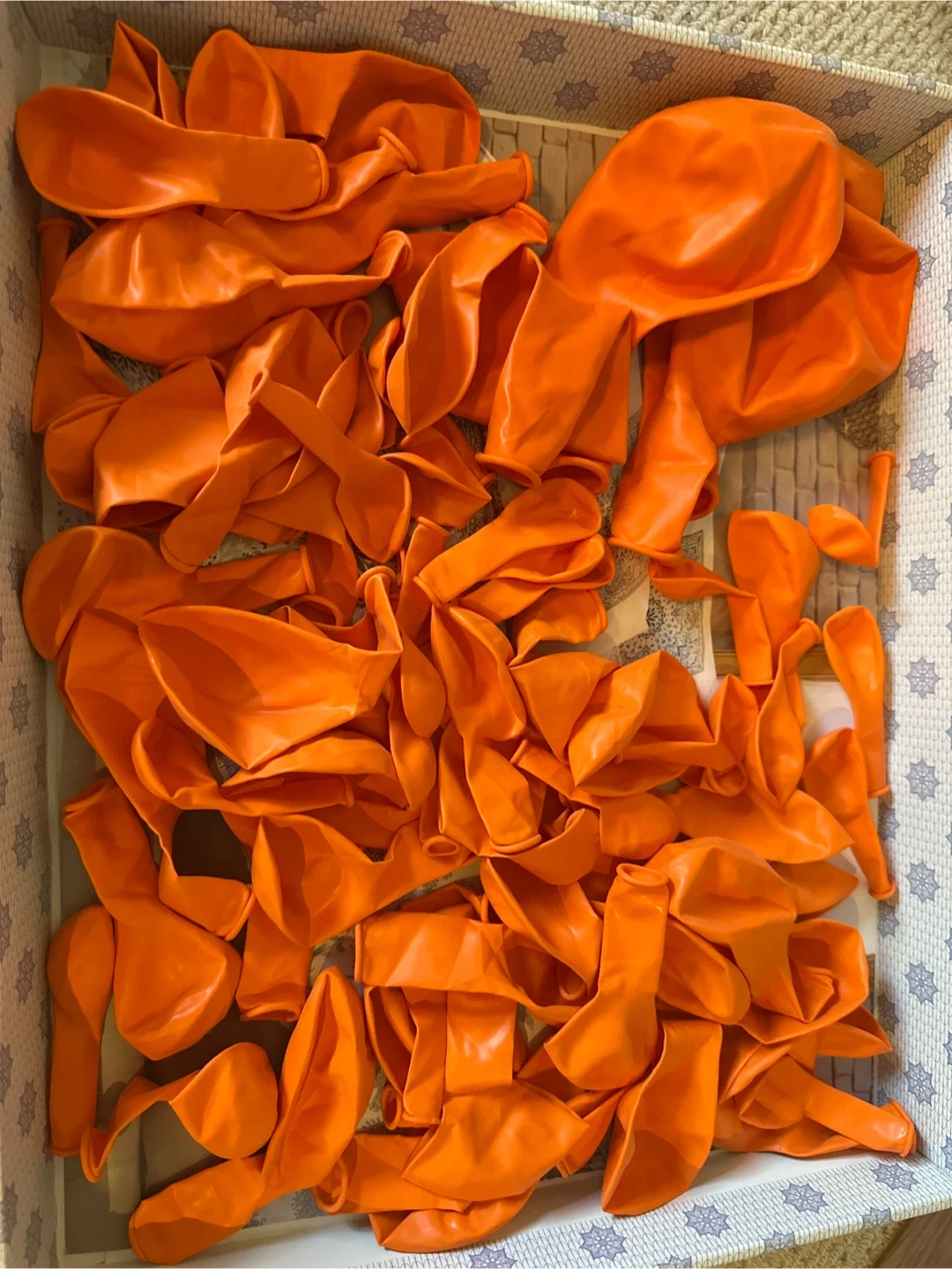 A box of orange balloons, ready to be inflated. They are made of latex. These balloons are great for parties and celebrations!