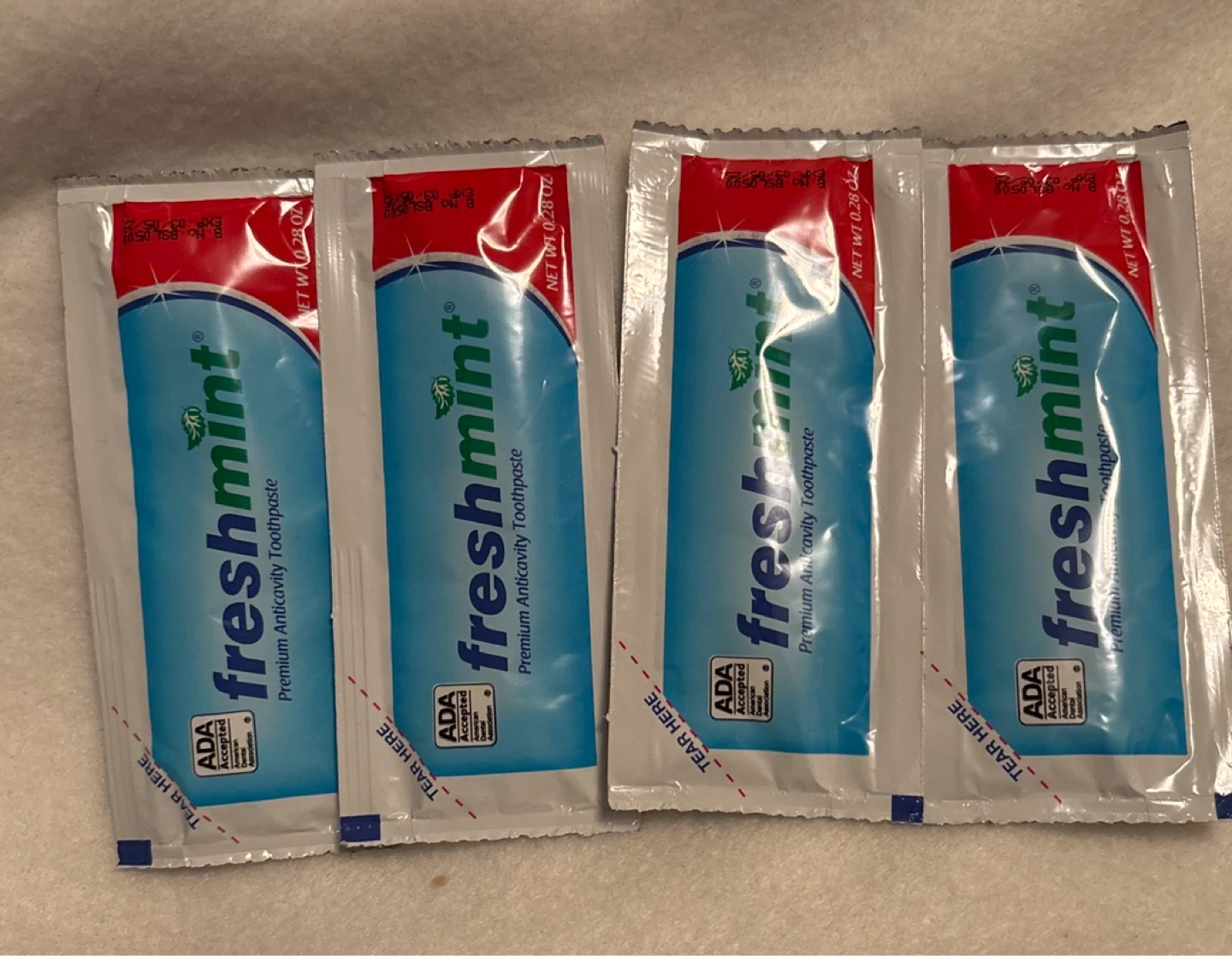 This is a pack of four Freshmint premium anticavity toothpaste samples. Each sachet contains 0.28 oz of toothpaste. It's ADA Accepted for its anticavity properties.